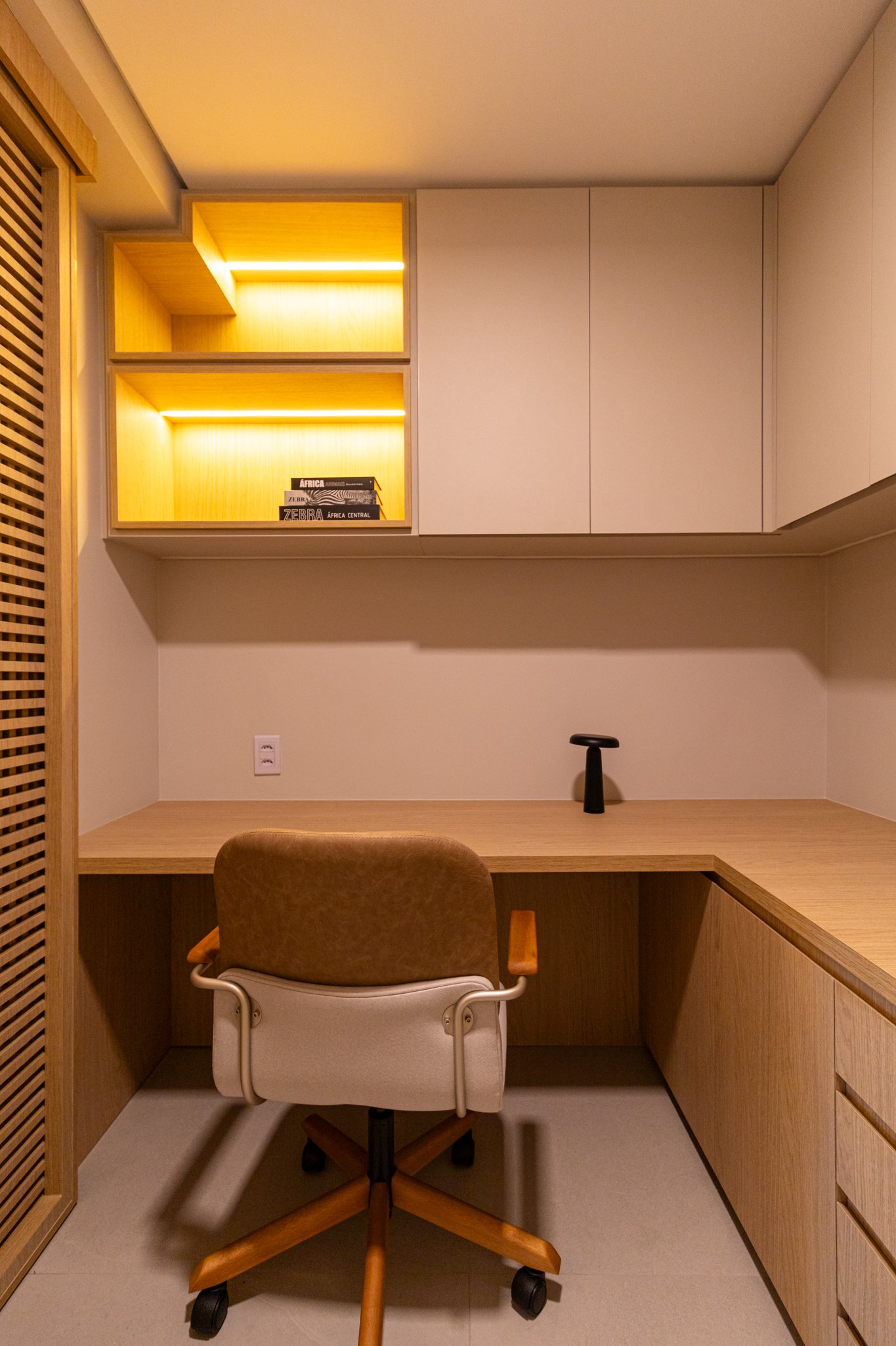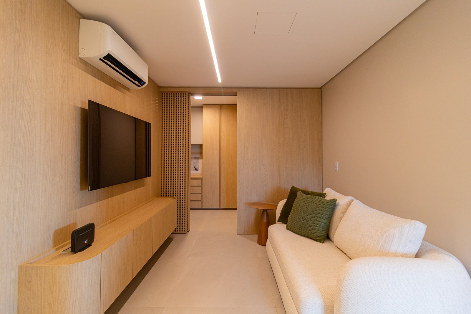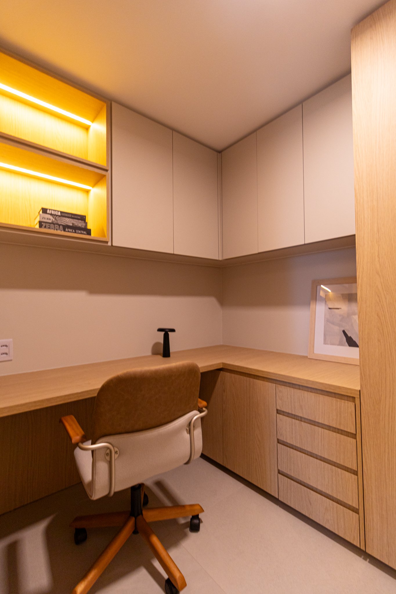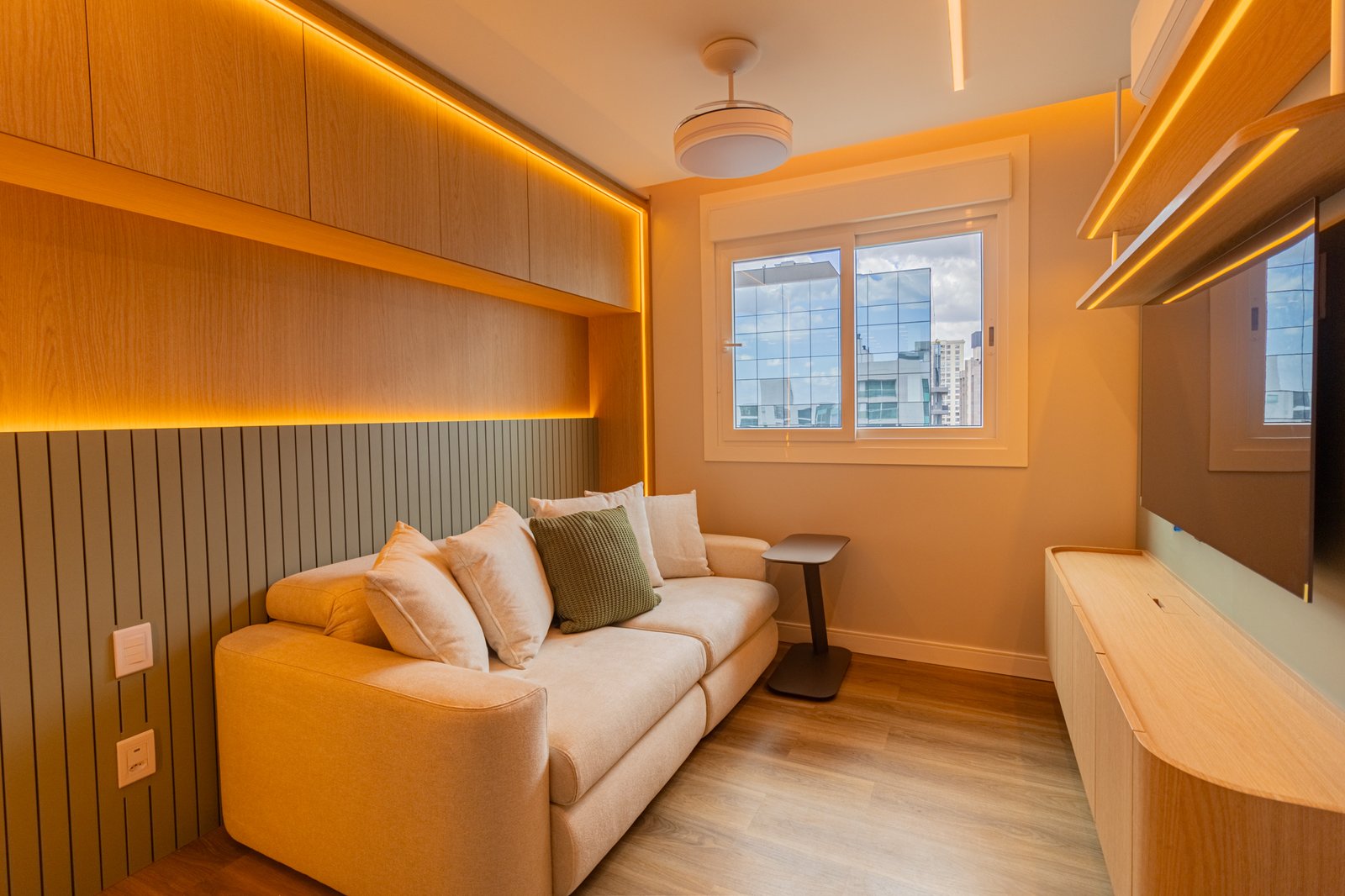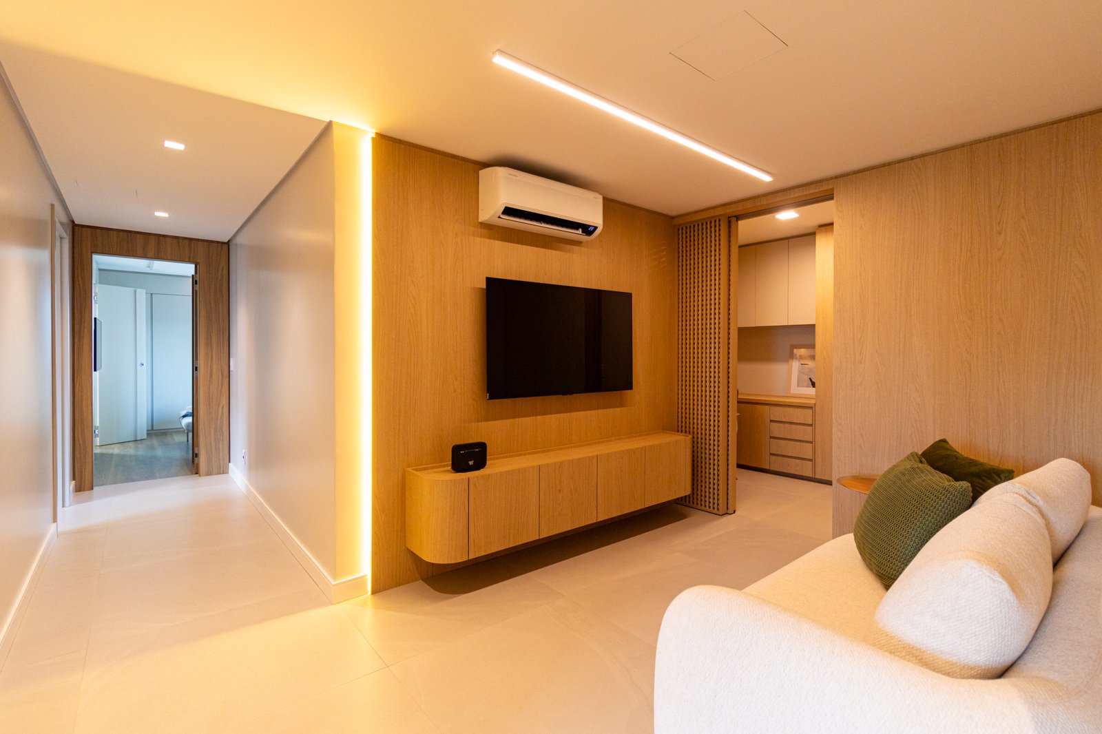 Em seguida, toda a marcenaria sob medida foi planejada para que os espaços fossem otimizados com eficiência. Dessa forma, a fiação foi completamente escondida, enquanto a organização e a praticidade no dia a dia foram significativamente ampliadas, contribuindo para um ambiente mais limpo e funcional.