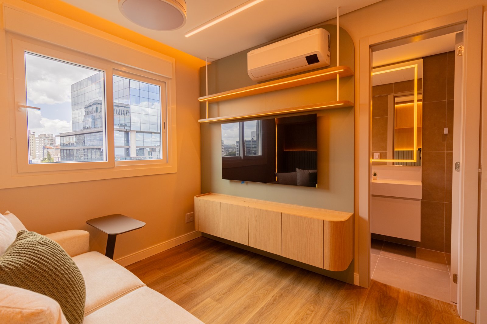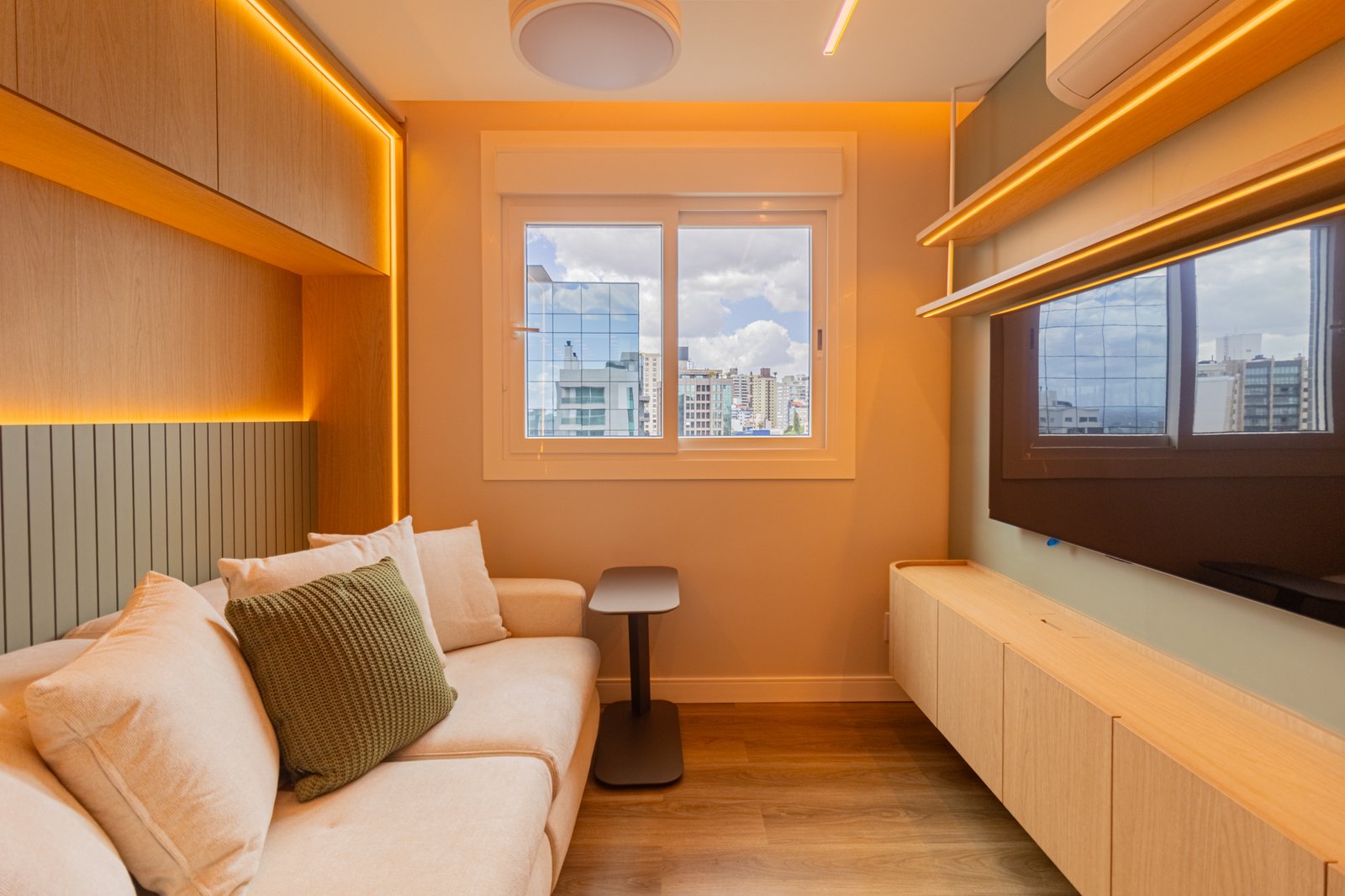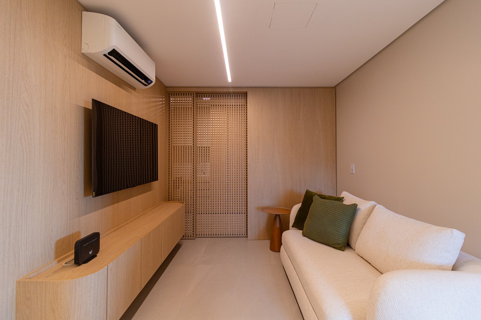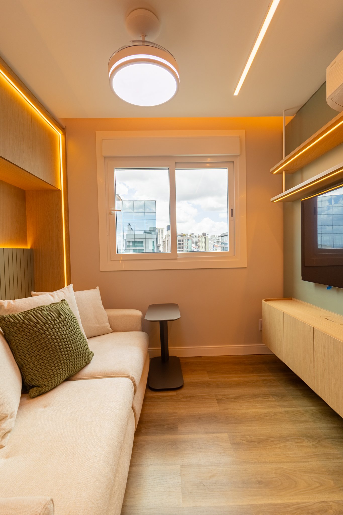 Em seguida, toda a marcenaria sob medida foi planejada para que os espaços fossem otimizados com eficiência. Dessa forma, a fiação foi completamente escondida, enquanto a organização e a praticidade no dia a dia foram significativamente ampliadas, contribuindo para um ambiente mais limpo e funcional.