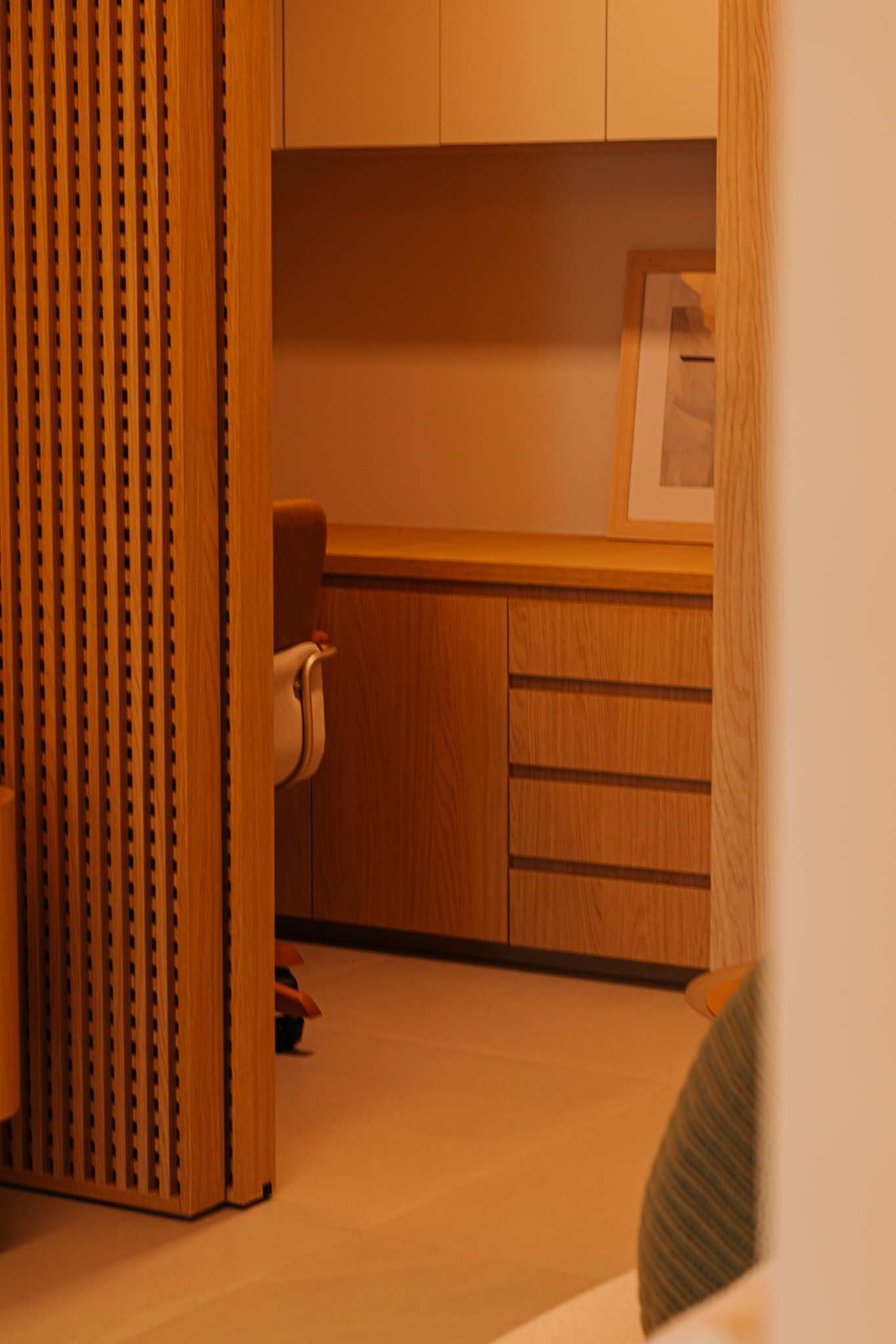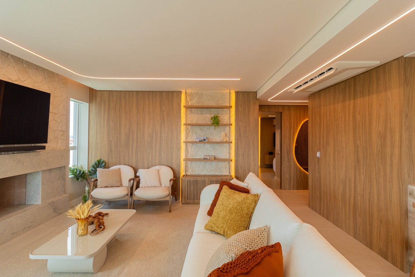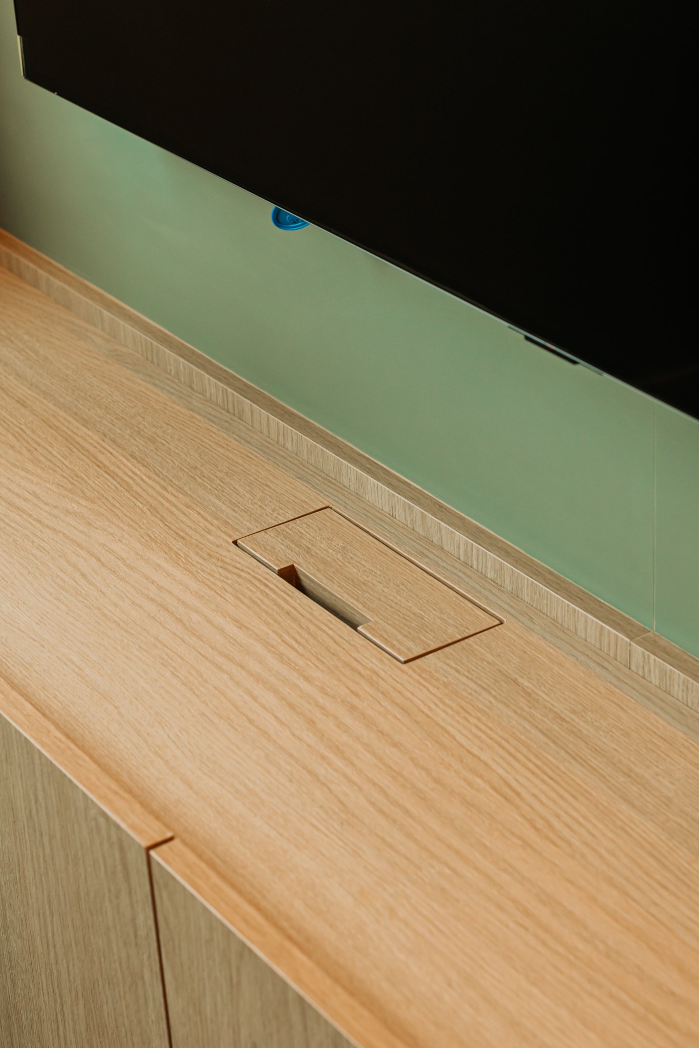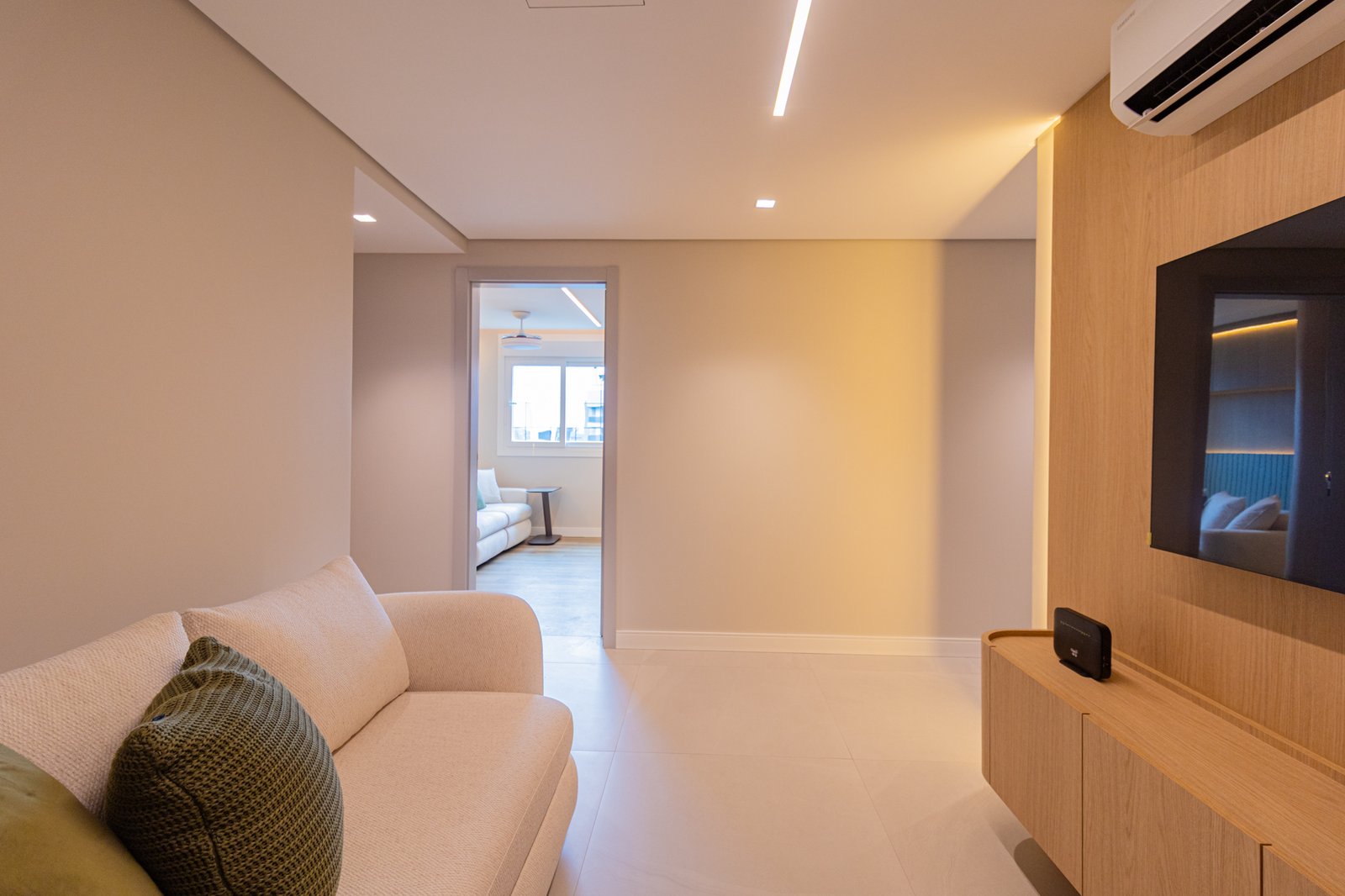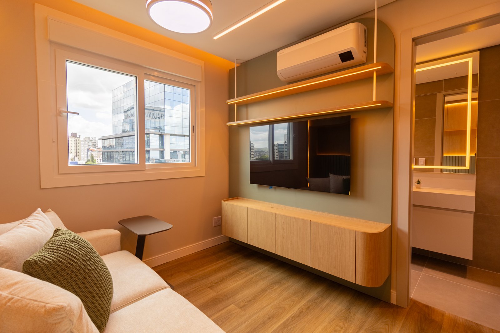 Em seguida, toda a marcenaria sob medida foi planejada para que os espaços fossem otimizados com eficiência. Dessa forma, a fiação foi completamente escondida, enquanto a organização e a praticidade no dia a dia foram significativamente ampliadas, contribuindo para um ambiente mais limpo e funcional.