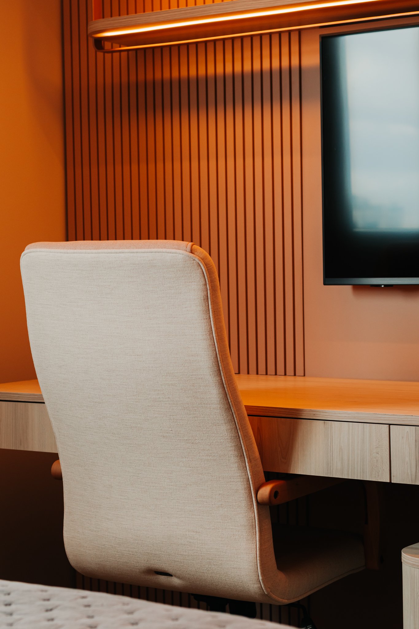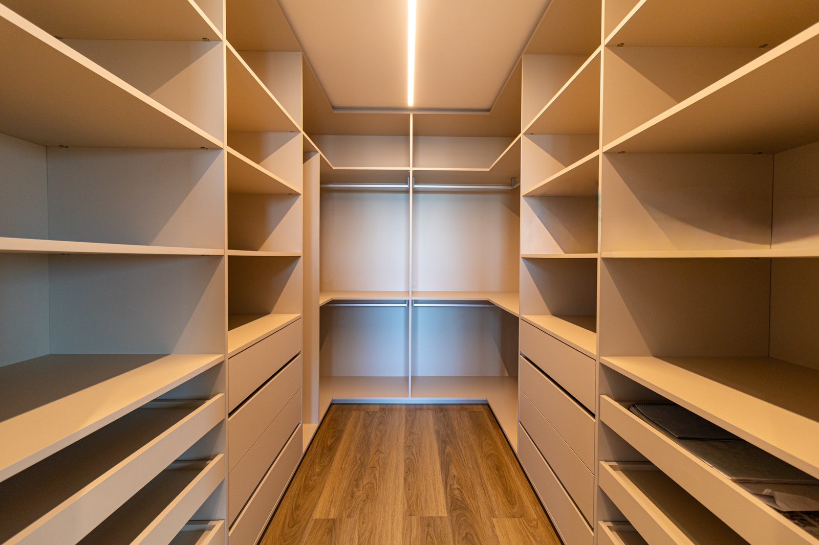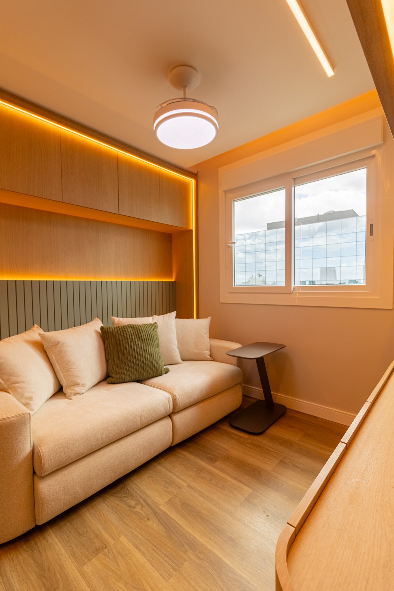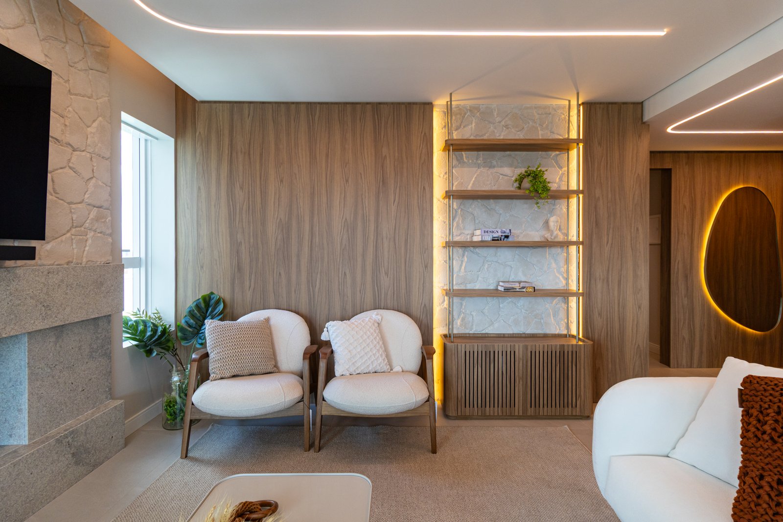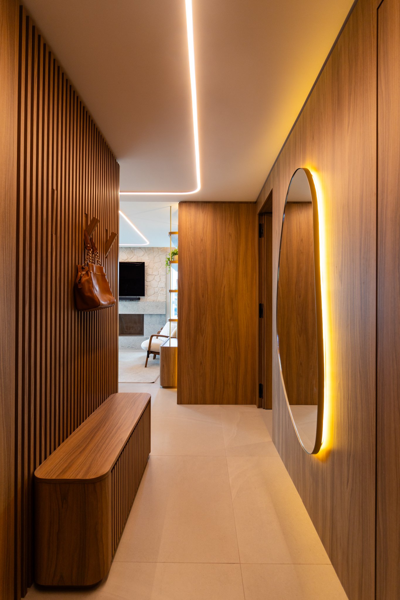 Em seguida, toda a marcenaria sob medida foi planejada para que os espaços fossem otimizados com eficiência. Dessa forma, a fiação foi completamente escondida, enquanto a organização e a praticidade no dia a dia foram significativamente ampliadas, contribuindo para um ambiente mais limpo e funcional.