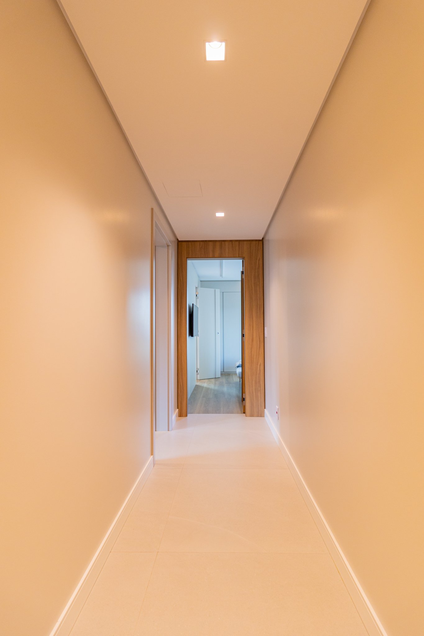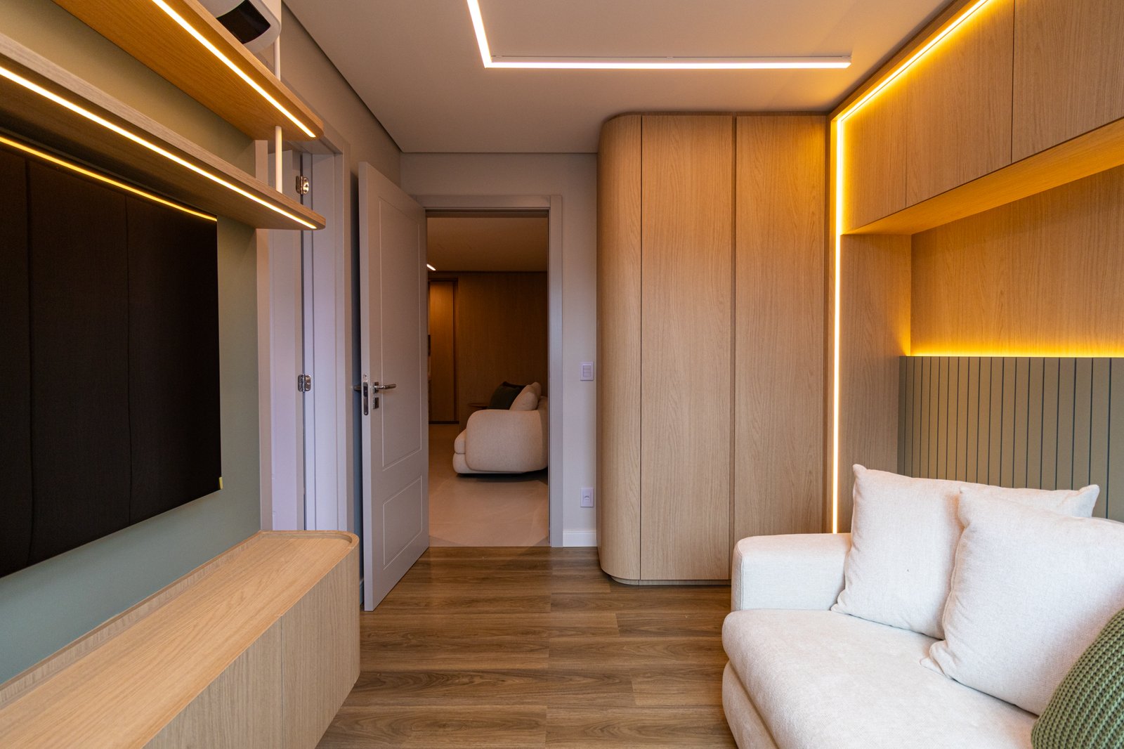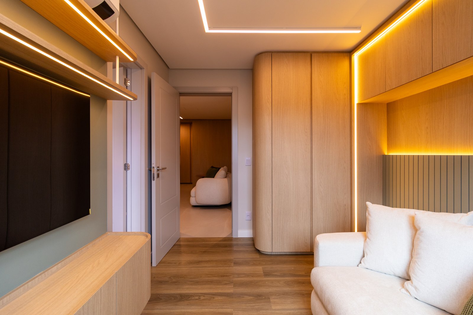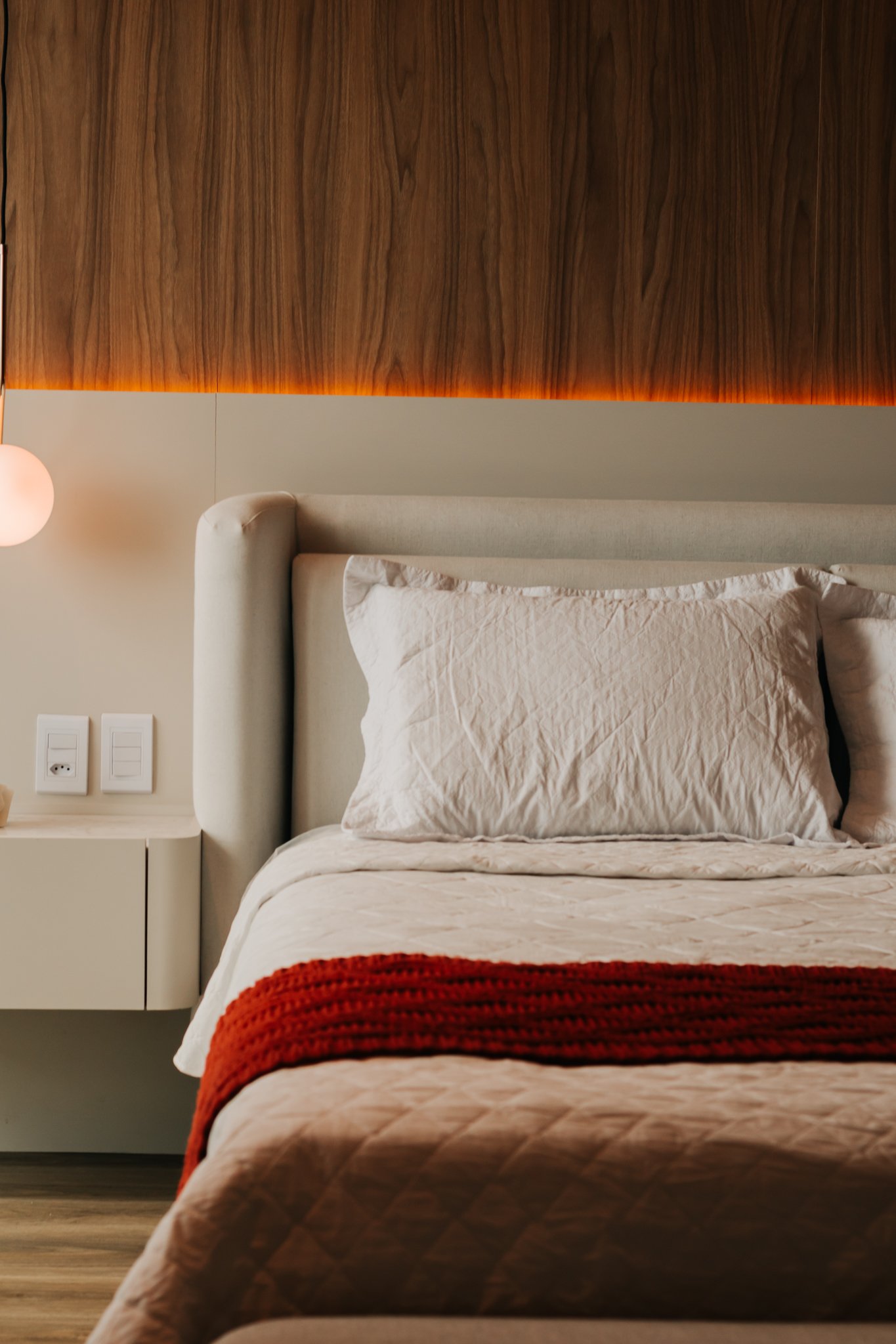 Nos dormitórios, por sua vez, foi aplicado piso vinílico, escolhido por proporcionar maior conforto térmico e acústico, especialmente ao caminhar descalço, além de oferecer uma sensação mais acolhedora quando comparado ao porcelanato.