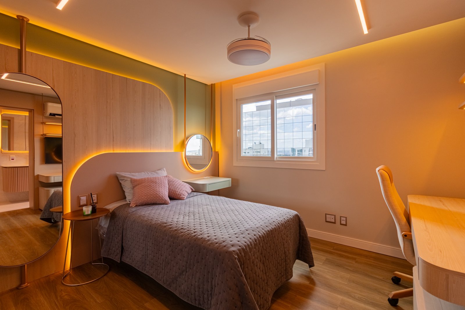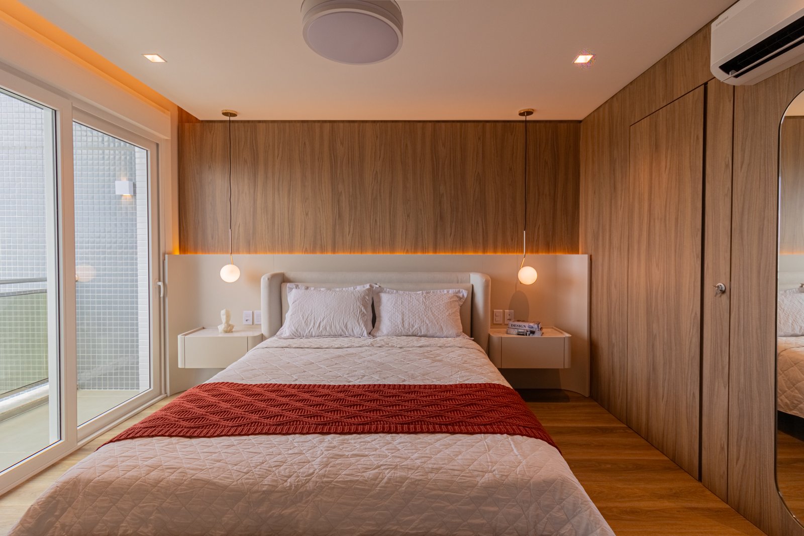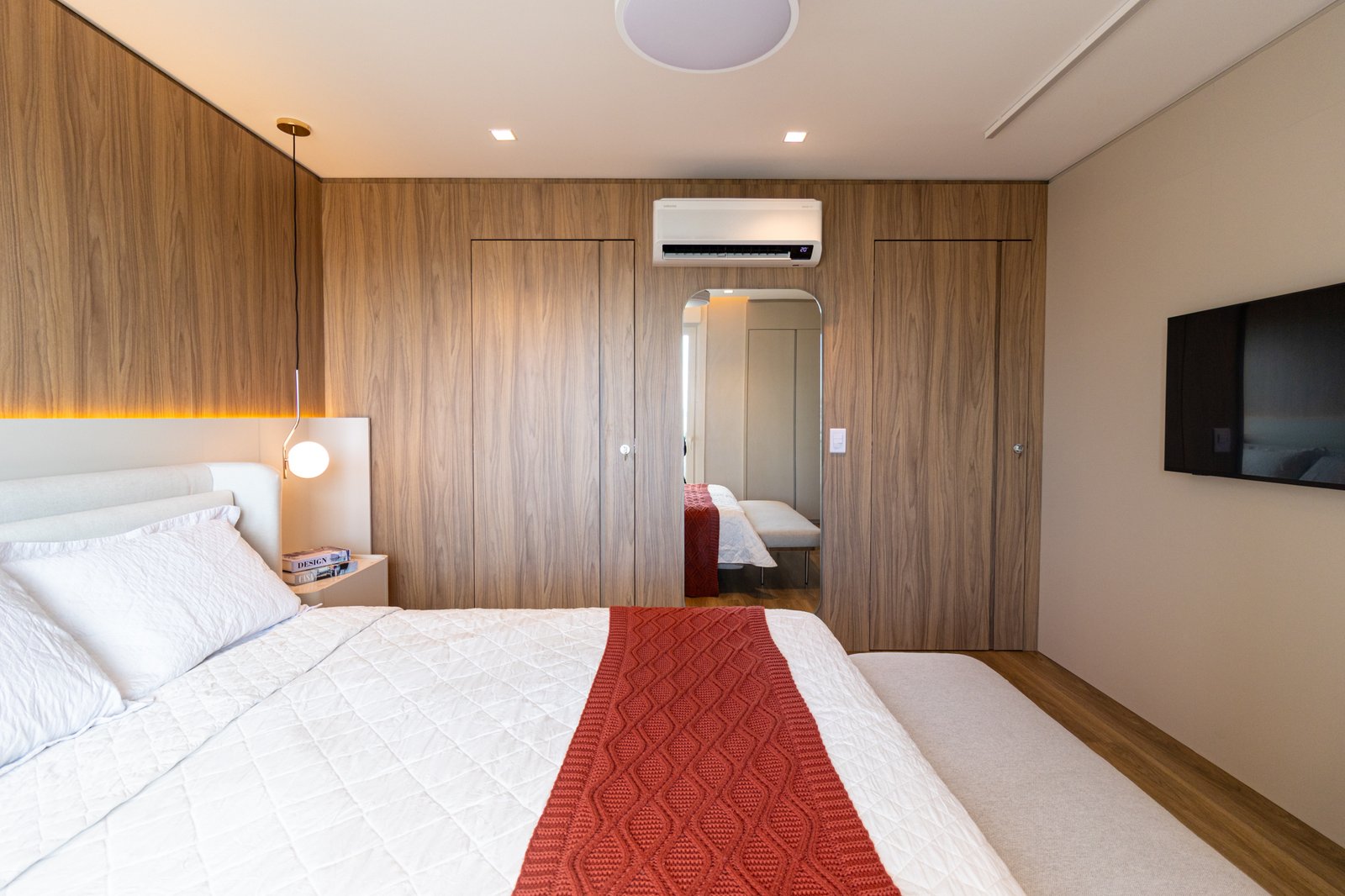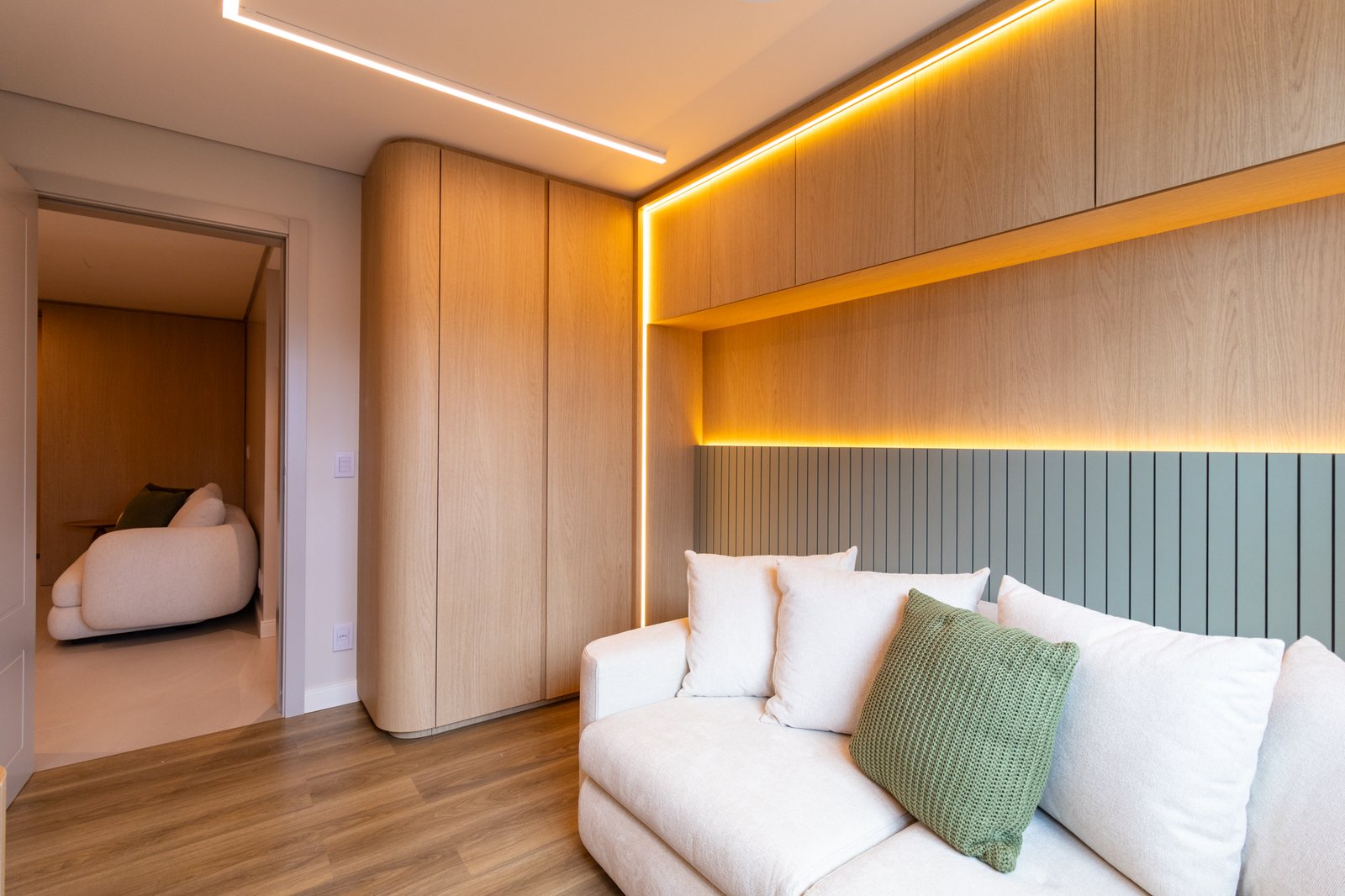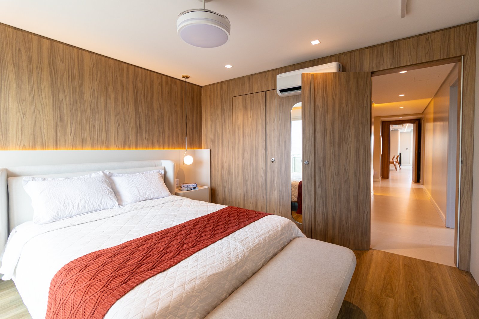 Nos dormitórios, por sua vez, foi aplicado piso vinílico, escolhido por proporcionar maior conforto térmico e acústico, especialmente ao caminhar descalço, além de oferecer uma sensação mais acolhedora quando comparado ao porcelanato.