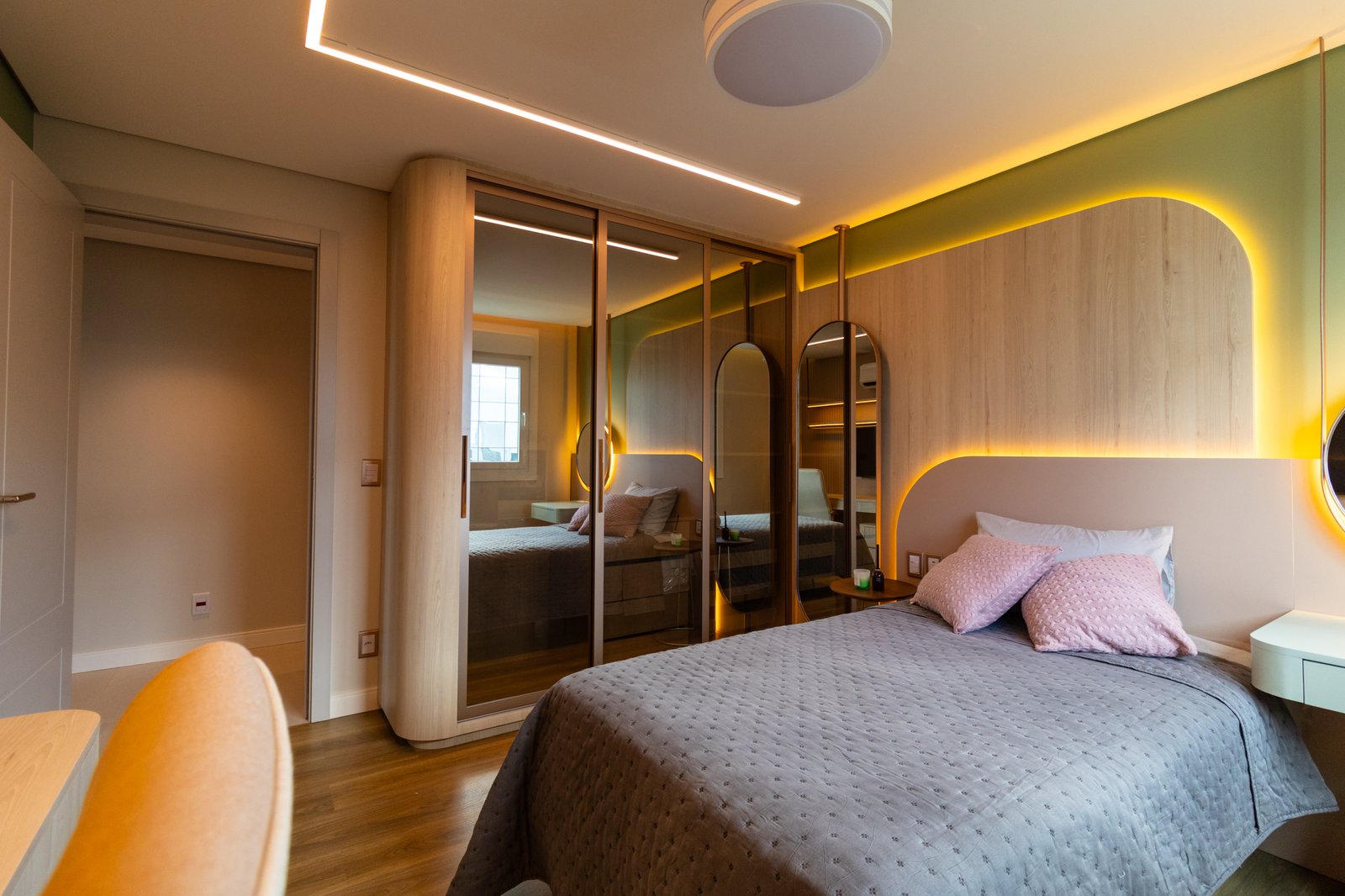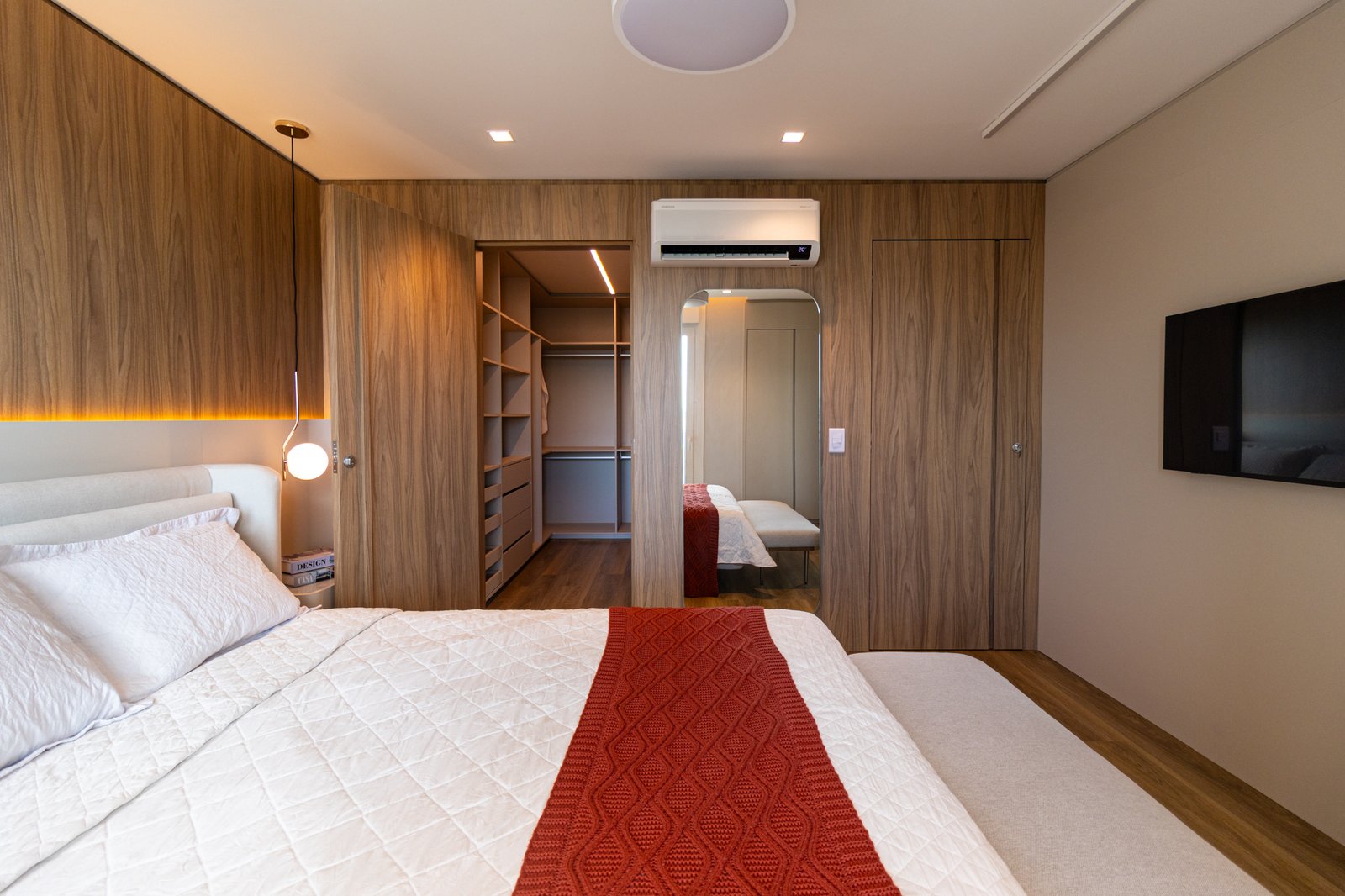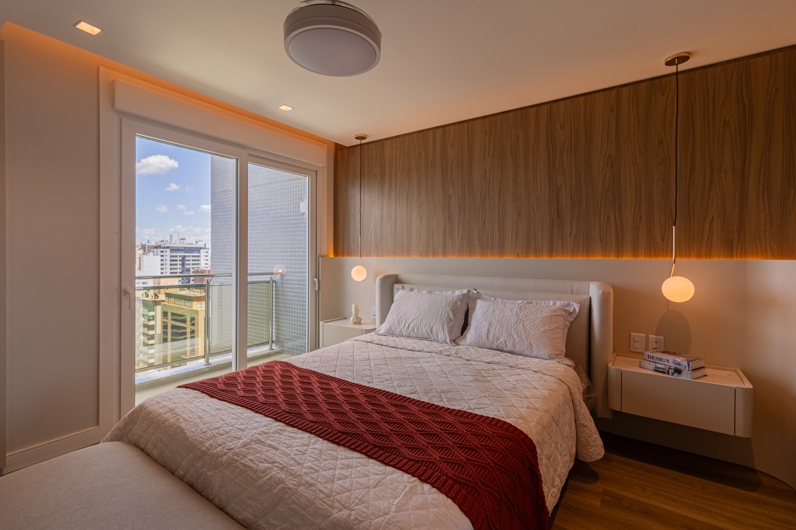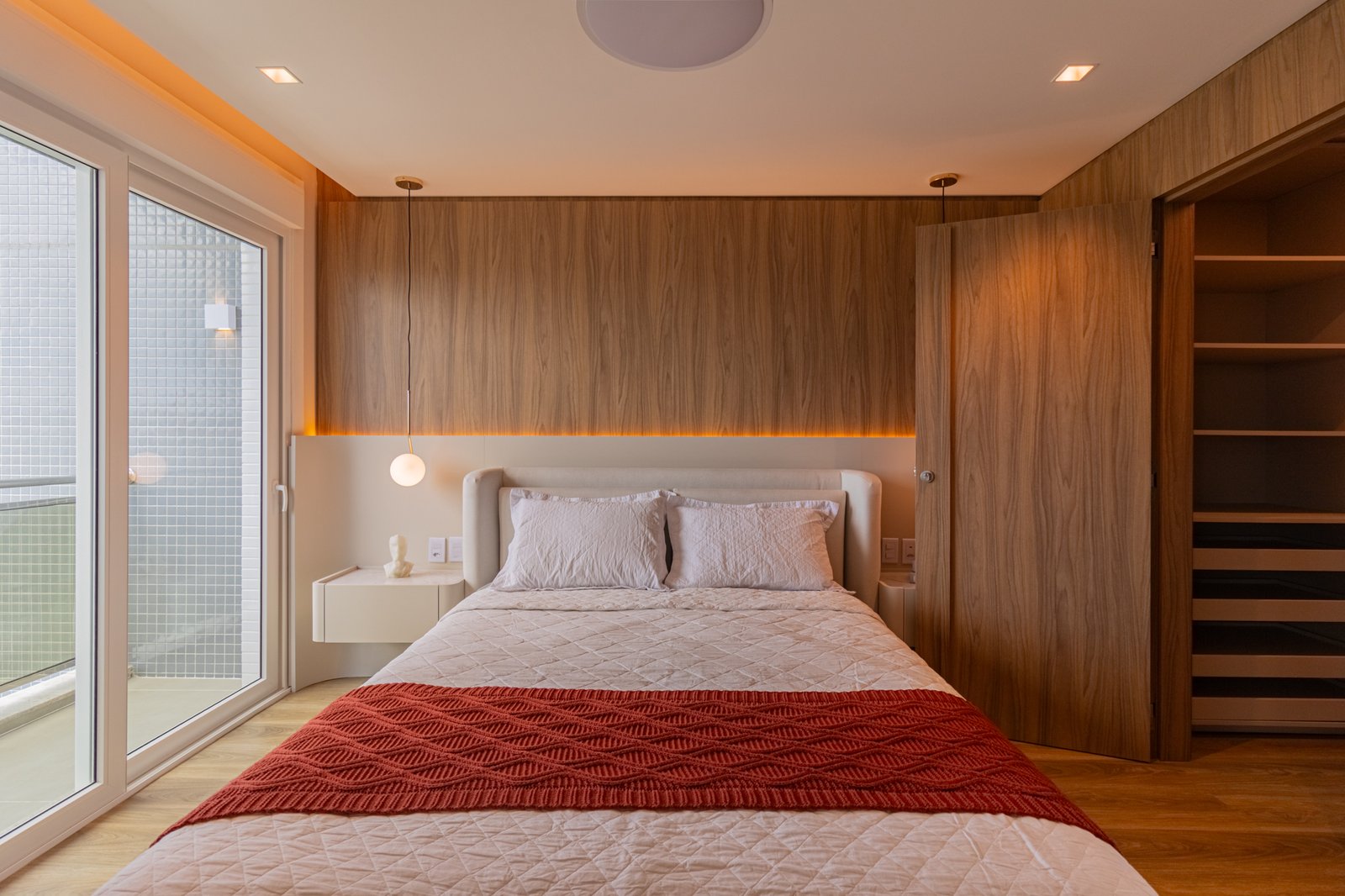 Nos dormitórios, por sua vez, foi aplicado piso vinílico, escolhido por proporcionar maior conforto térmico e acústico, especialmente ao caminhar descalço, além de oferecer uma sensação mais acolhedora quando comparado ao porcelanato.