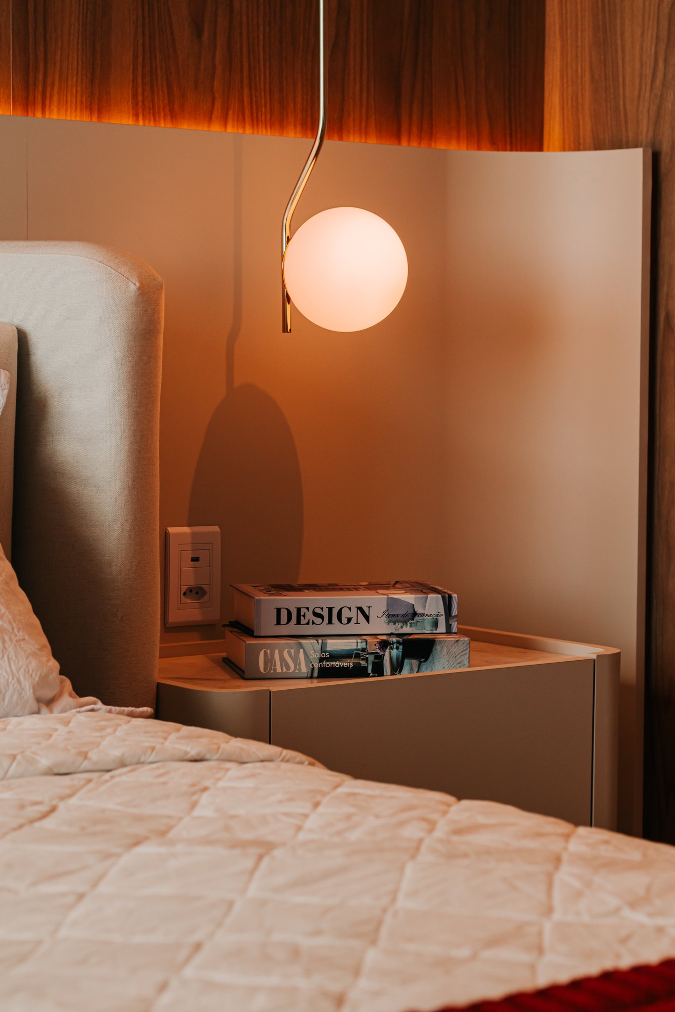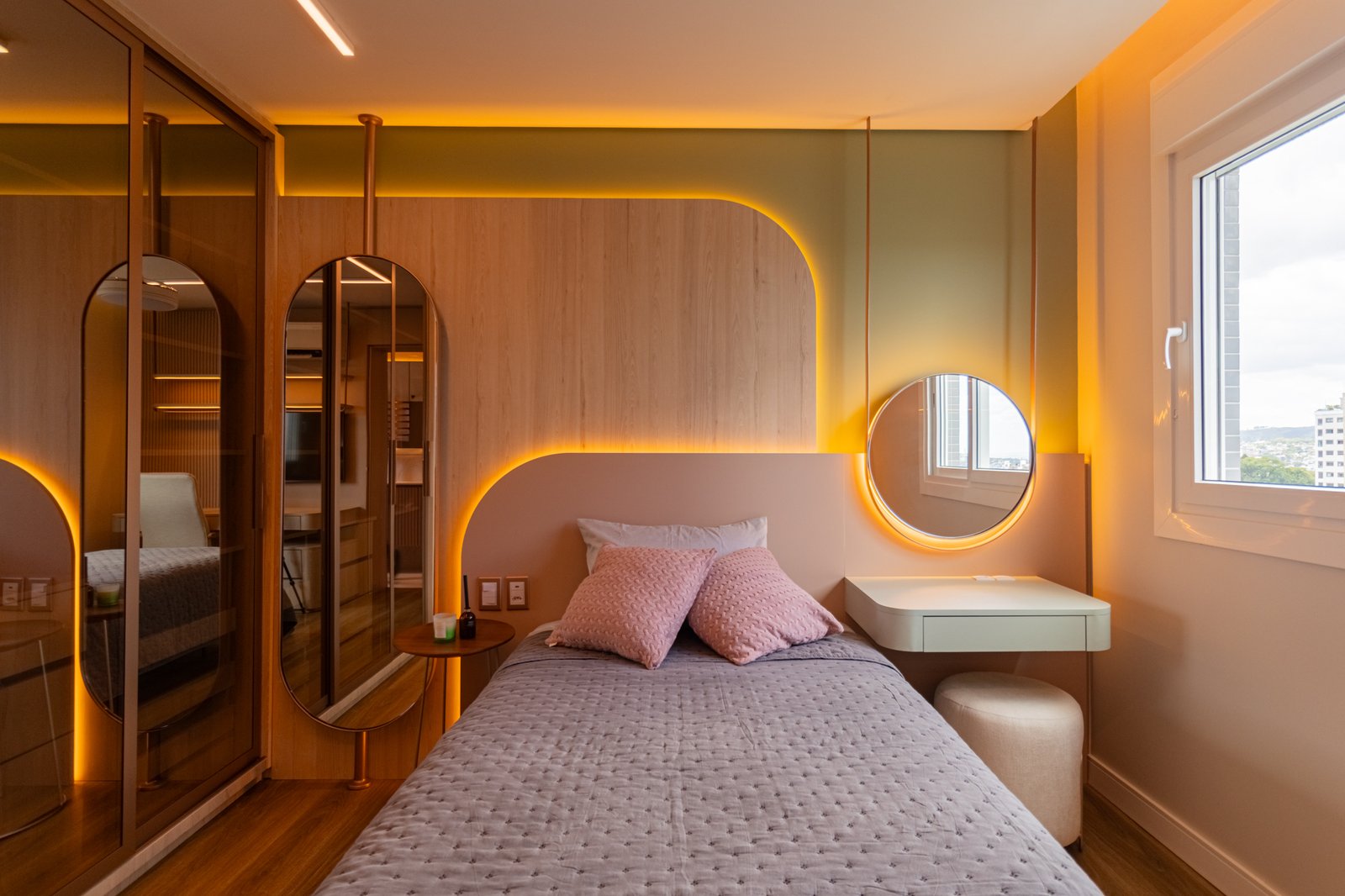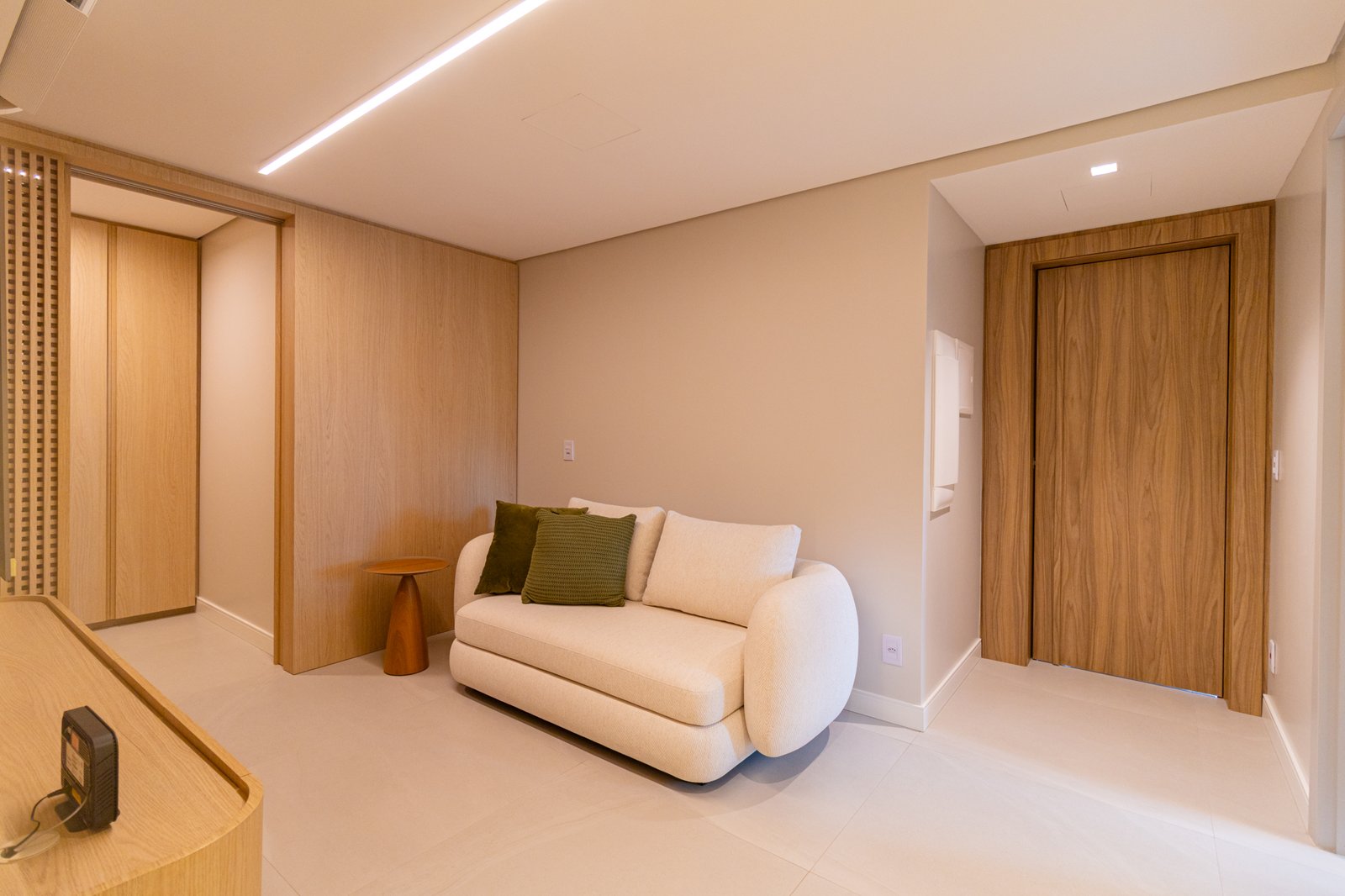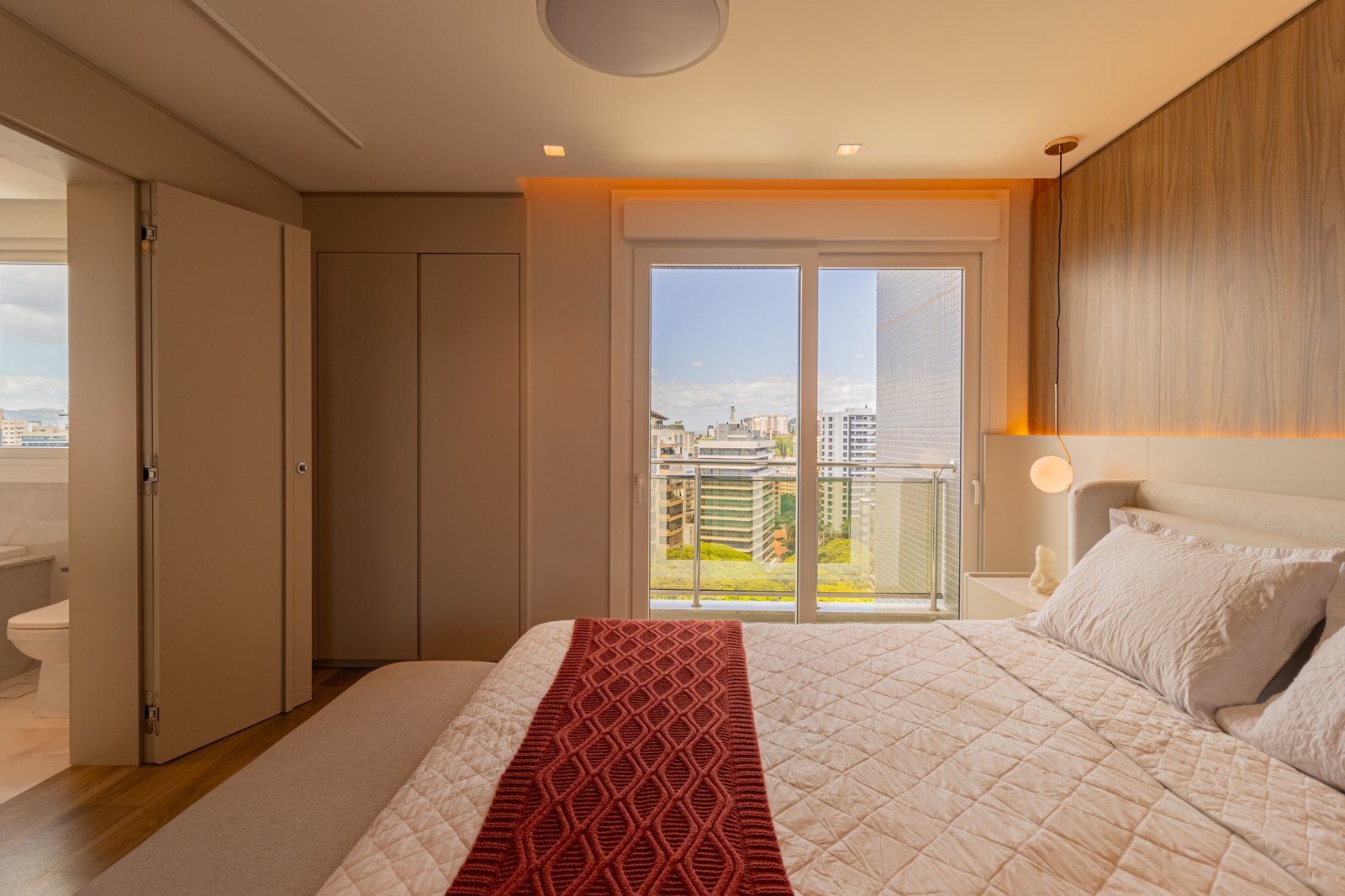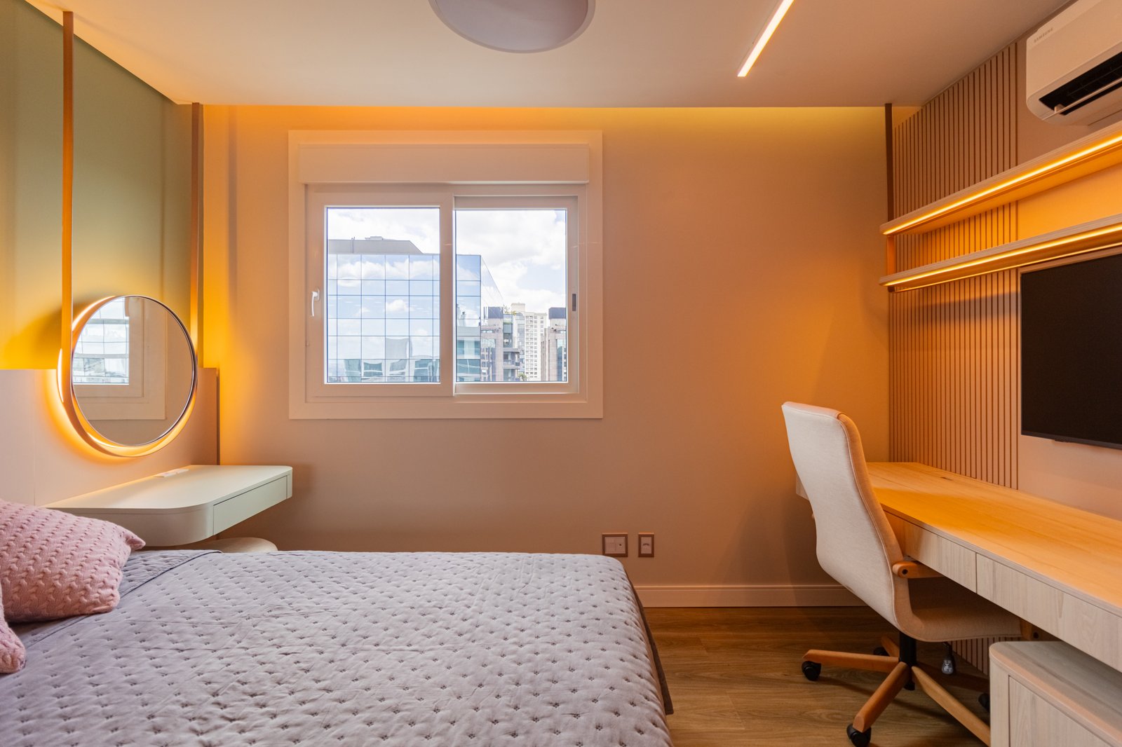 Nos dormitórios, por sua vez, foi aplicado piso vinílico, escolhido por proporcionar maior conforto térmico e acústico, especialmente ao caminhar descalço, além de oferecer uma sensação mais acolhedora quando comparado ao porcelanato.