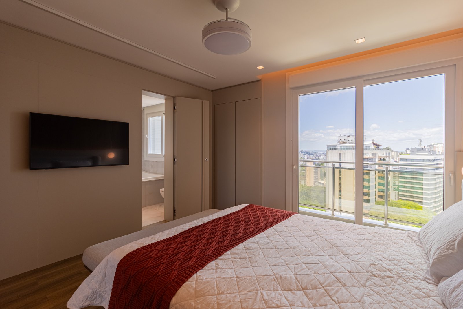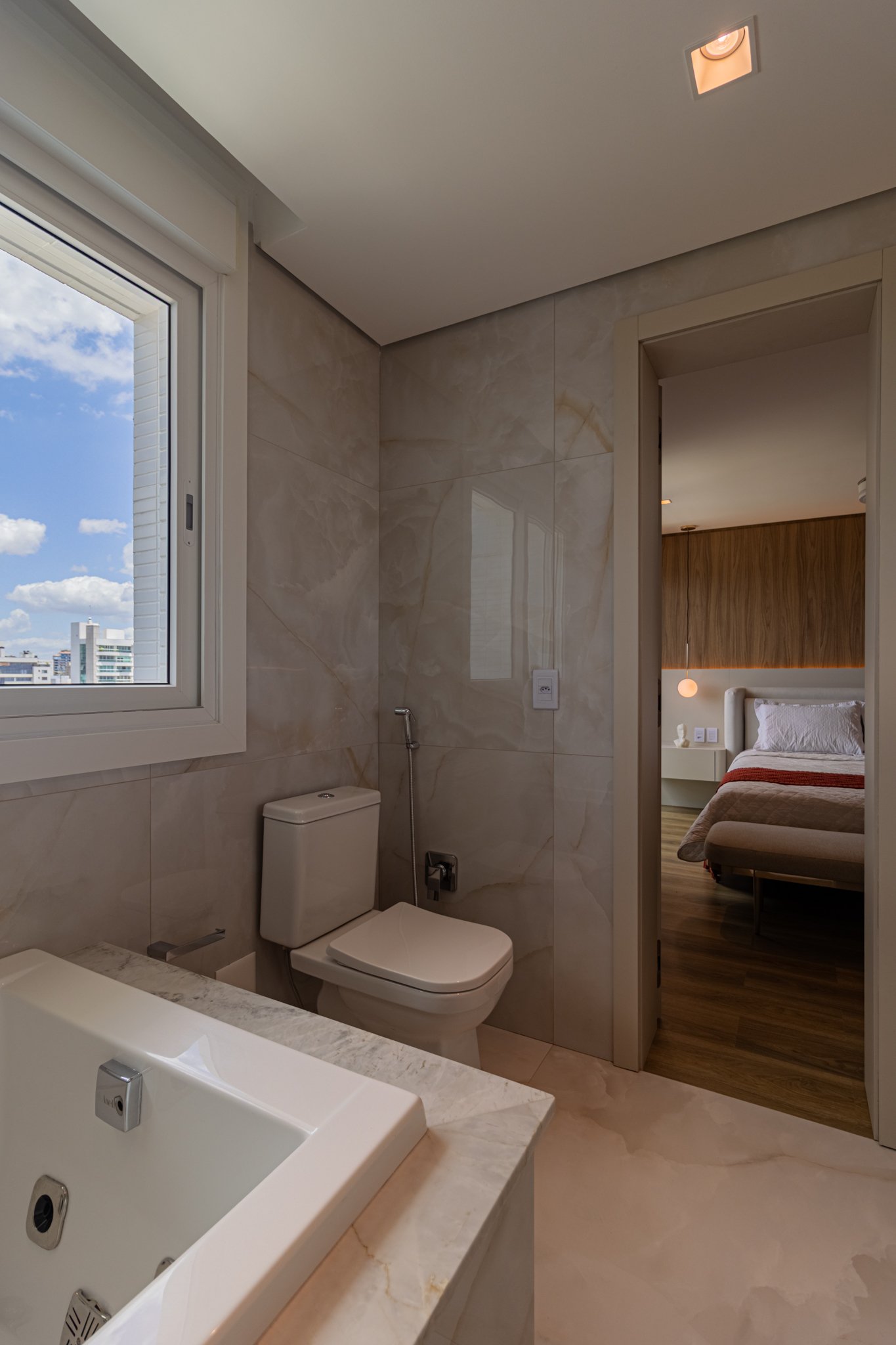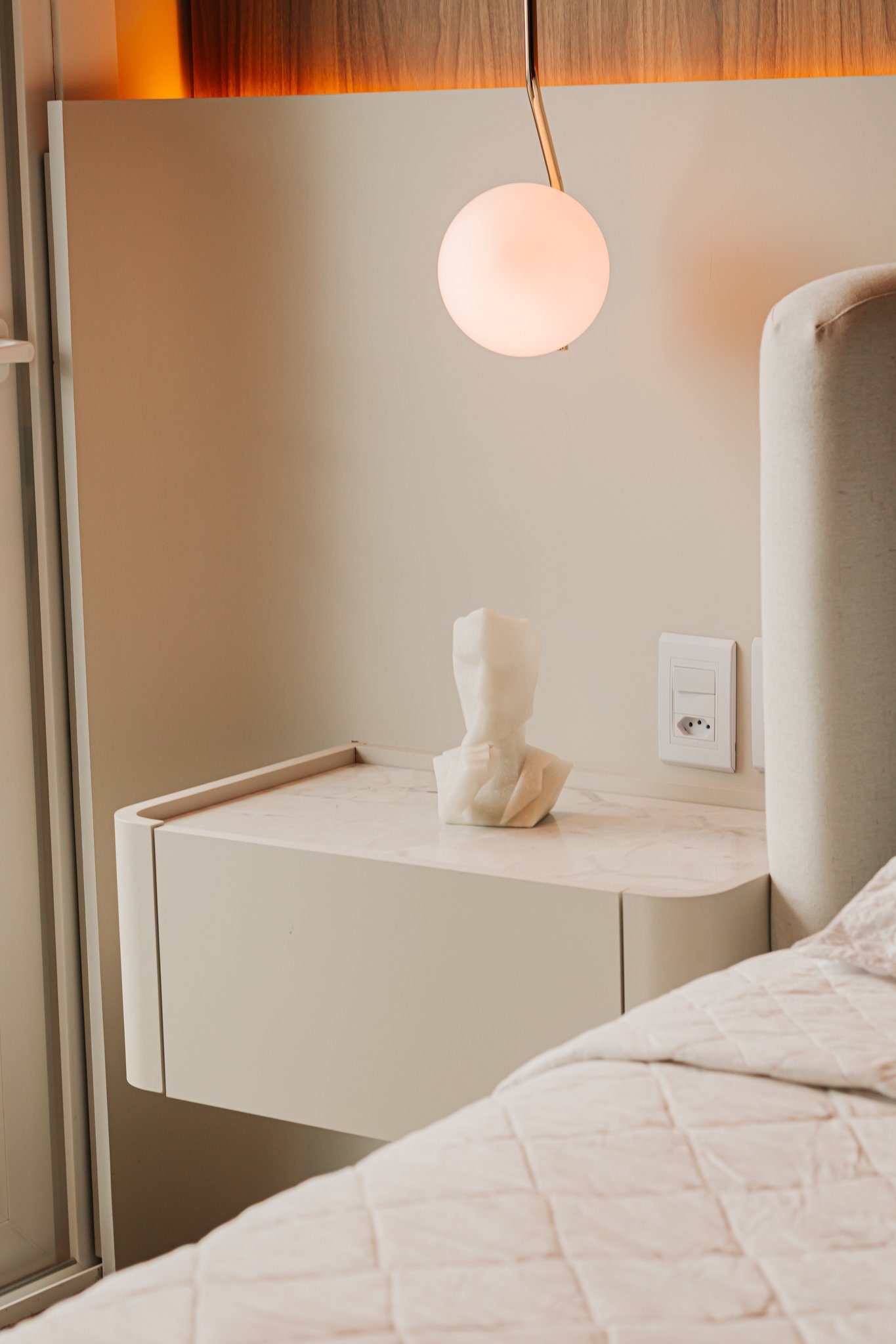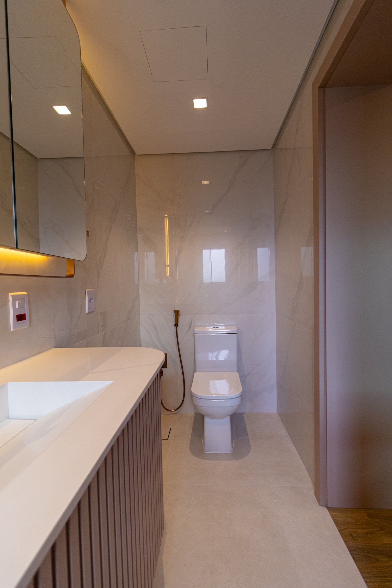 Nos dormitórios, por sua vez, foi aplicado piso vinílico, escolhido por proporcionar maior conforto térmico e acústico, especialmente ao caminhar descalço, além de oferecer uma sensação mais acolhedora quando comparado ao porcelanato.