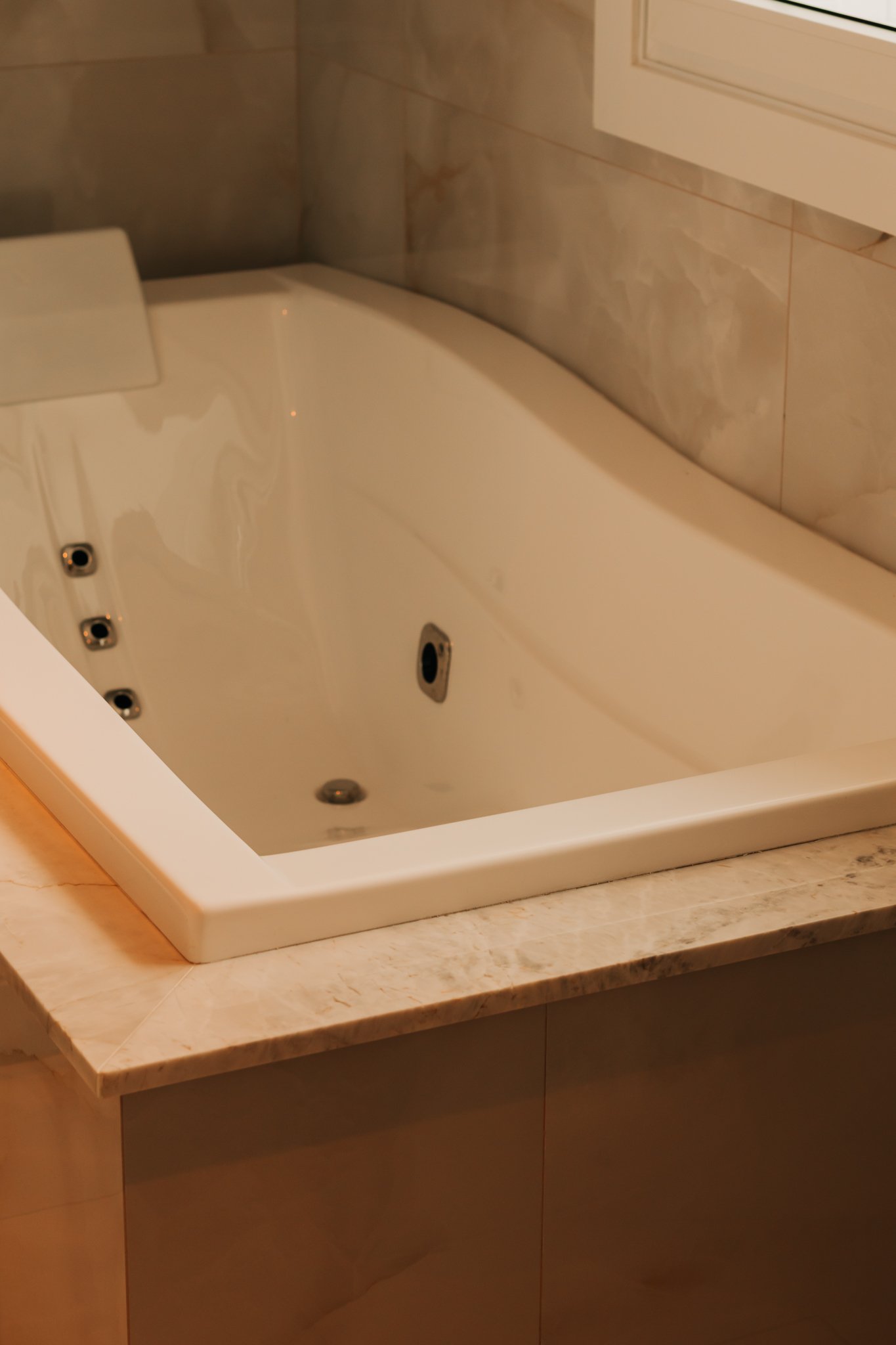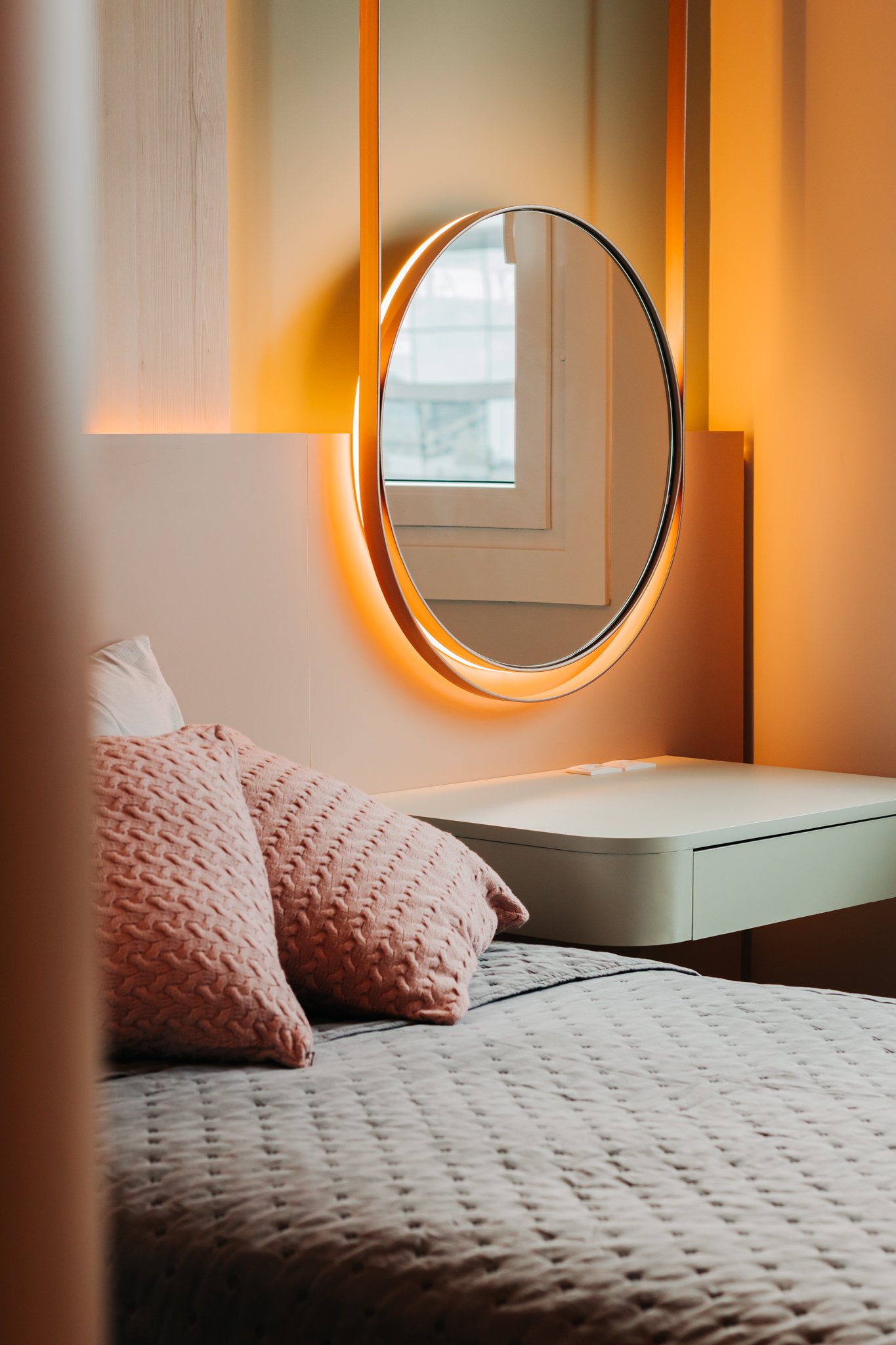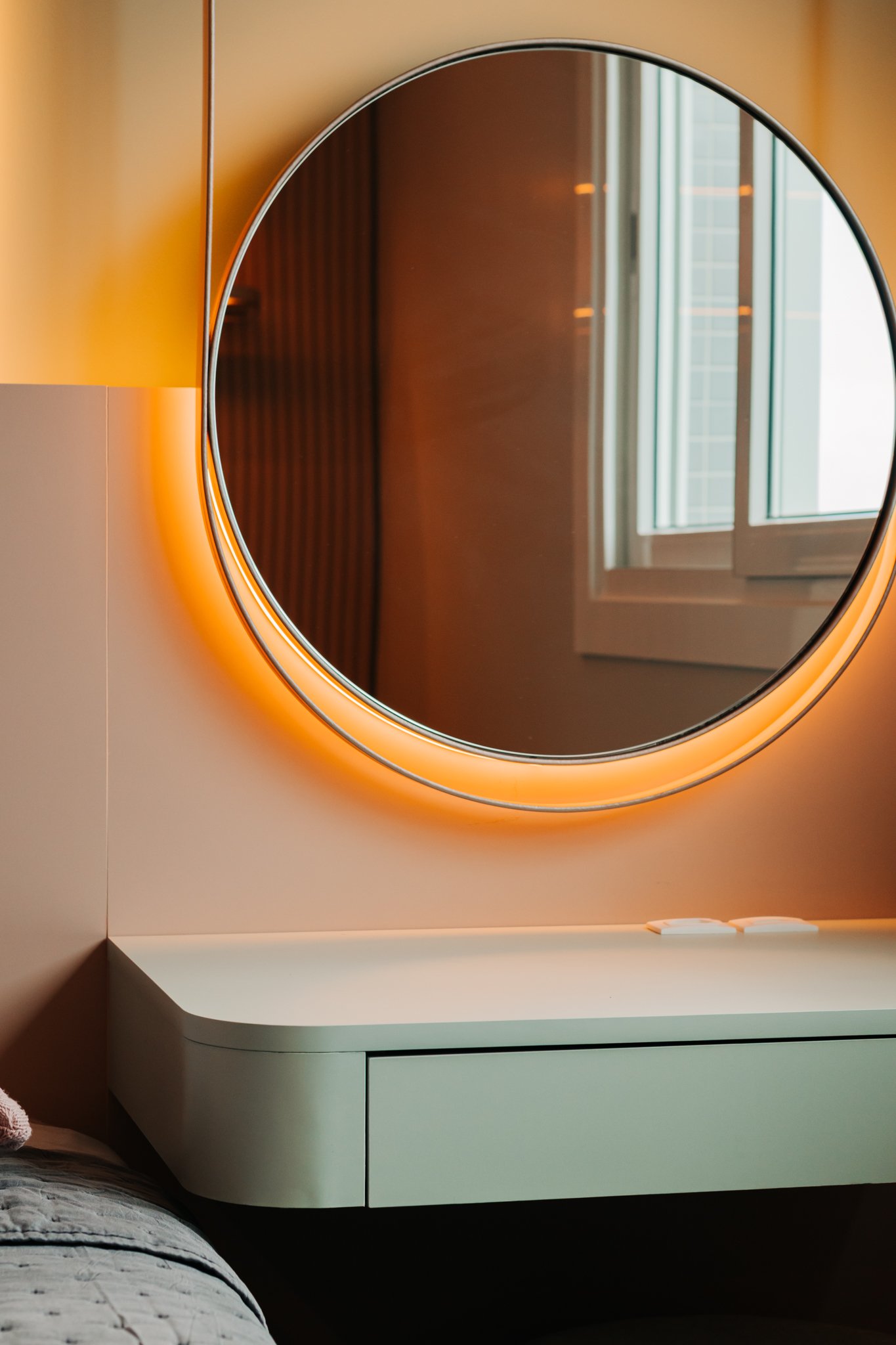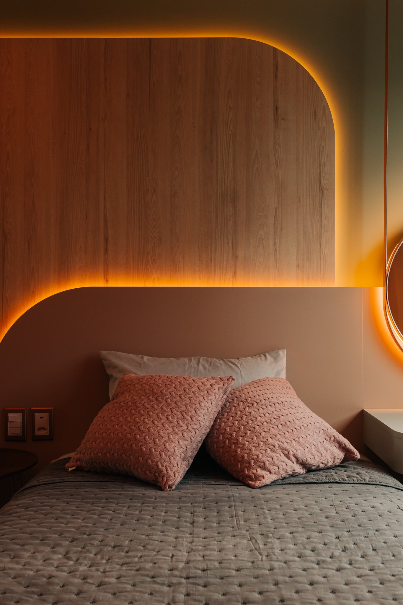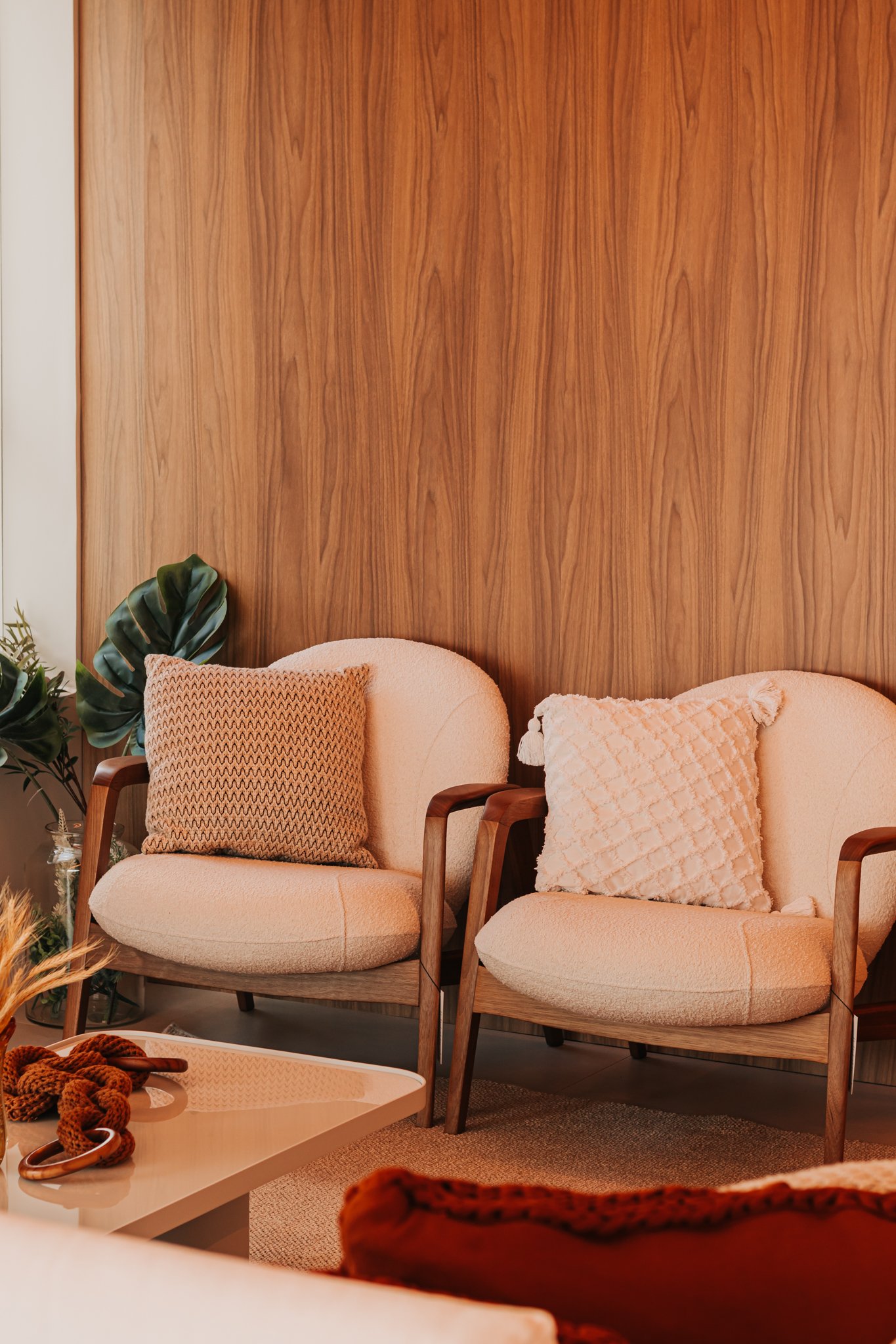 Nos dormitórios, por sua vez, foi aplicado piso vinílico, escolhido por proporcionar maior conforto térmico e acústico, especialmente ao caminhar descalço, além de oferecer uma sensação mais acolhedora quando comparado ao porcelanato.