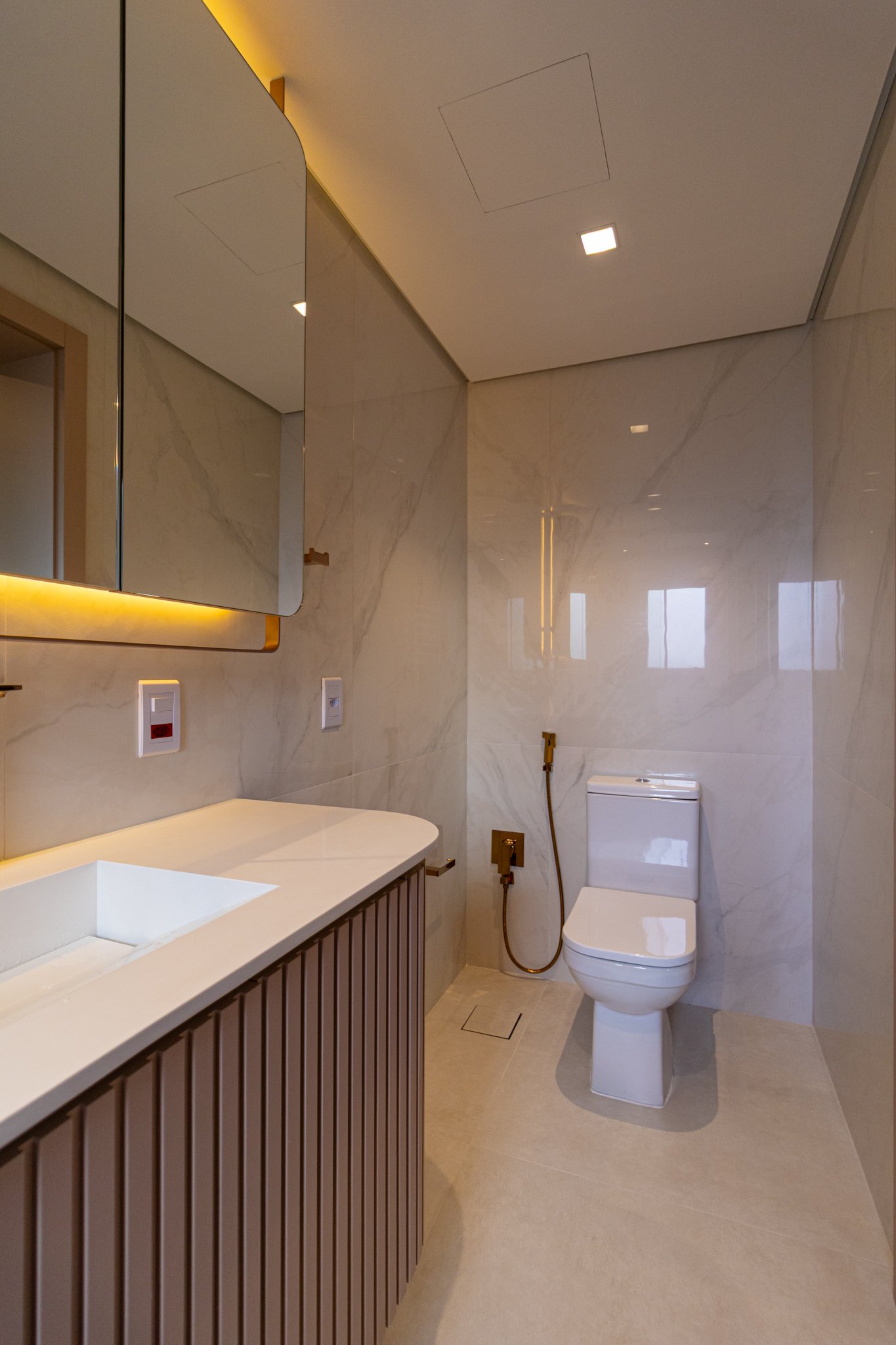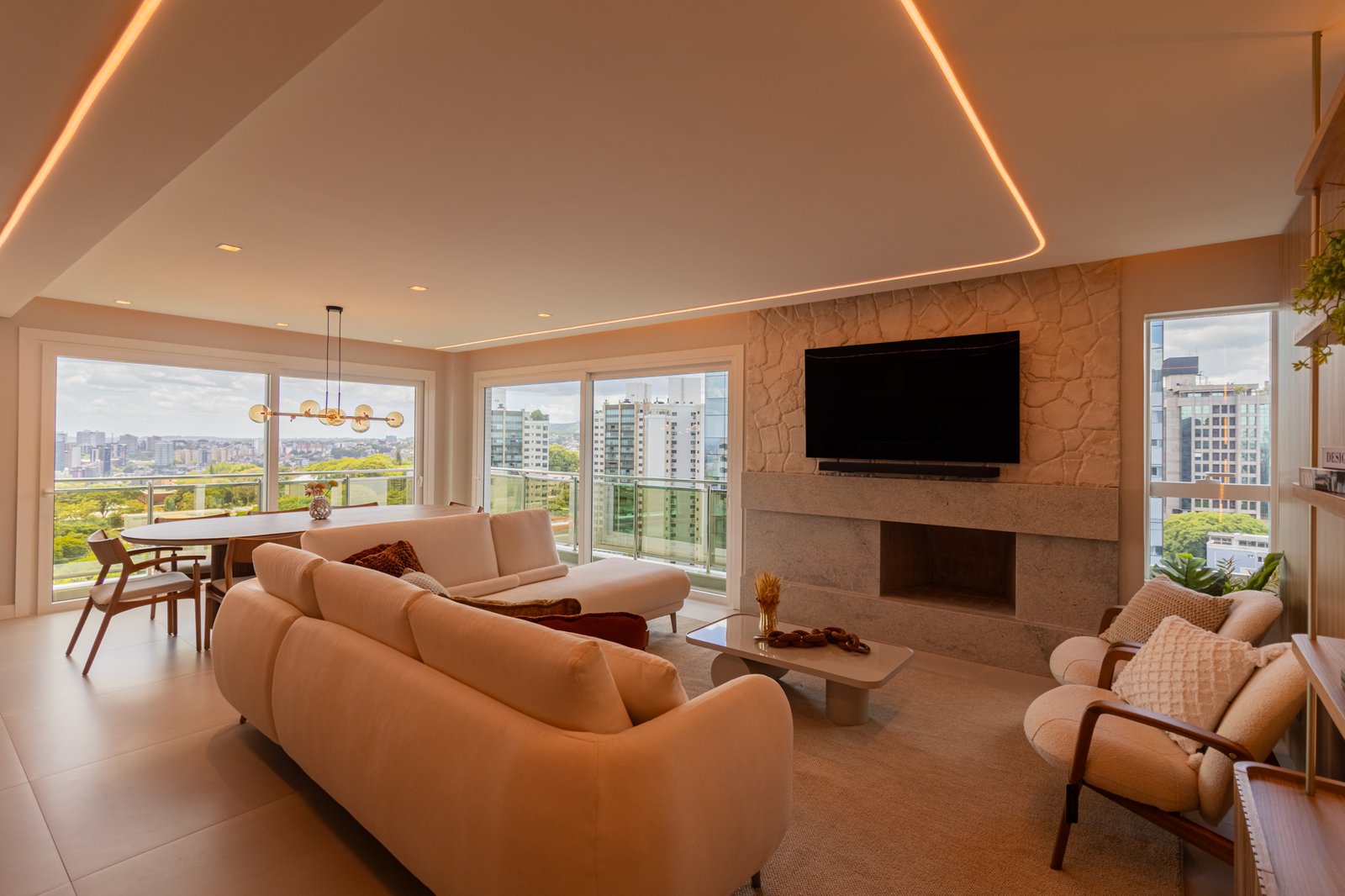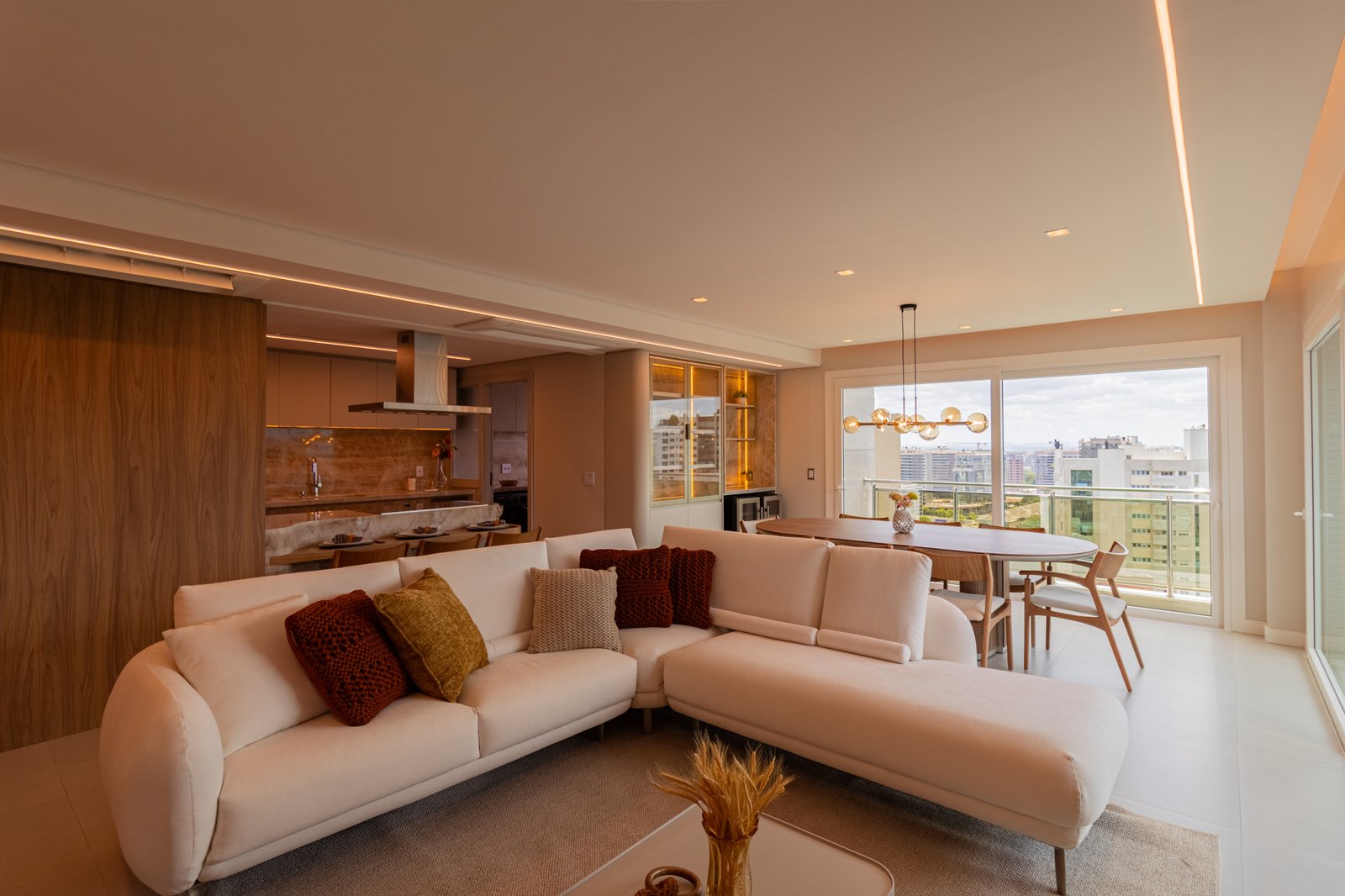 Por fim, a iluminação arquitetônica foi cuidadosamente definida para que uma luz suave e agradável fosse garantida. Assim, os ambientes passaram a contar com uma iluminação que não ofusca os olhos e que, ao mesmo tempo, valoriza a decoração clean desejada pelos moradores, reforçando o conceito de conforto e bem-estar em todo o apartamento.