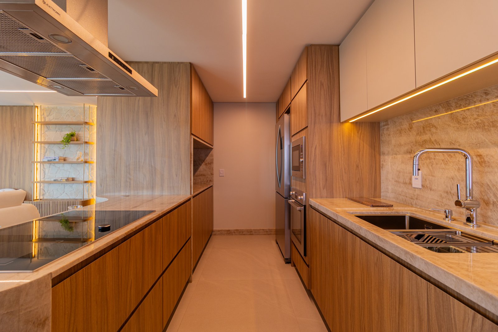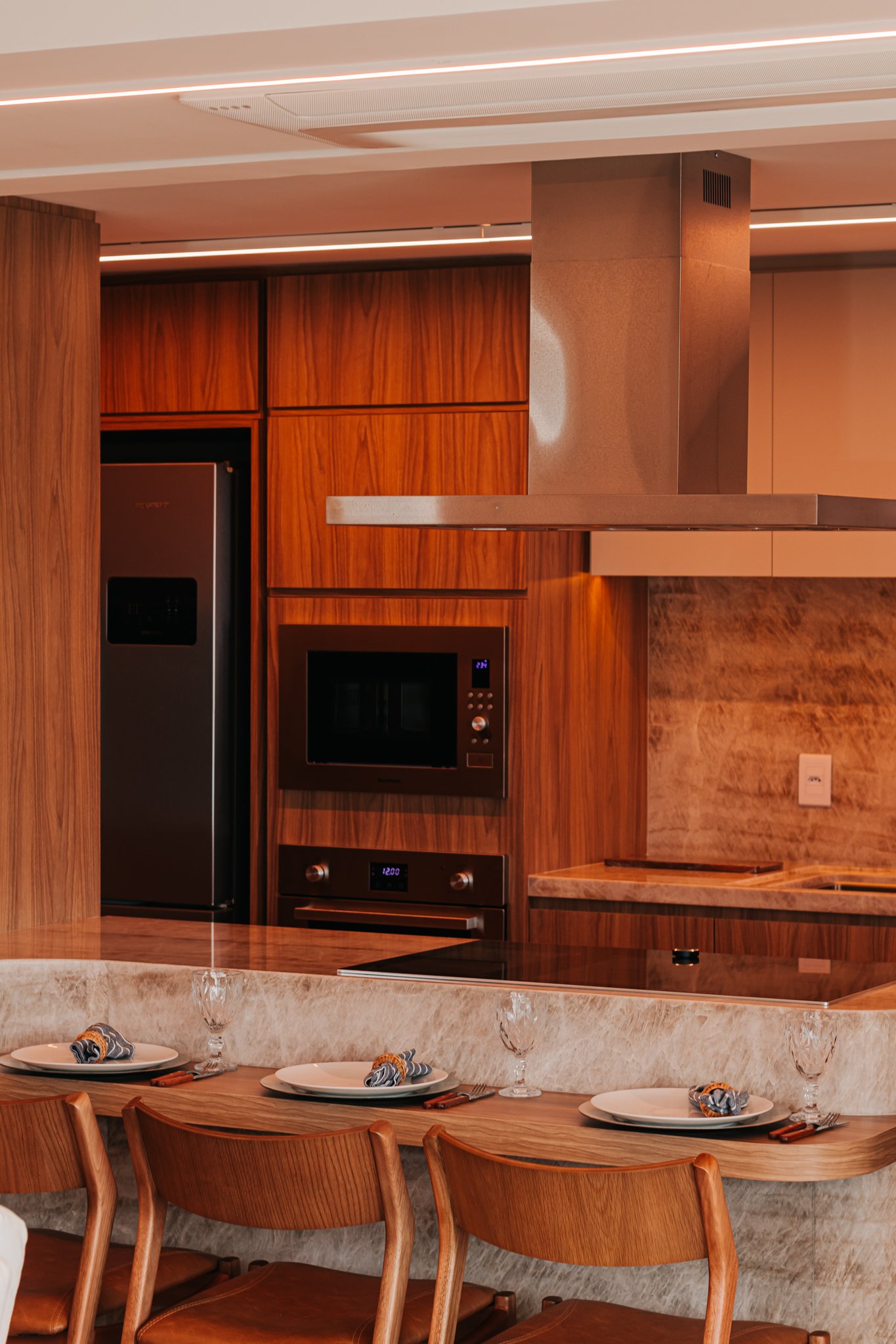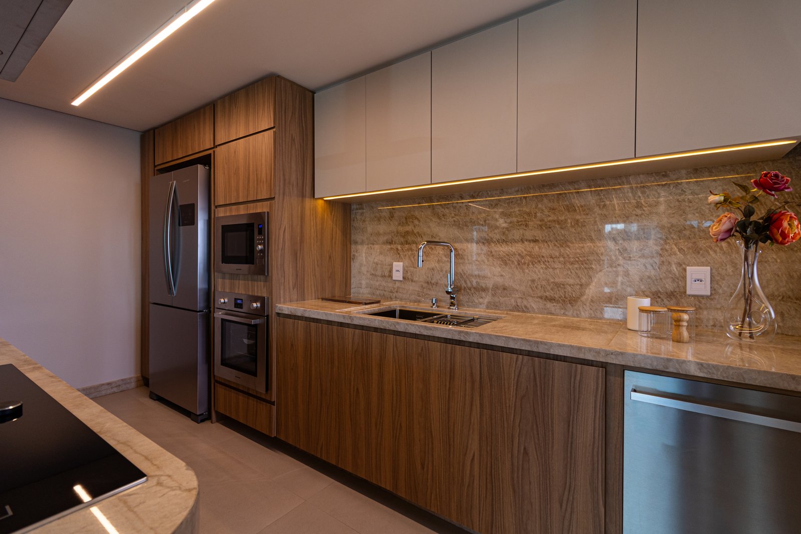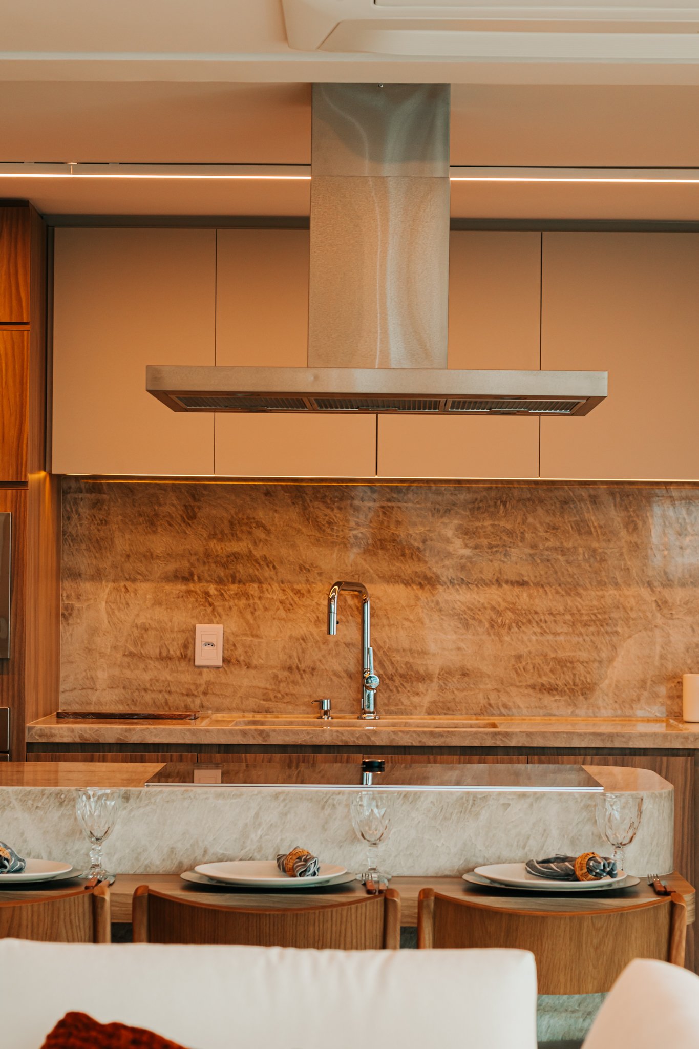 Inicialmente, foi mantida a integração da cozinha com a sala de estar, o que permitiu maior sensação de amplitude e melhor aproveitamento da luz natural. Além disso, nas bancadas, foi utilizado o quartzito Naica, material que se destaca não apenas pela beleza sofisticada, mas também pela alta resistência, sendo ideal para o uso diário.