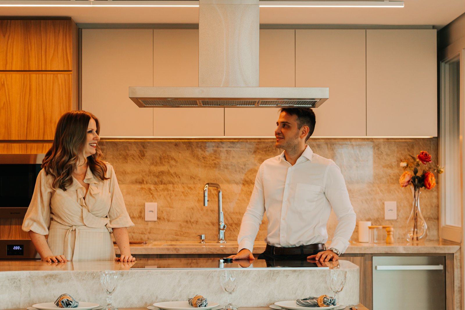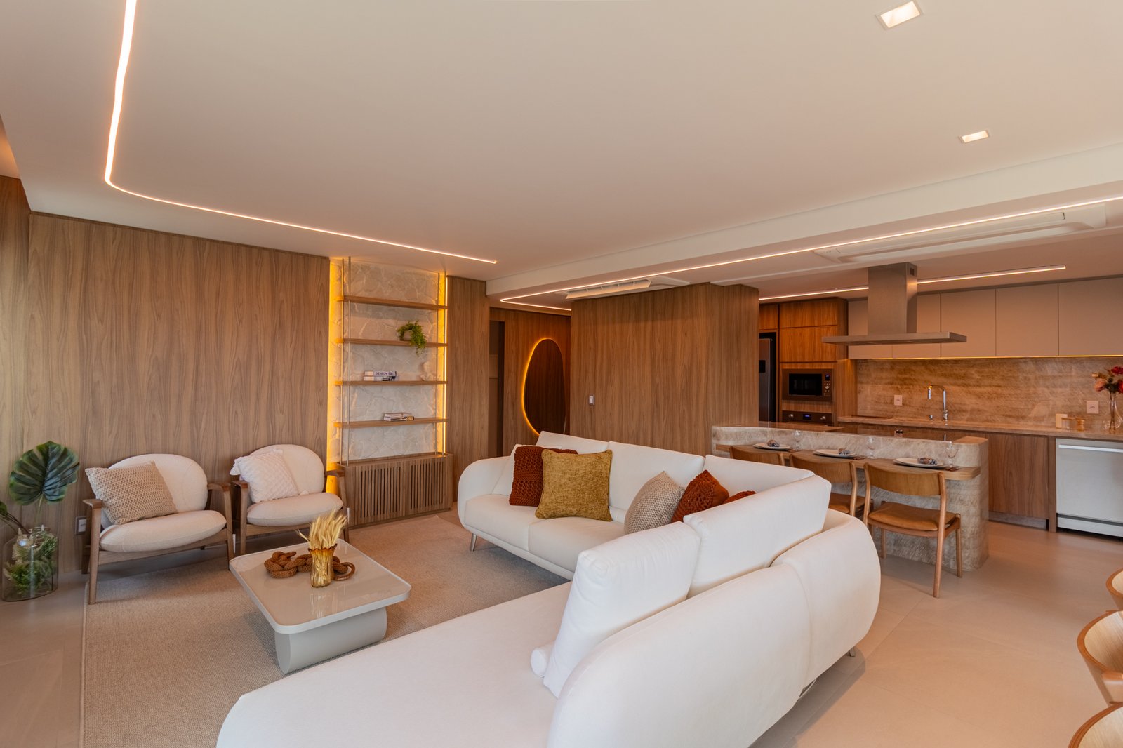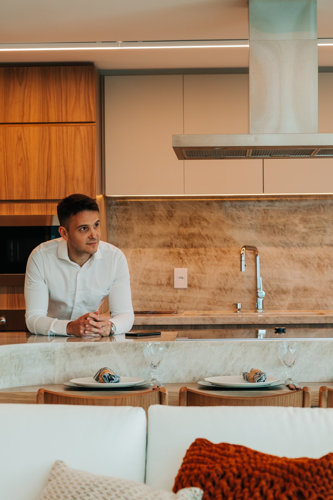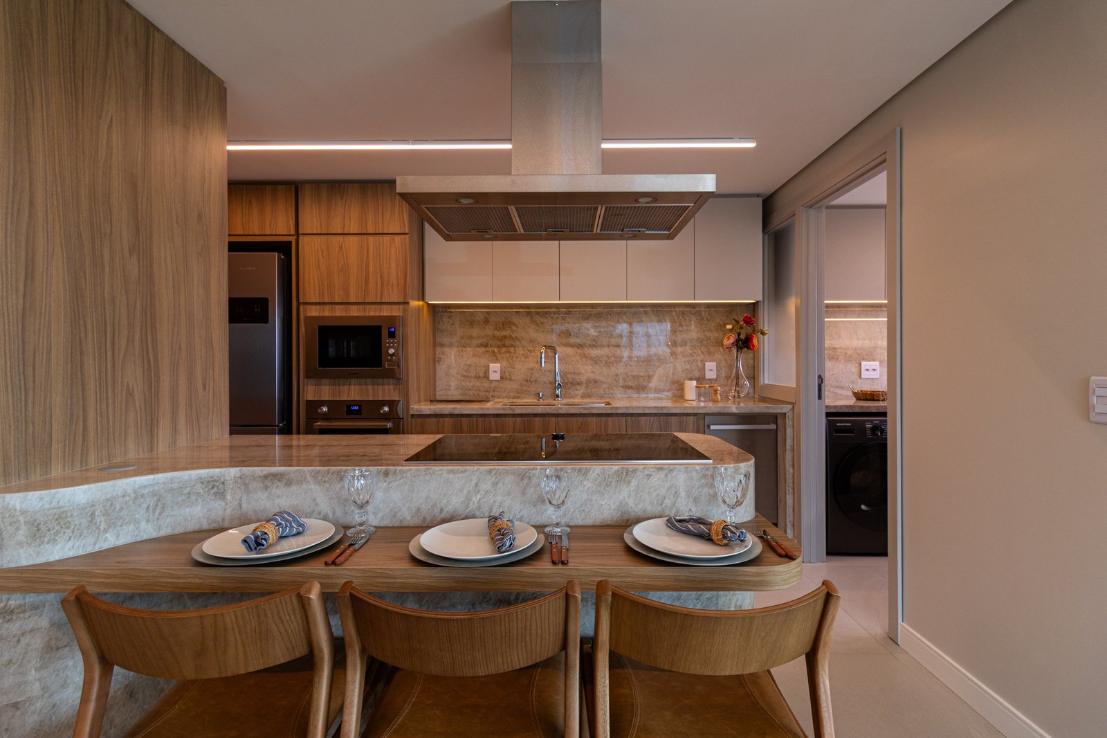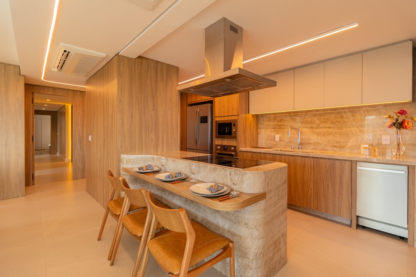 Inicialmente, foi mantida a integração da cozinha com a sala de estar, o que permitiu maior sensação de amplitude e melhor aproveitamento da luz natural. Além disso, nas bancadas, foi utilizado o quartzito Naica, material que se destaca não apenas pela beleza sofisticada, mas também pela alta resistência, sendo ideal para o uso diário.