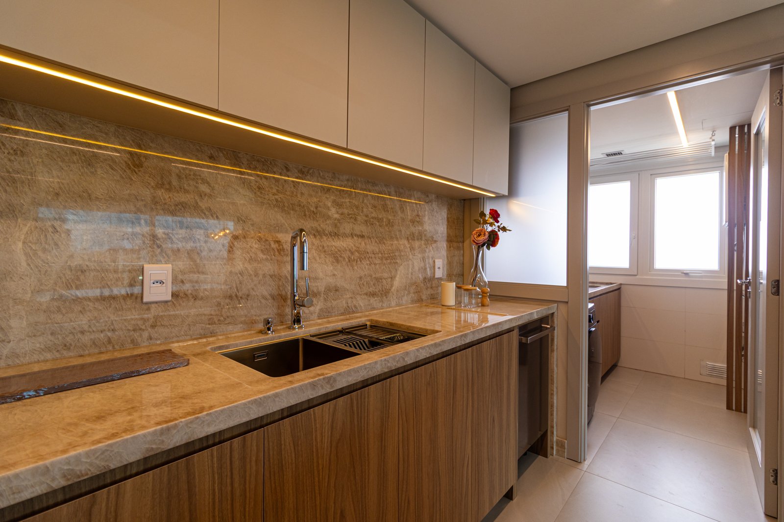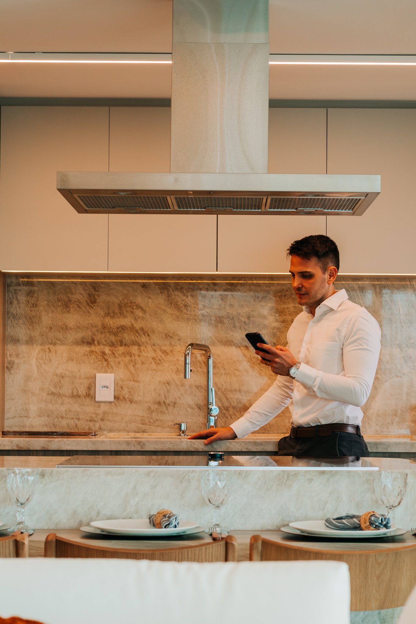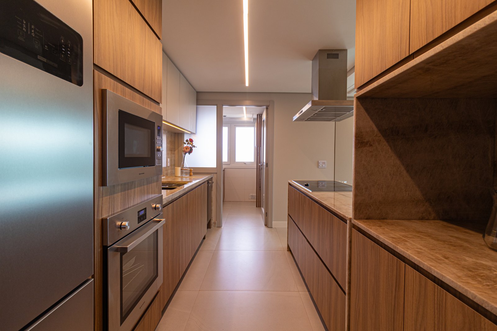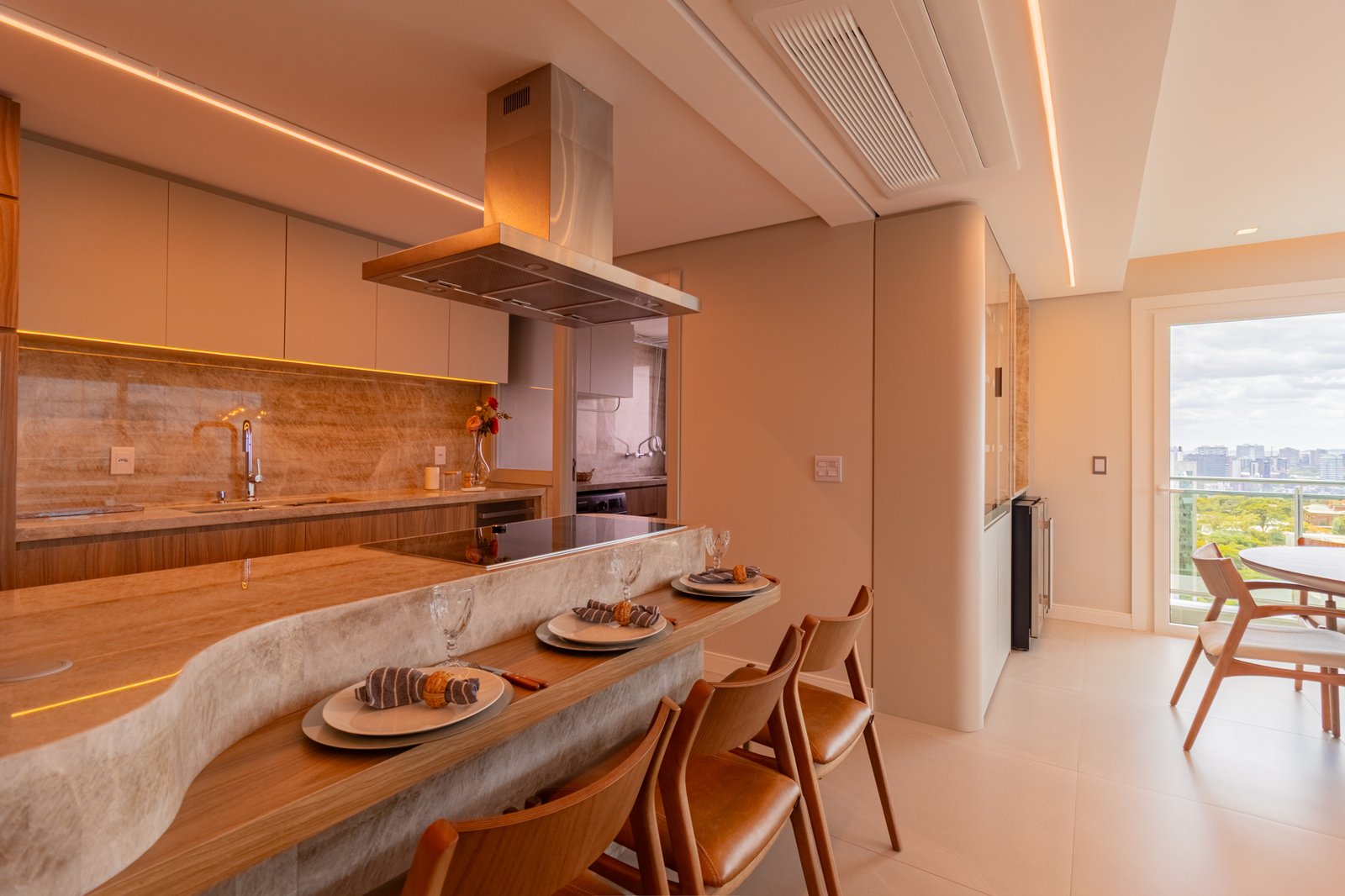 Inicialmente, foi mantida a integração da cozinha com a sala de estar, o que permitiu maior sensação de amplitude e melhor aproveitamento da luz natural. Além disso, nas bancadas, foi utilizado o quartzito Naica, material que se destaca não apenas pela beleza sofisticada, mas também pela alta resistência, sendo ideal para o uso diário.