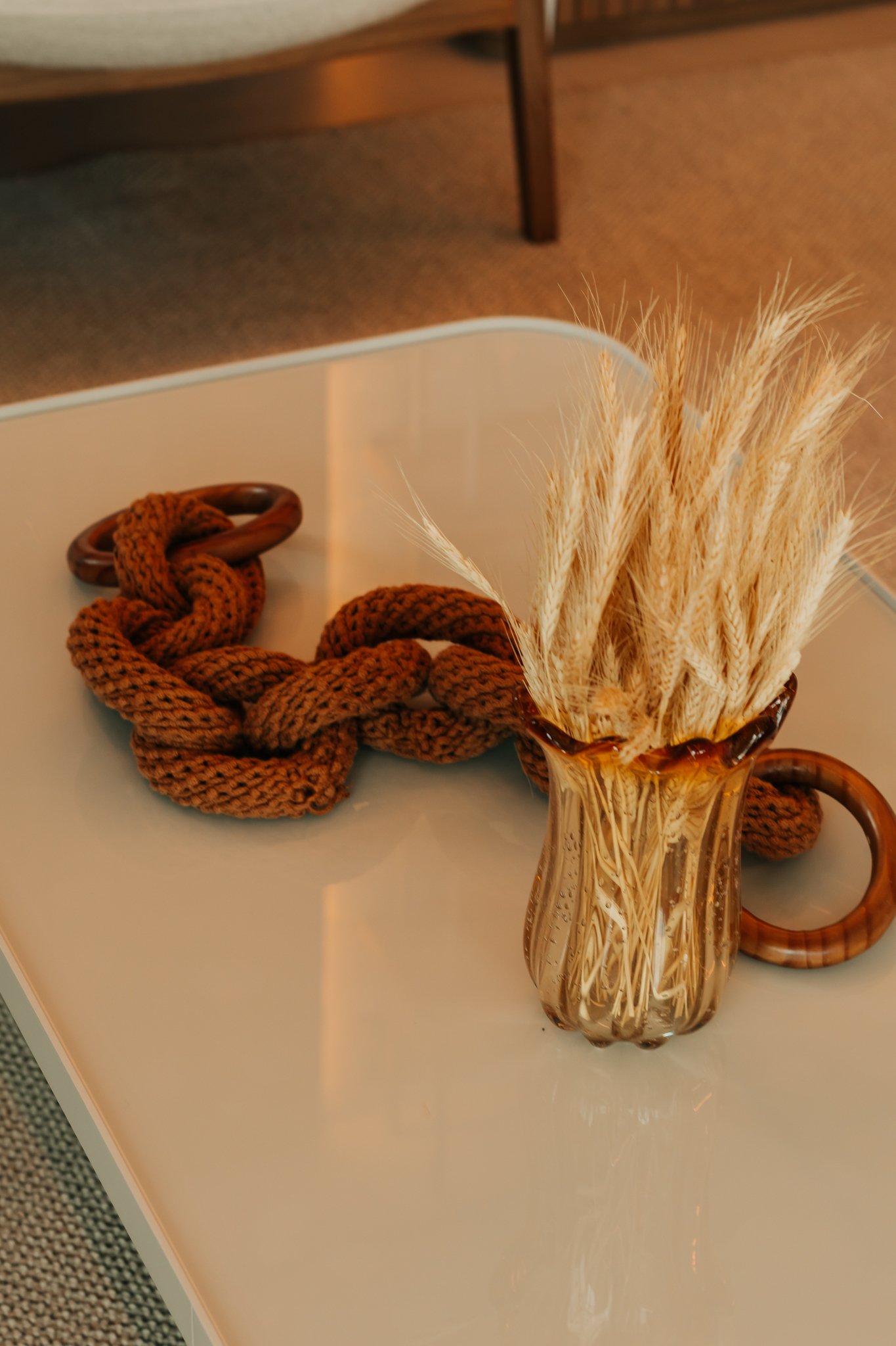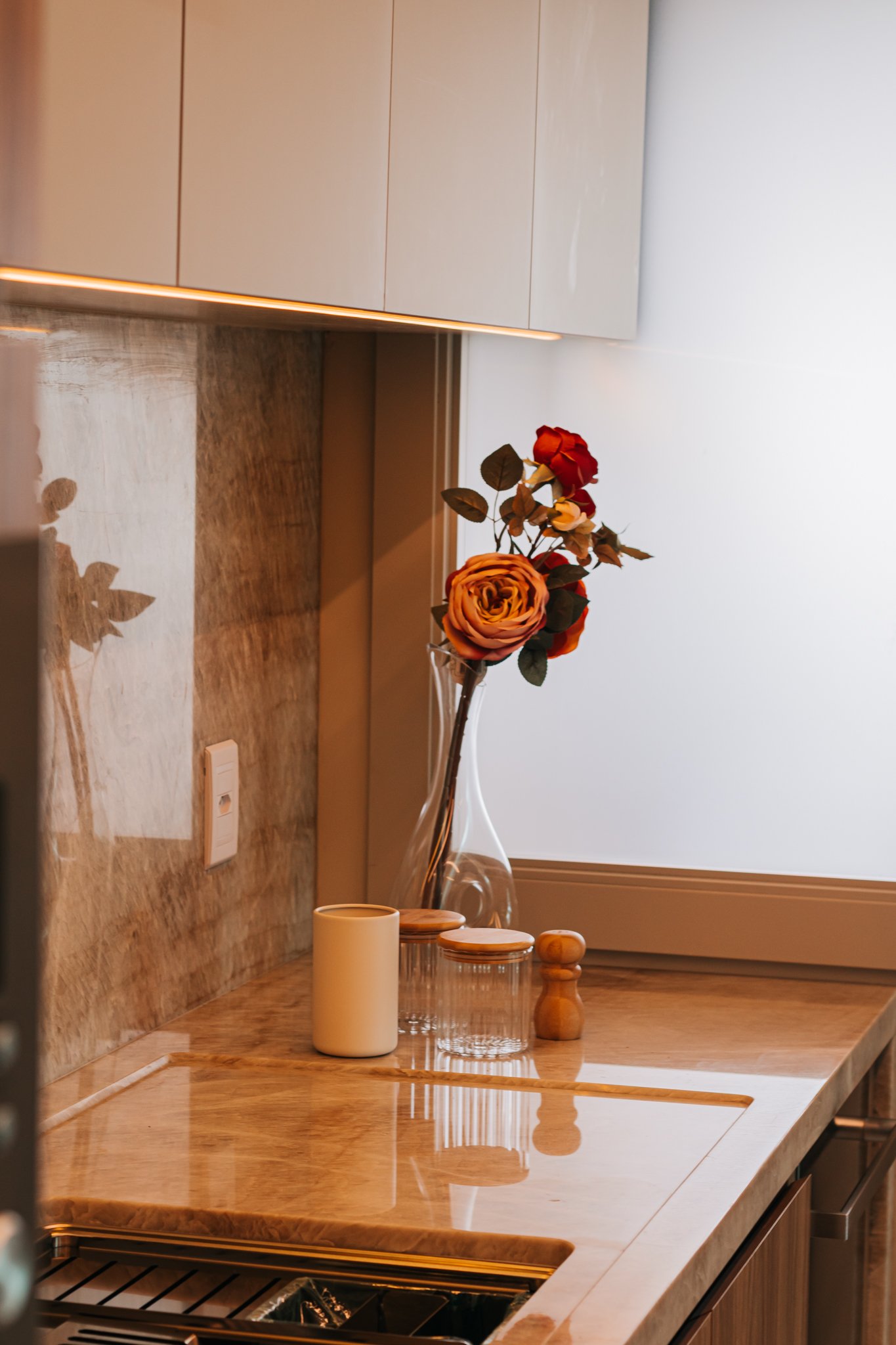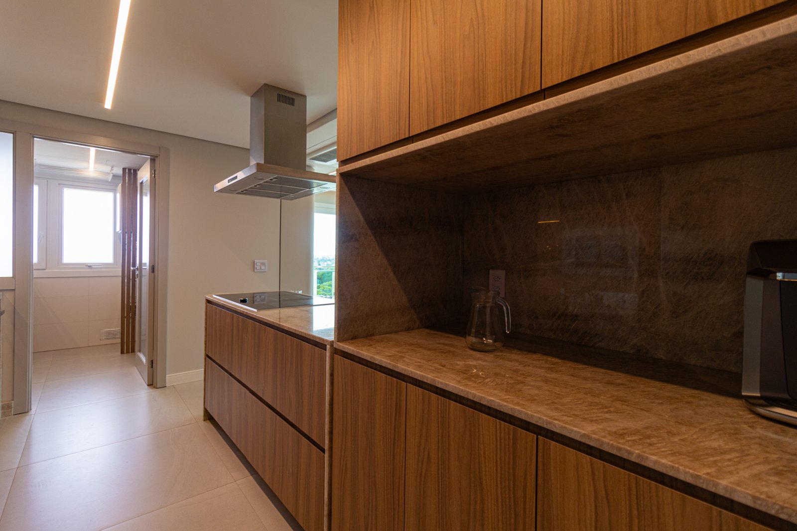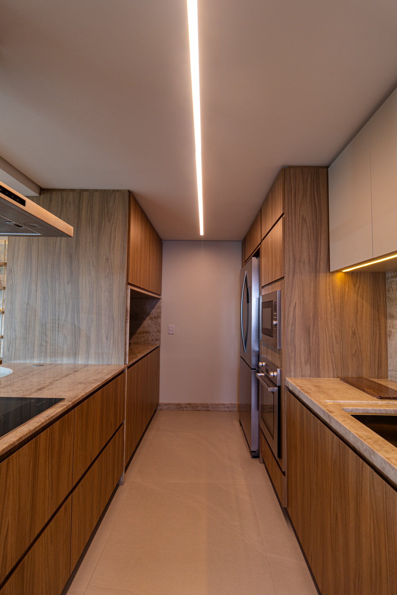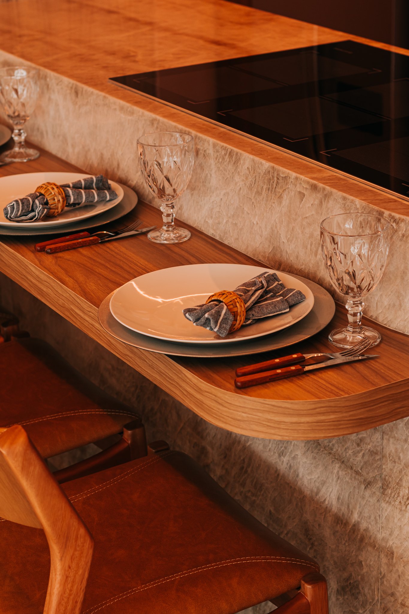 Inicialmente, foi mantida a integração da cozinha com a sala de estar, o que permitiu maior sensação de amplitude e melhor aproveitamento da luz natural. Além disso, nas bancadas, foi utilizado o quartzito Naica, material que se destaca não apenas pela beleza sofisticada, mas também pela alta resistência, sendo ideal para o uso diário.