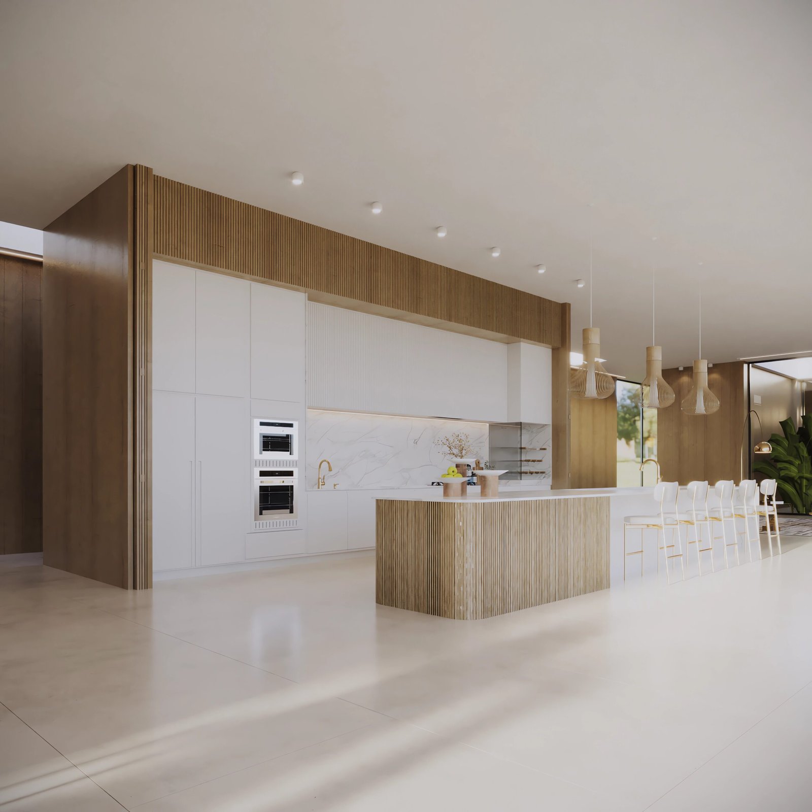 Para atender a essa demanda, dividimos o terreno em duas partes e posicionamos a casa de um lado, criando uma abertura para o jardim lateral, com orientação solar norte. Assim, todos os ambientes da casa ampla e sustentável oferecem uma vista privilegiada do pátio, que inclui uma área verde e piscina, localizadas em frente à parte social. Dessa forma, essa configuração proporciona um ambiente agradável e perfeito para momentos de lazer.