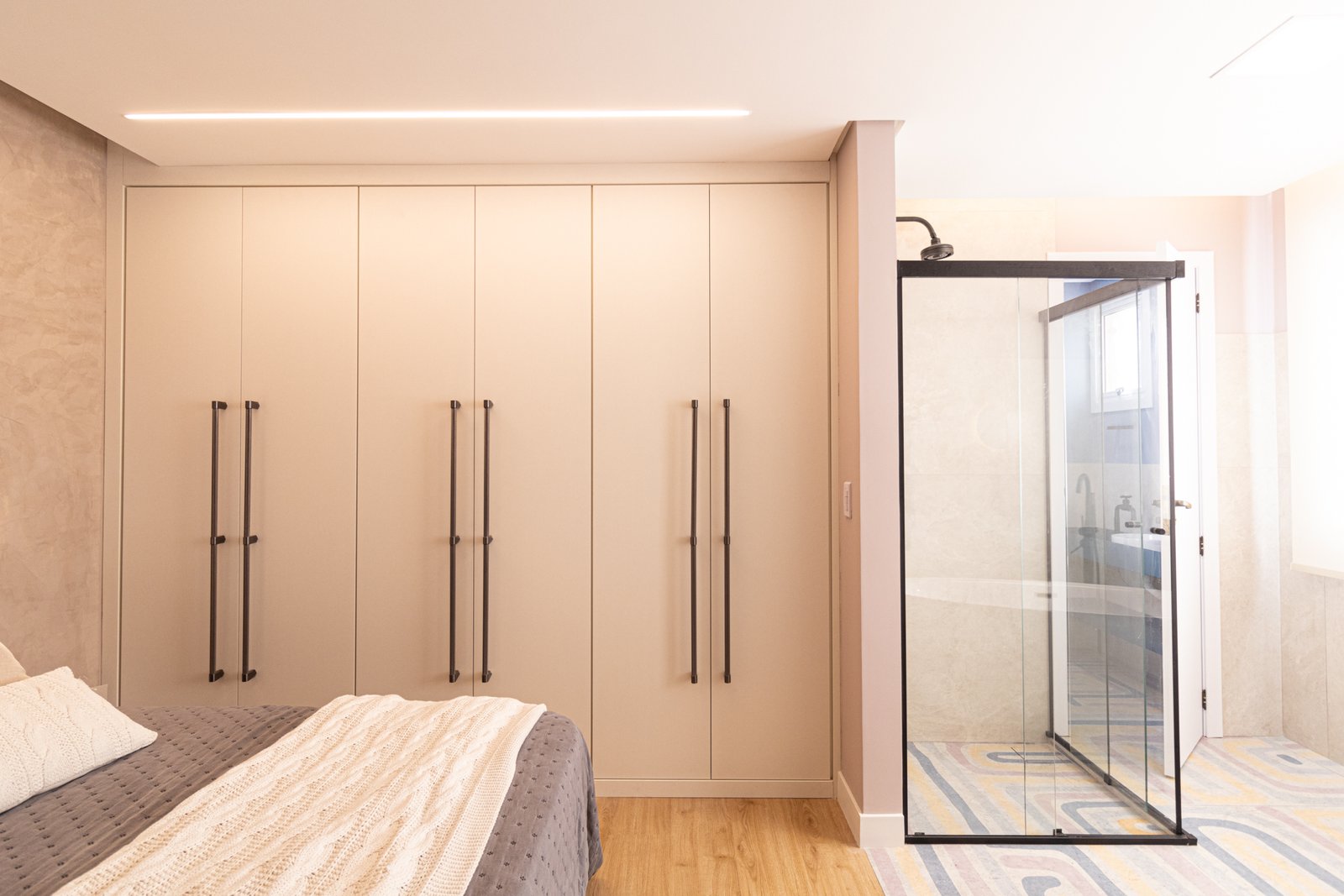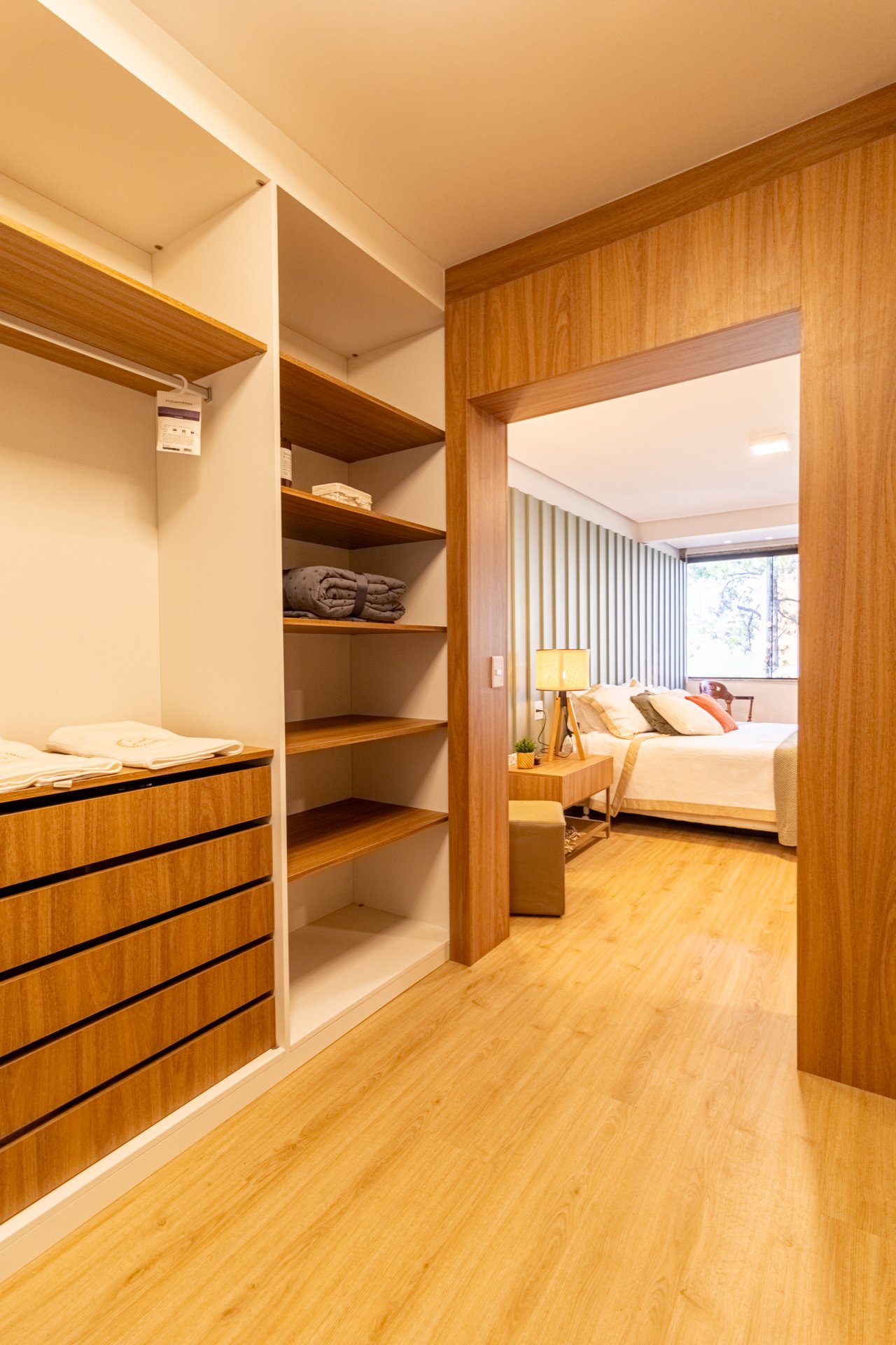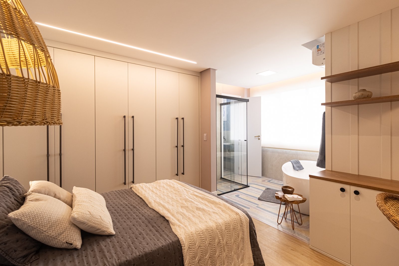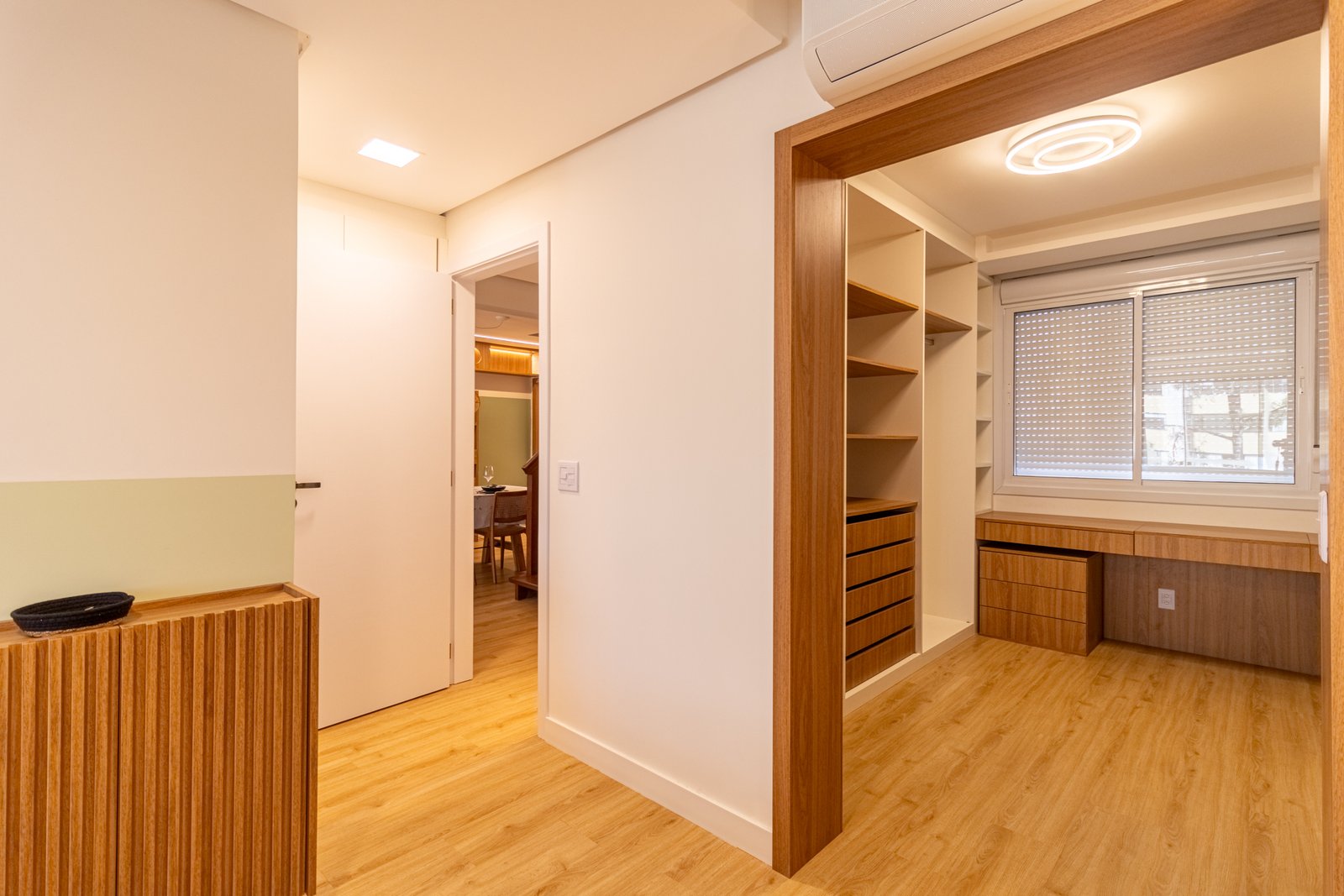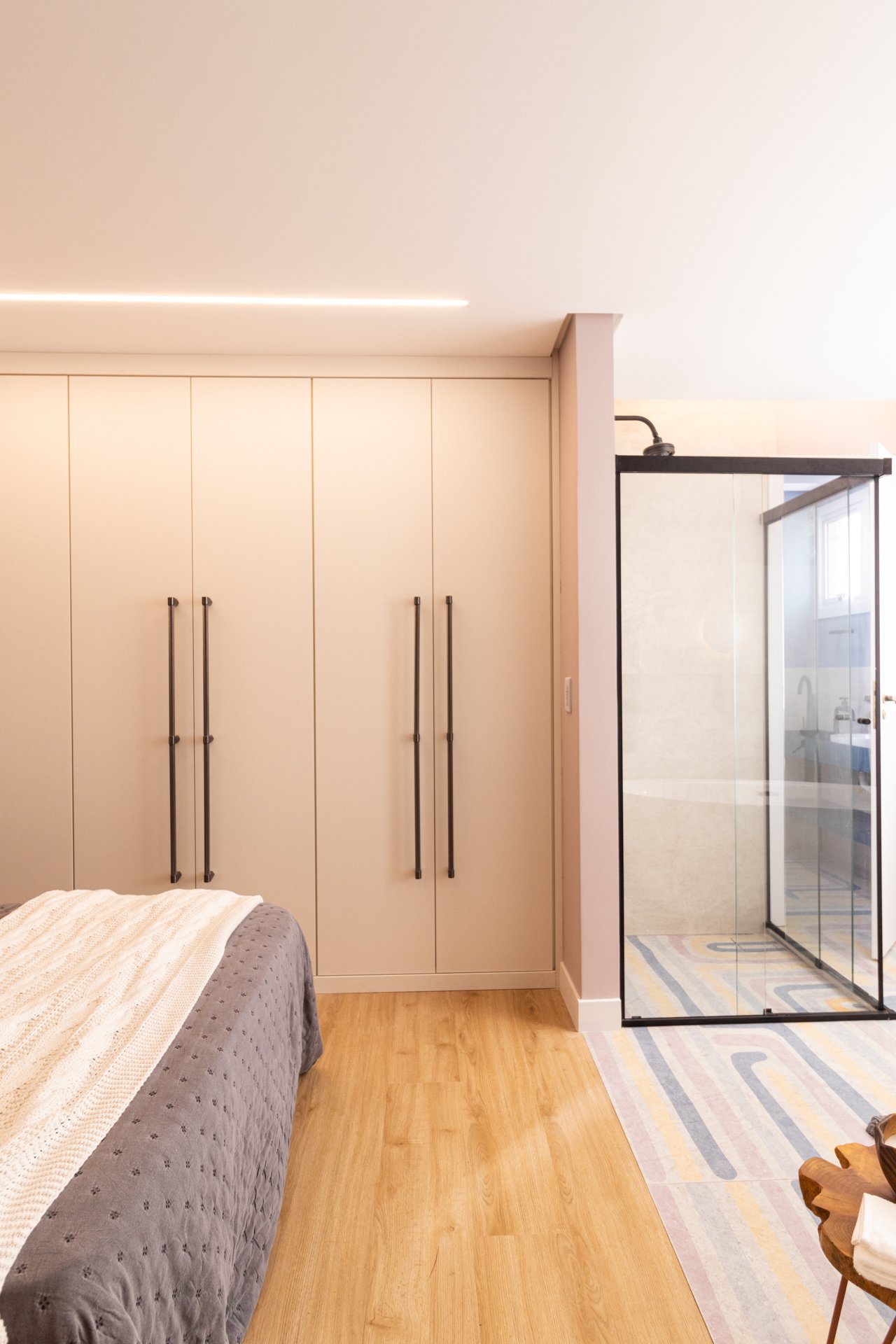 Suíte e Closet: Finalmente, o quarto principal transformou-se em refúgio de tranquilidade. Simultaneamente, o closet ganhou penteadeira, iluminação LED e armazenamento inteligente.