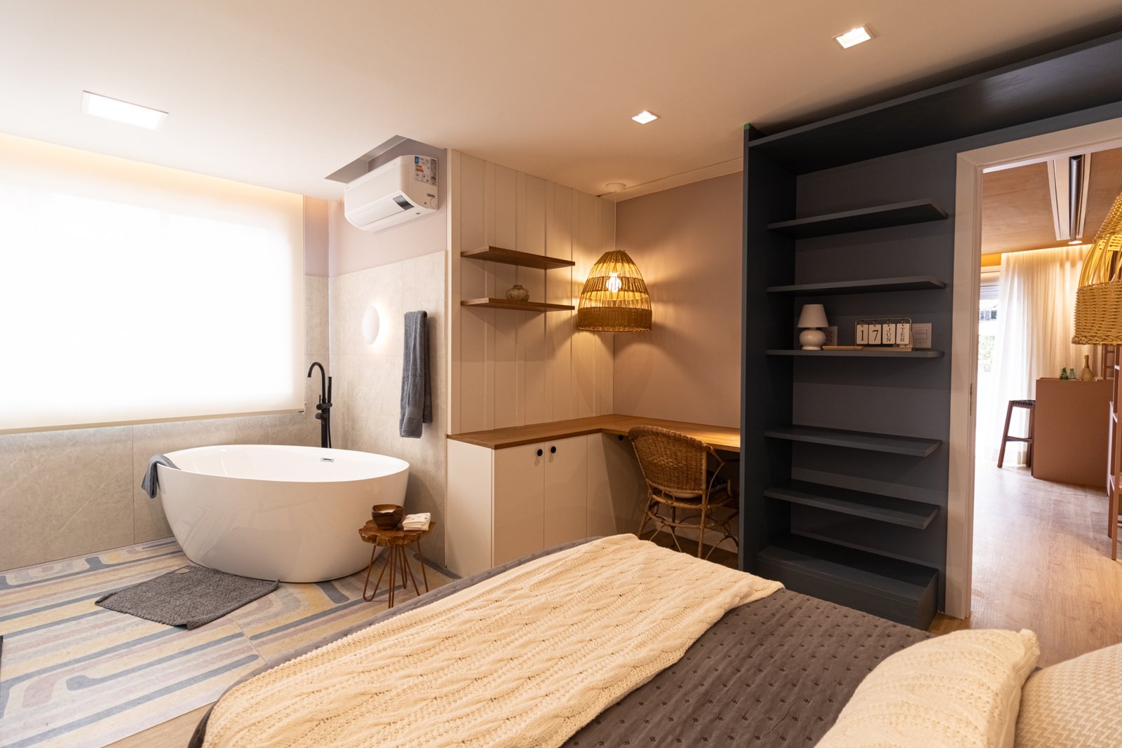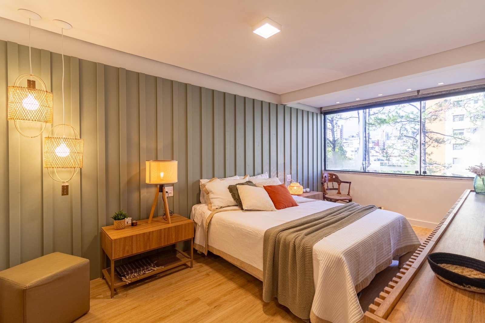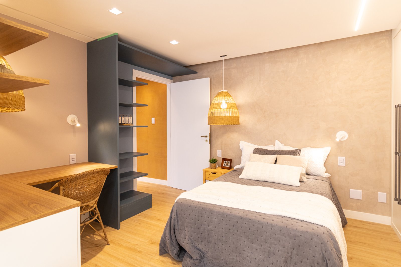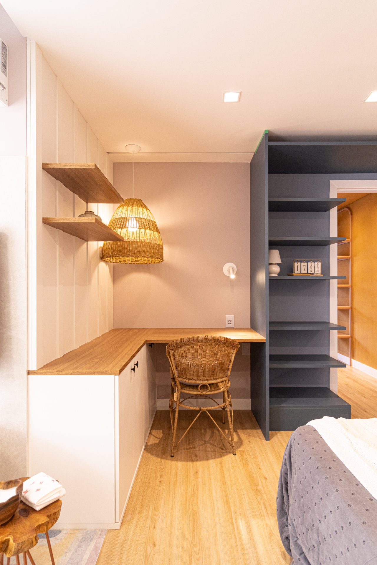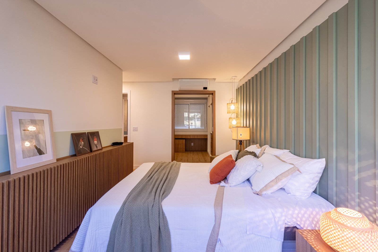 Suíte e Closet: Finalmente, o quarto principal transformou-se em refúgio de tranquilidade. Simultaneamente, o closet ganhou penteadeira, iluminação LED e armazenamento inteligente.