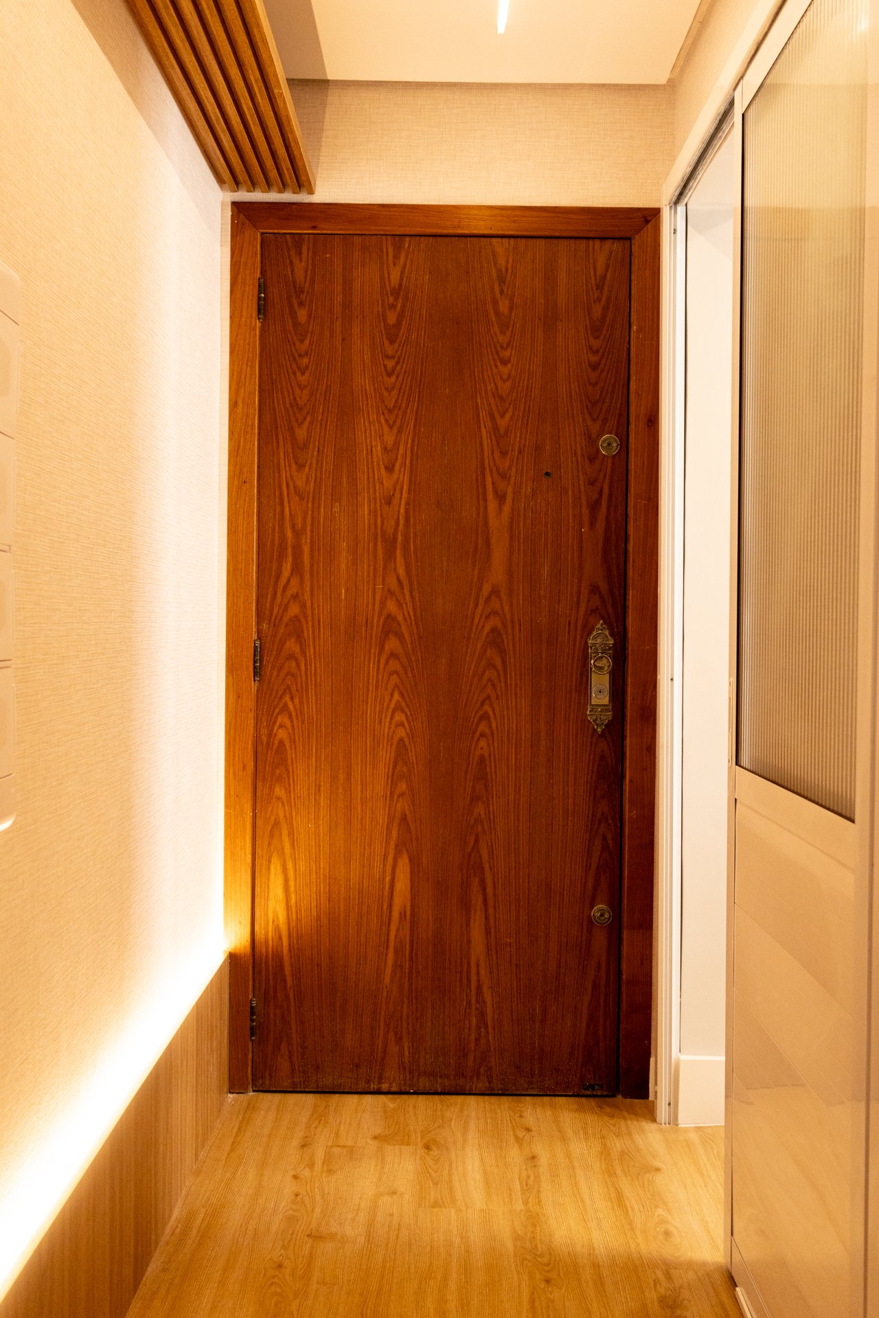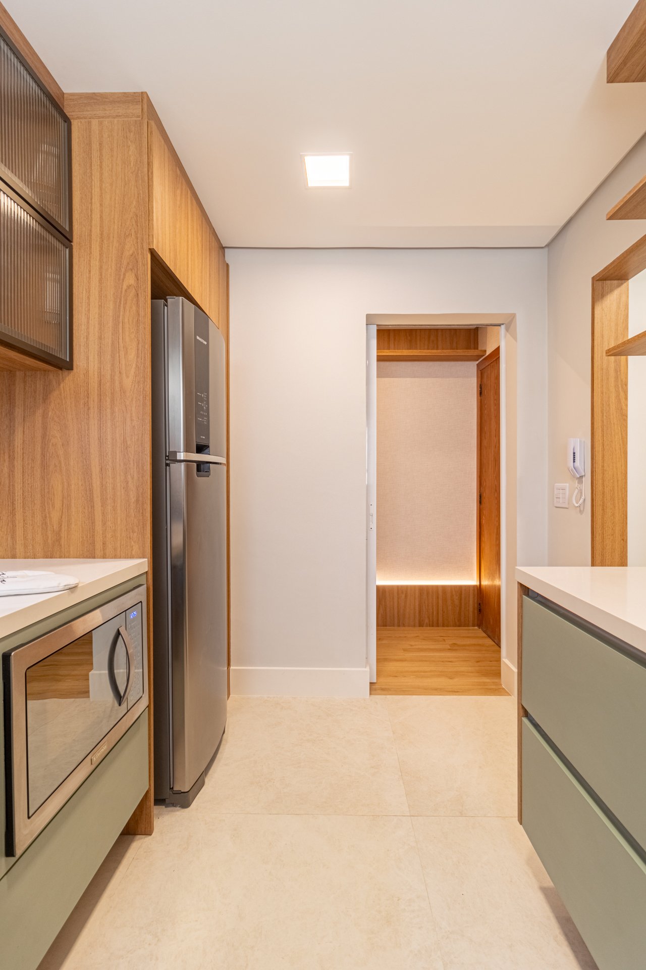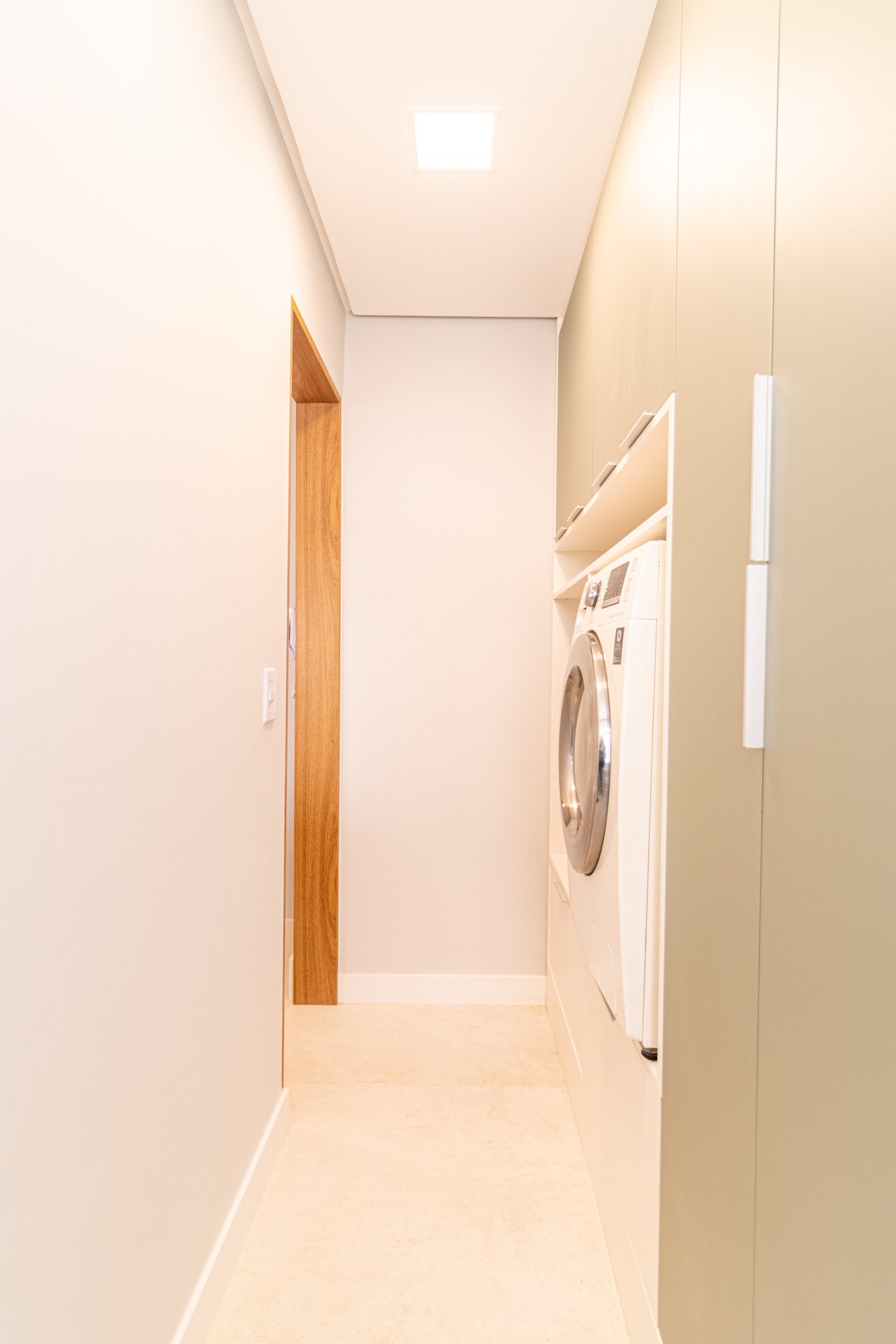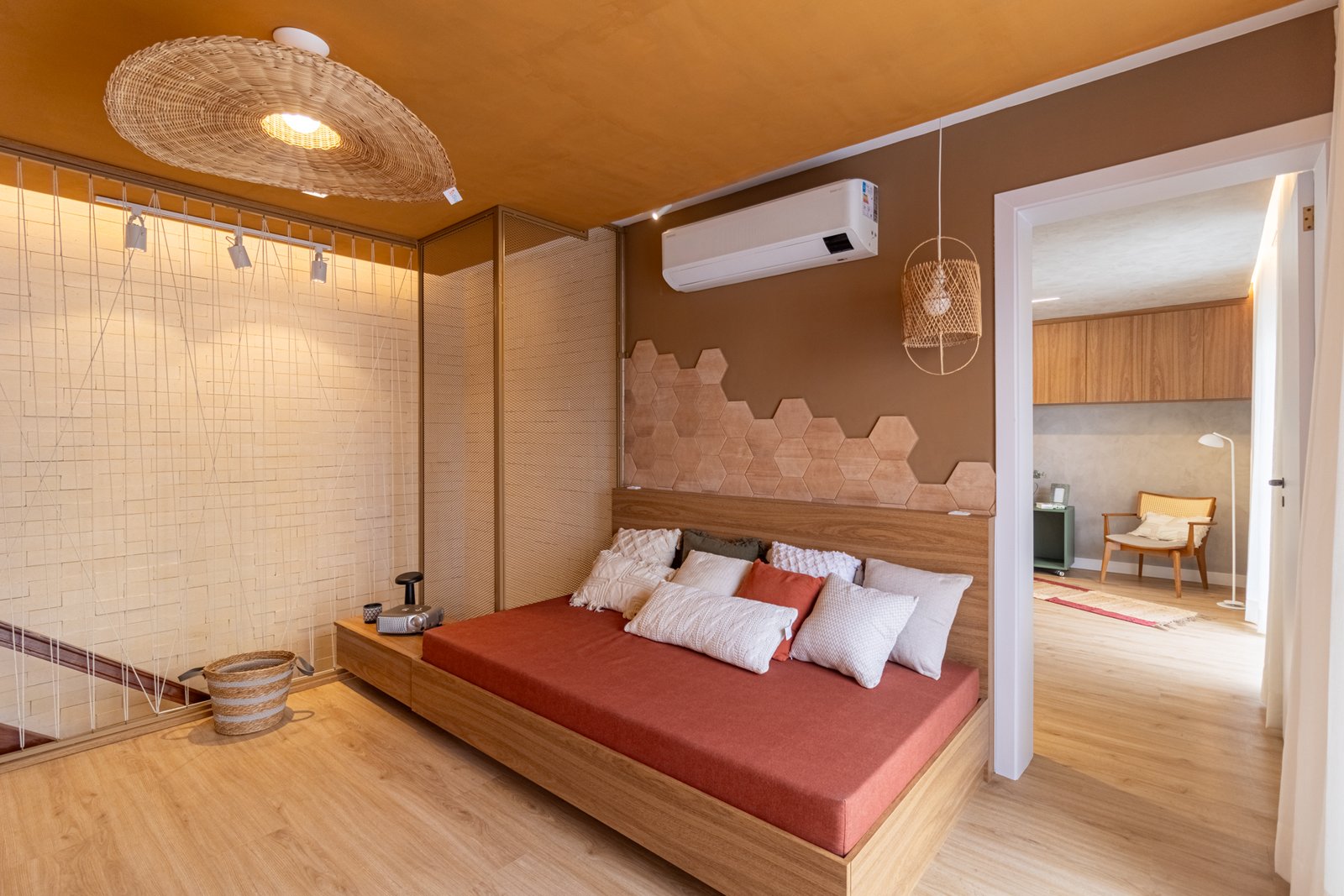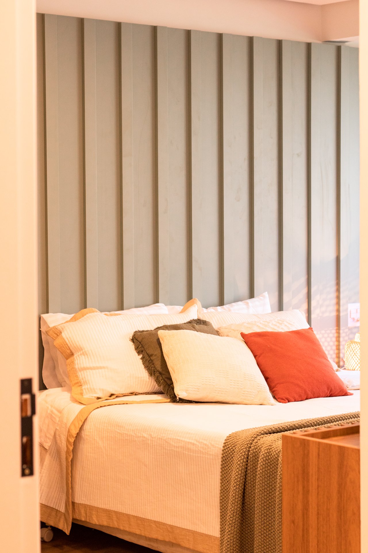 Suíte e Closet: Finalmente, o quarto principal transformou-se em refúgio de tranquilidade. Simultaneamente, o closet ganhou penteadeira, iluminação LED e armazenamento inteligente.