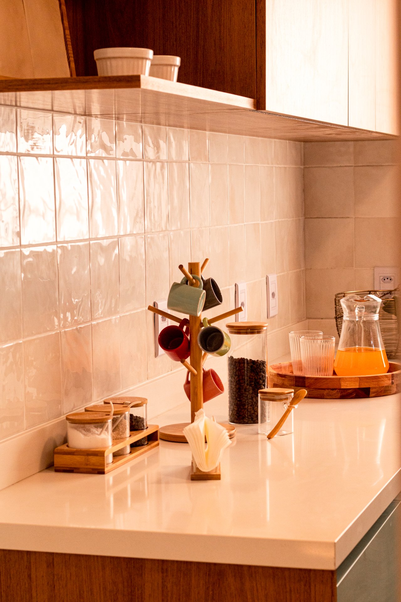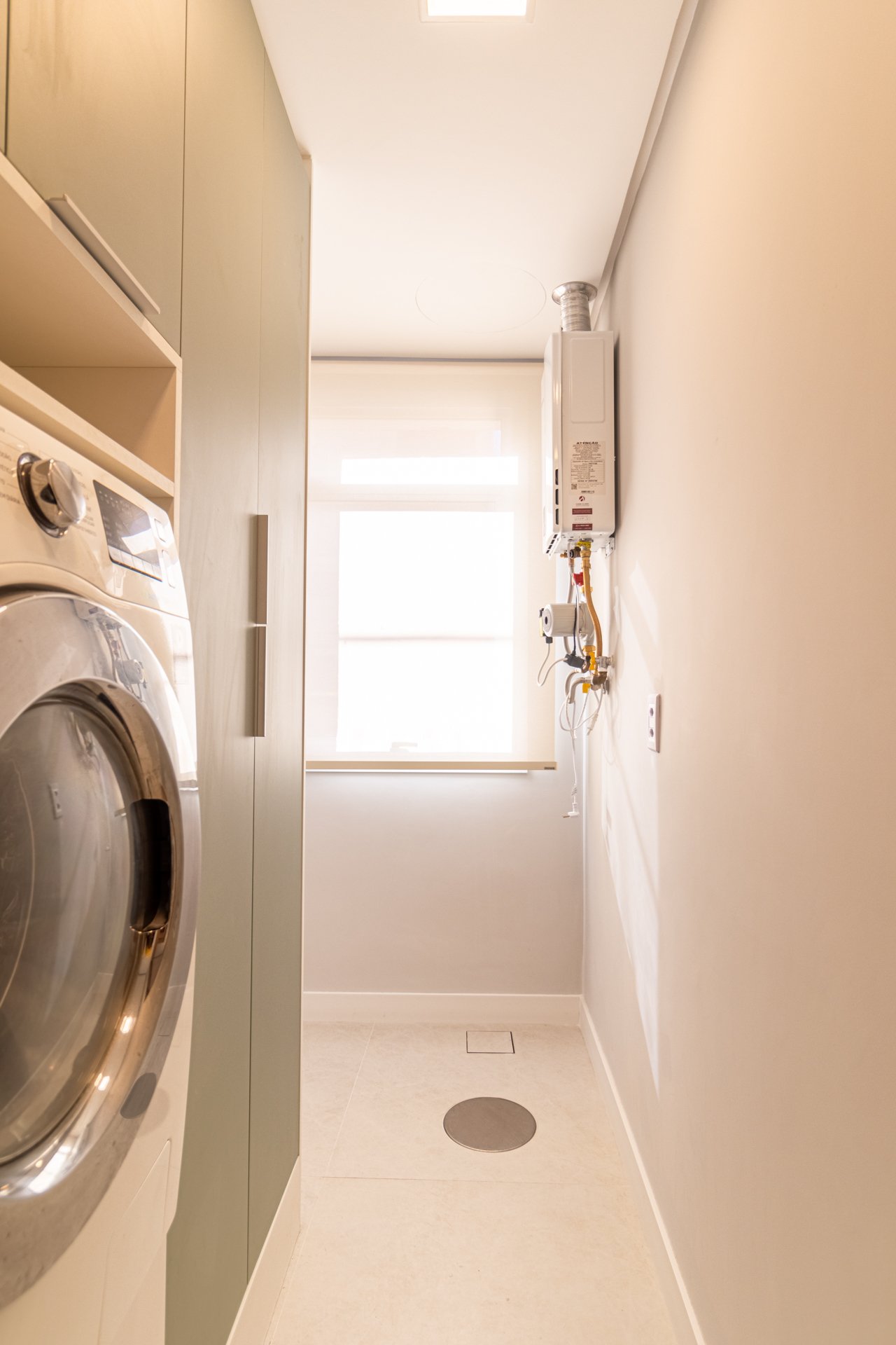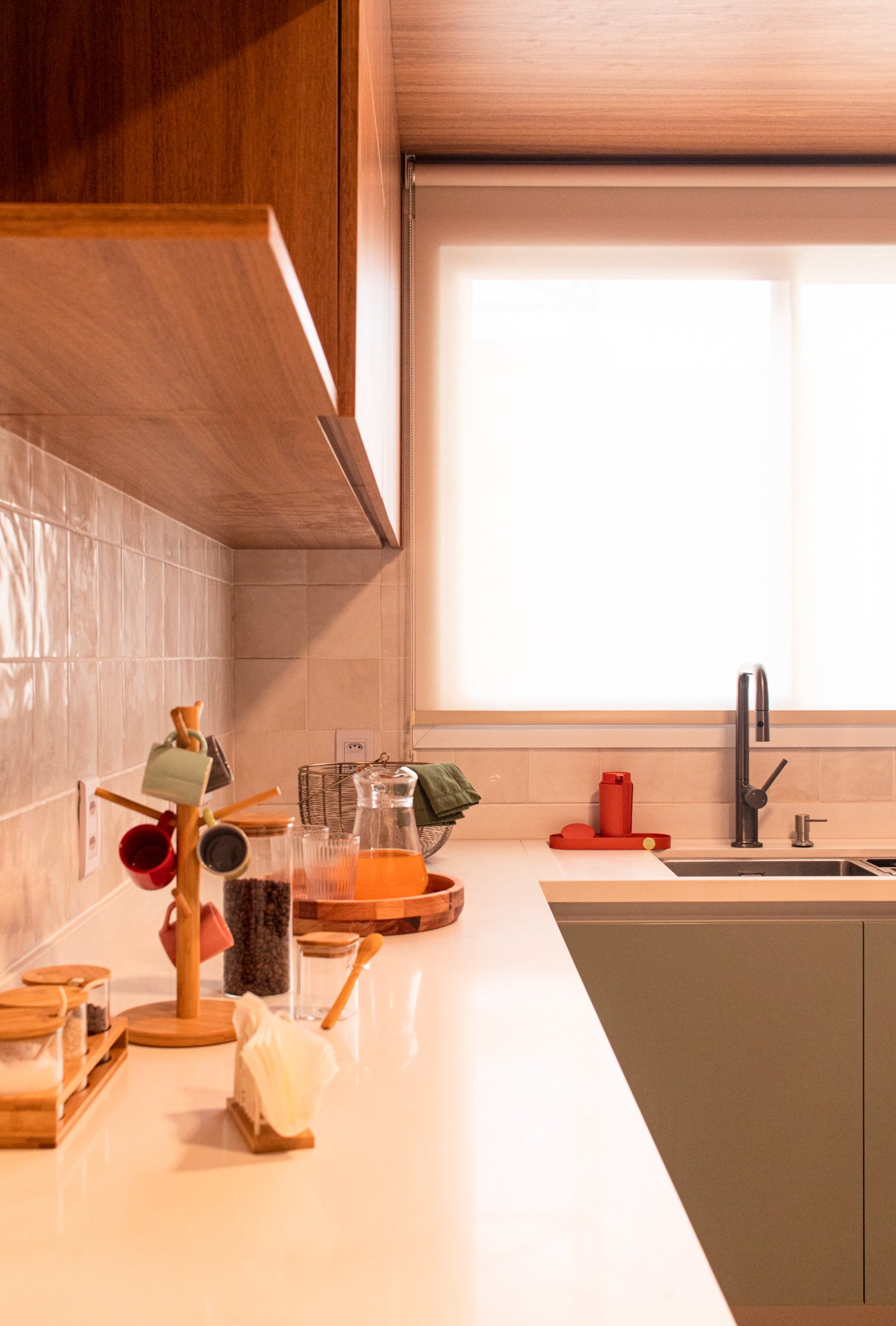 Cozinha e Área de Serviço: Anteriormente, o espaço apresentava canos expostos e portas mal posicionadas. Posteriormente, ganhou bancada contínua e armazenamento estratégico, considerando inclusive as necessidades dos três gatos do casal.