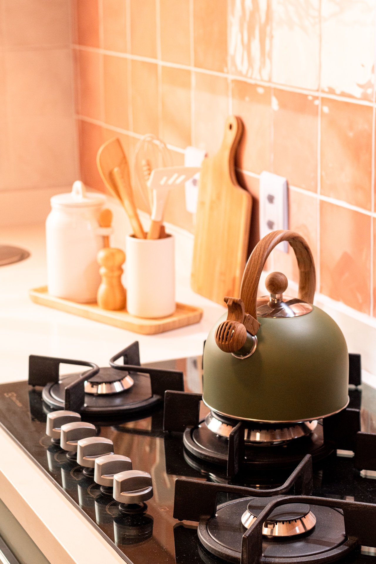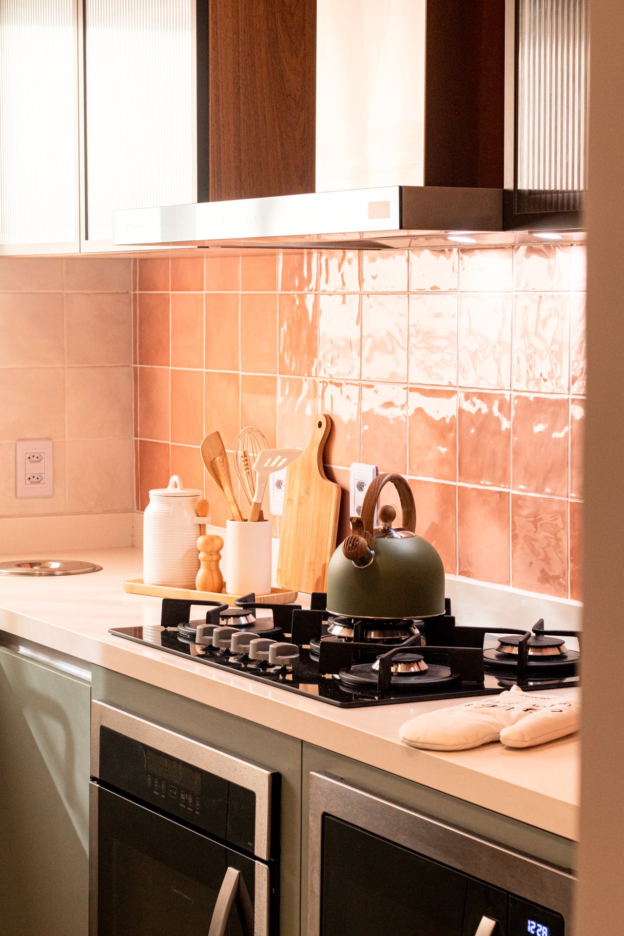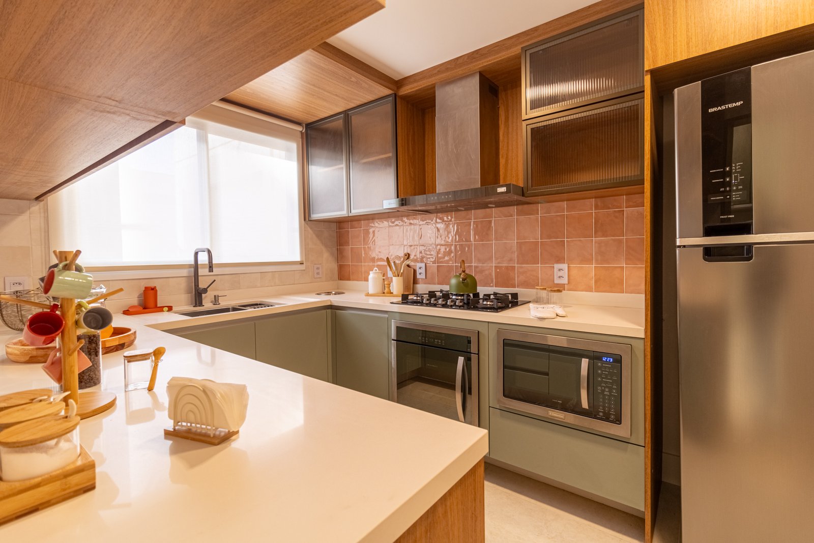 Cozinha e Área de Serviço: Anteriormente, o espaço apresentava canos expostos e portas mal posicionadas. Posteriormente, ganhou bancada contínua e armazenamento estratégico, considerando inclusive as necessidades dos três gatos do casal.