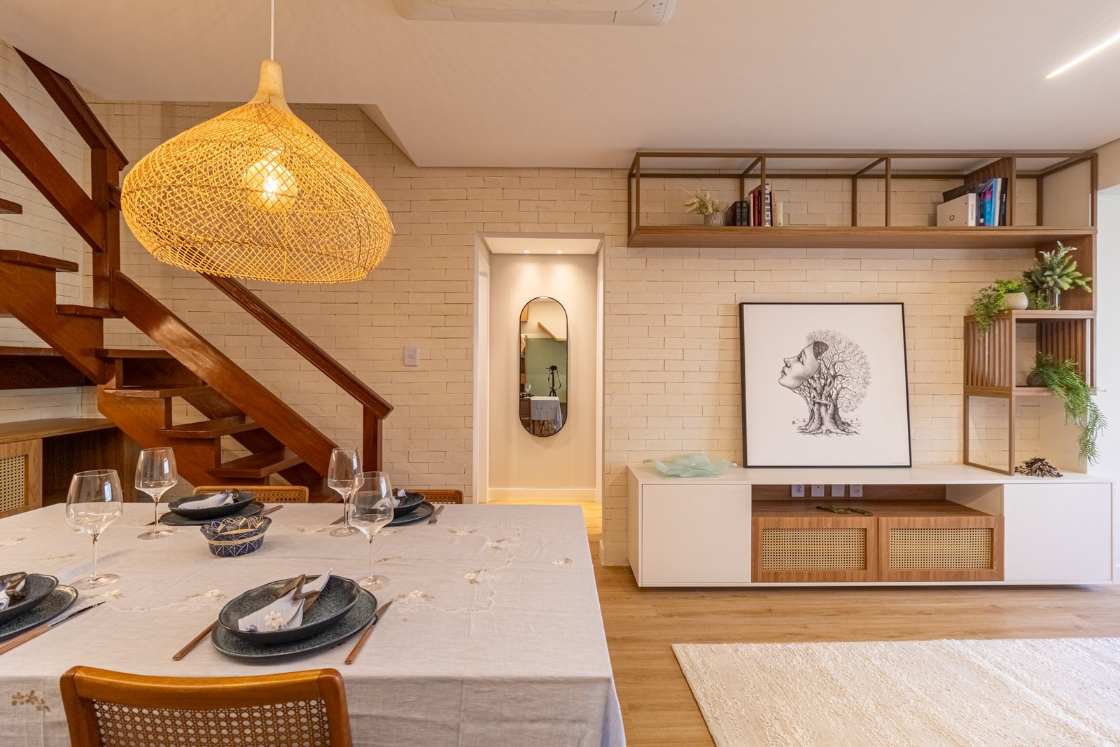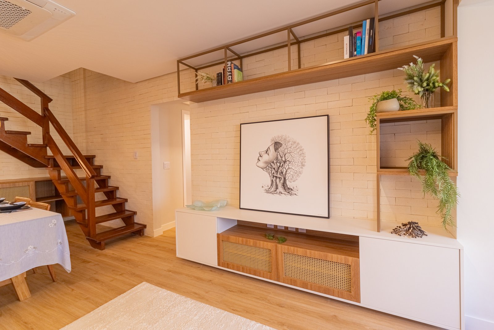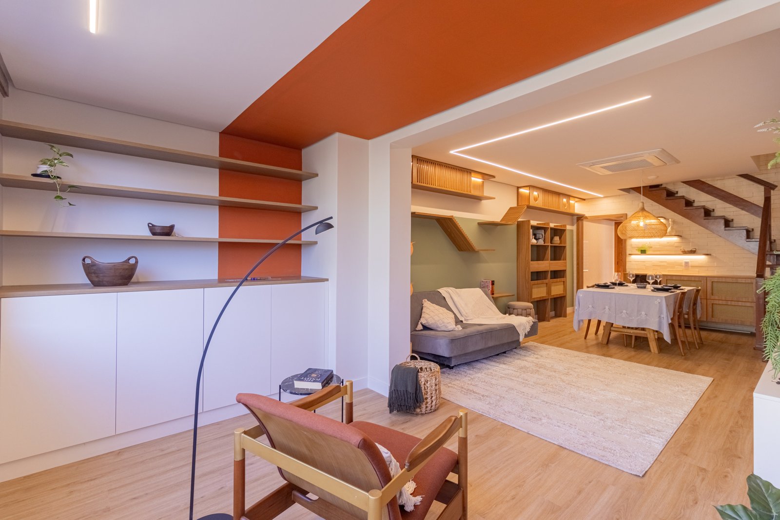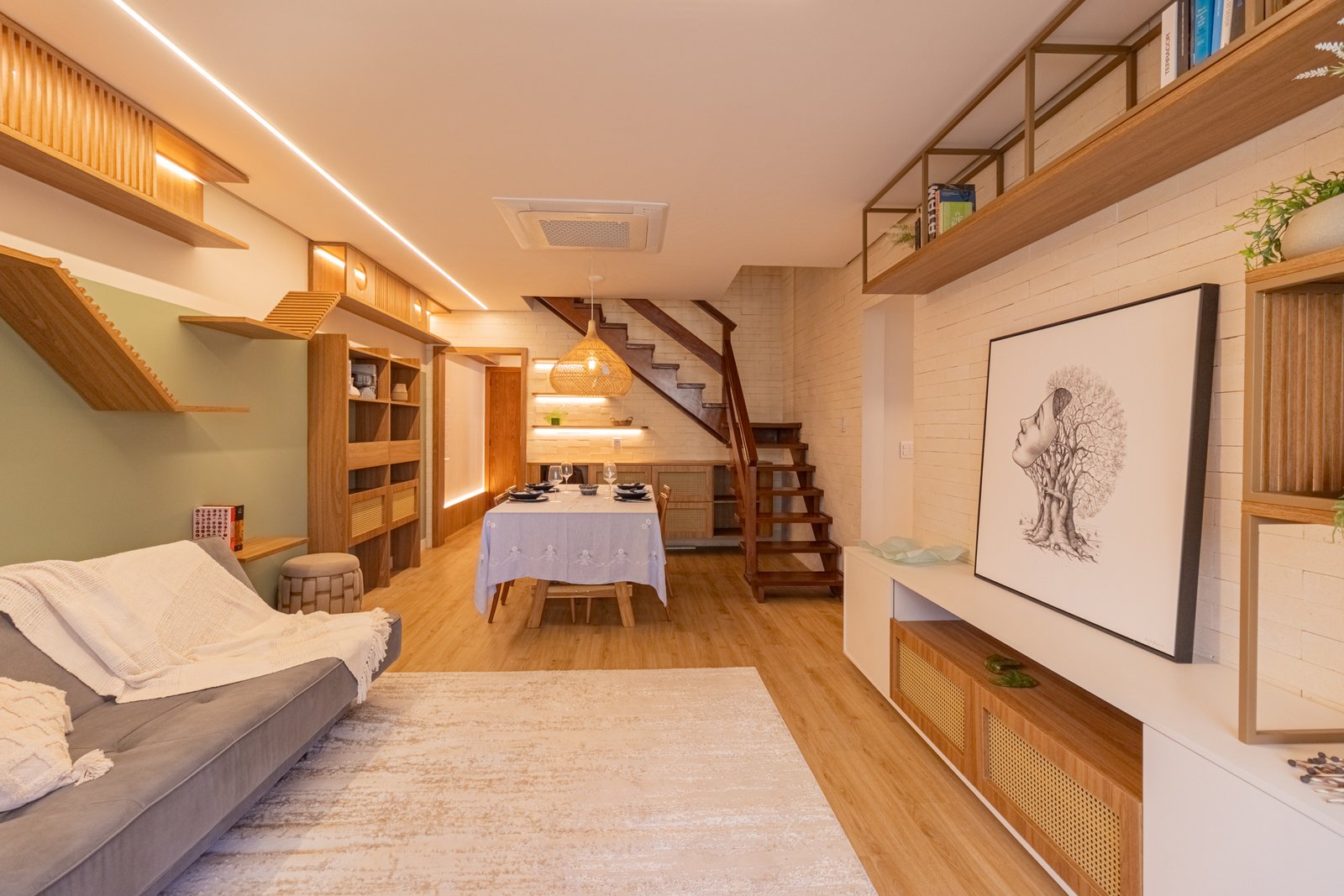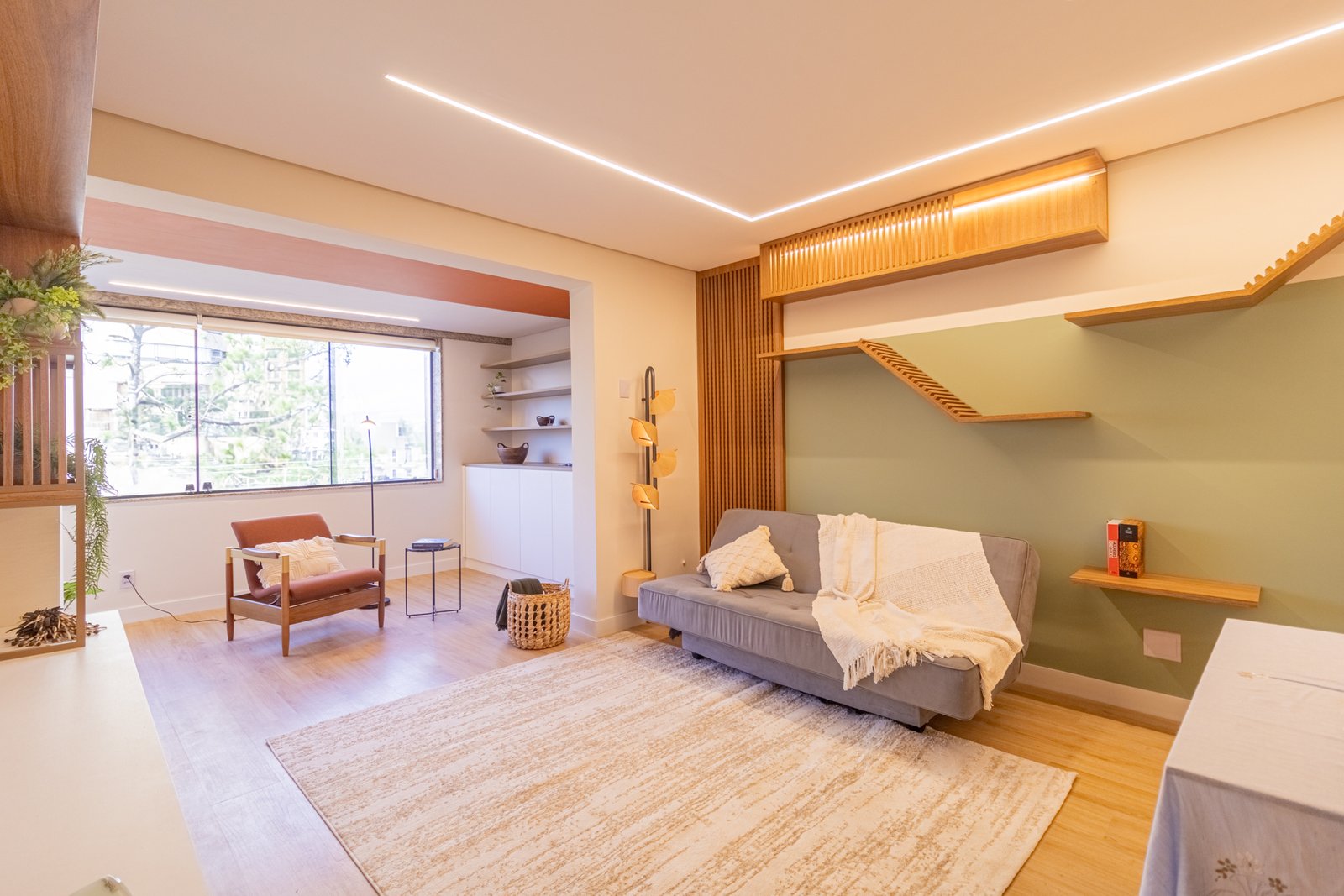 Sala de Estar: Similarmente, o ambiente antes sem vida recebeu prateleiras e nichos em alturas variadas. Assim, tornou-se um playground felino sem comprometer o design moderno.