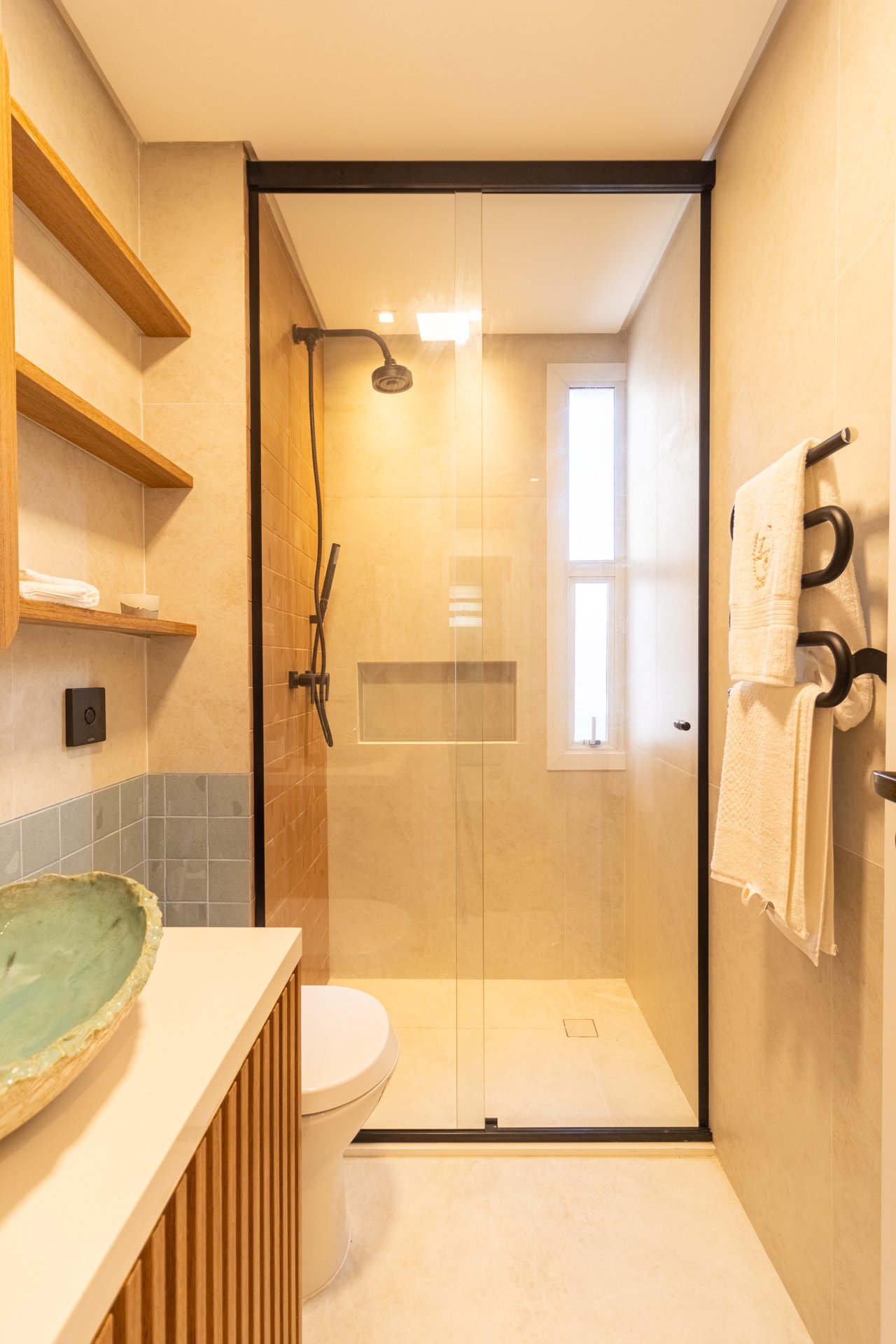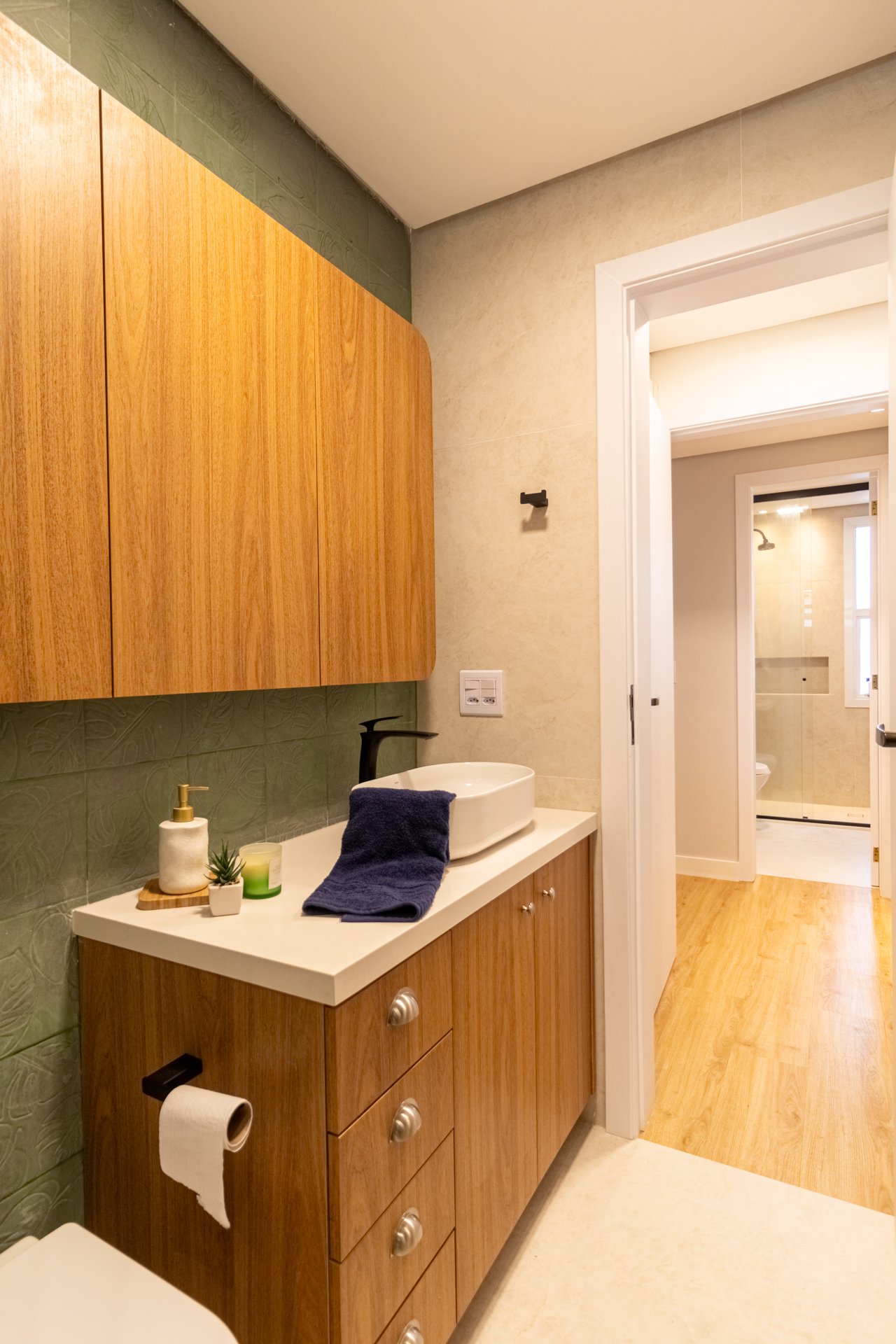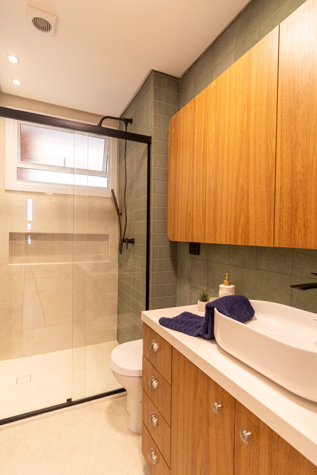 Banheiro Social: Igualmente importante, este espaço foi completamente reformado. Portanto, vazamentos e revestimentos desgastados deram lugar a materiais duráveis e design harmonioso.