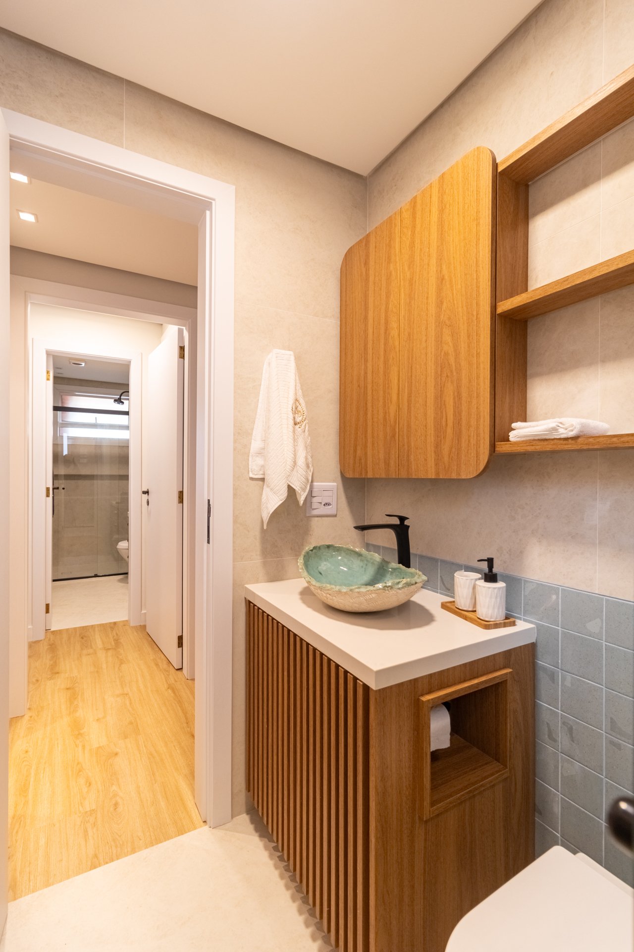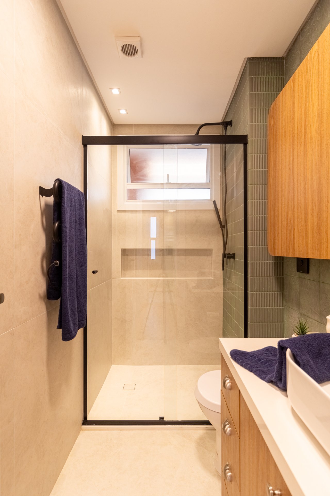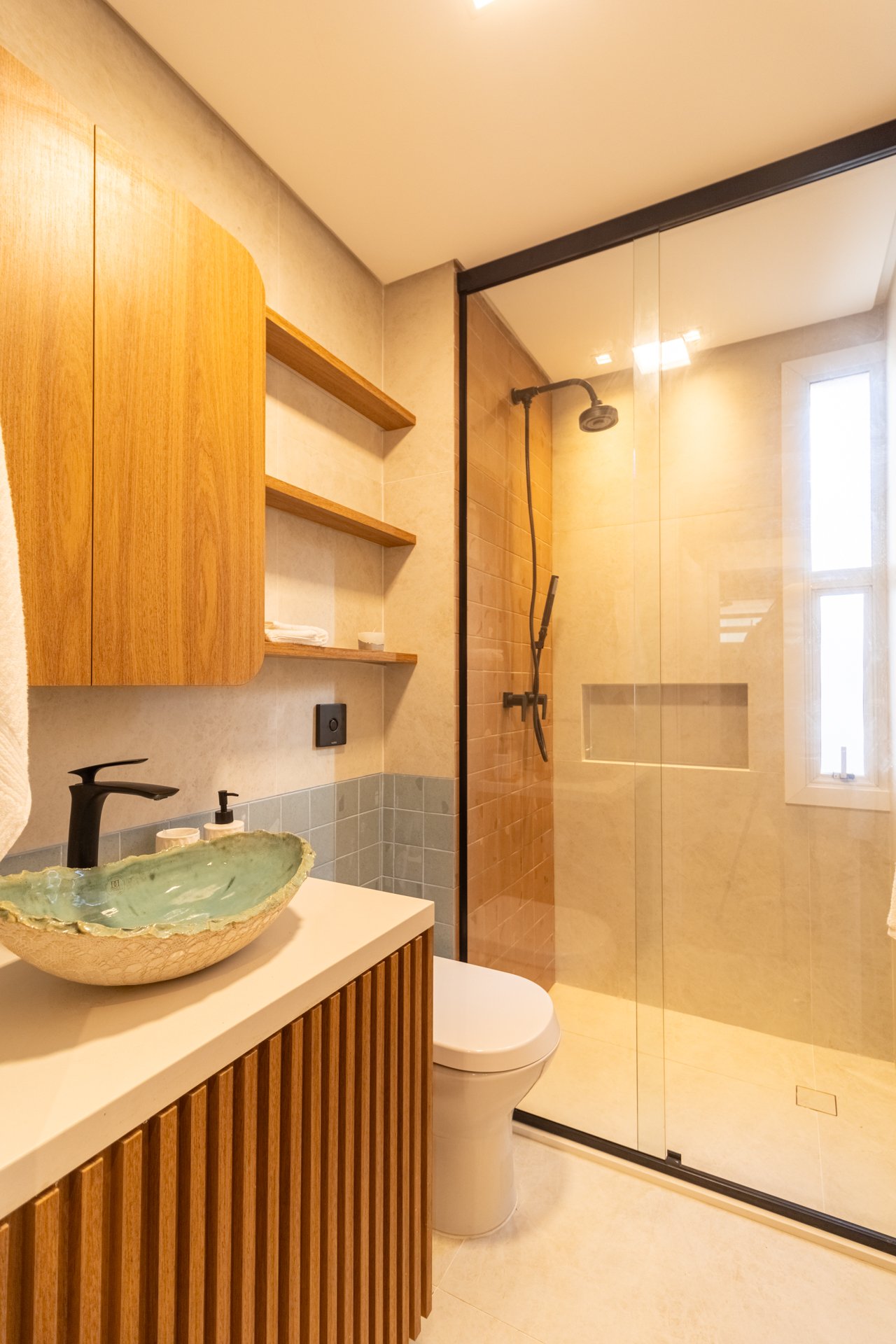 Banheiro Social: Igualmente importante, este espaço foi completamente reformado. Portanto, vazamentos e revestimentos desgastados deram lugar a materiais duráveis e design harmonioso.