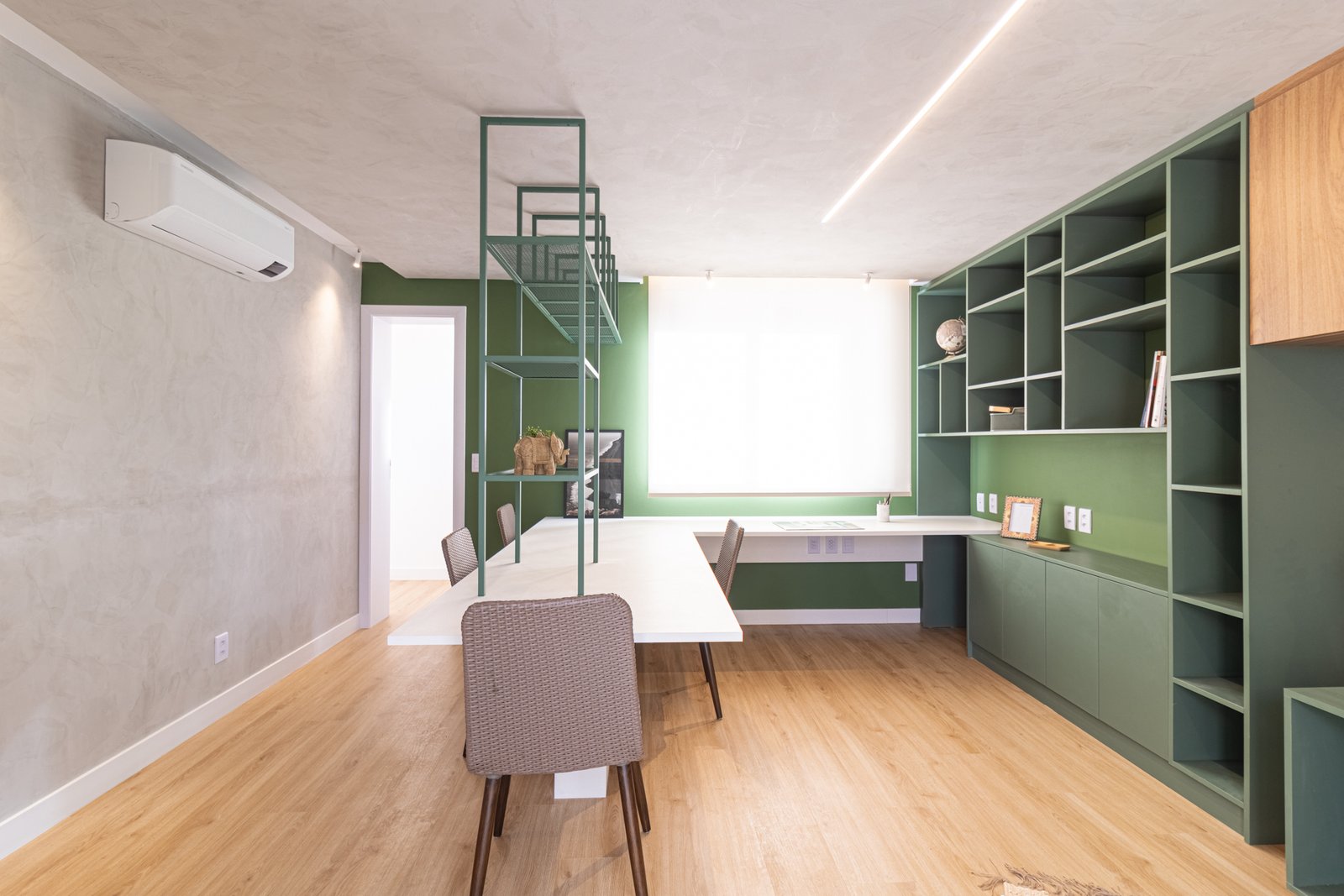 Escritório: Adicionalmente, o ambiente de trabalho ganhou bancada espaçosa e área de café. Portanto, produtividade e relaxamento coexistem harmoniosamente.